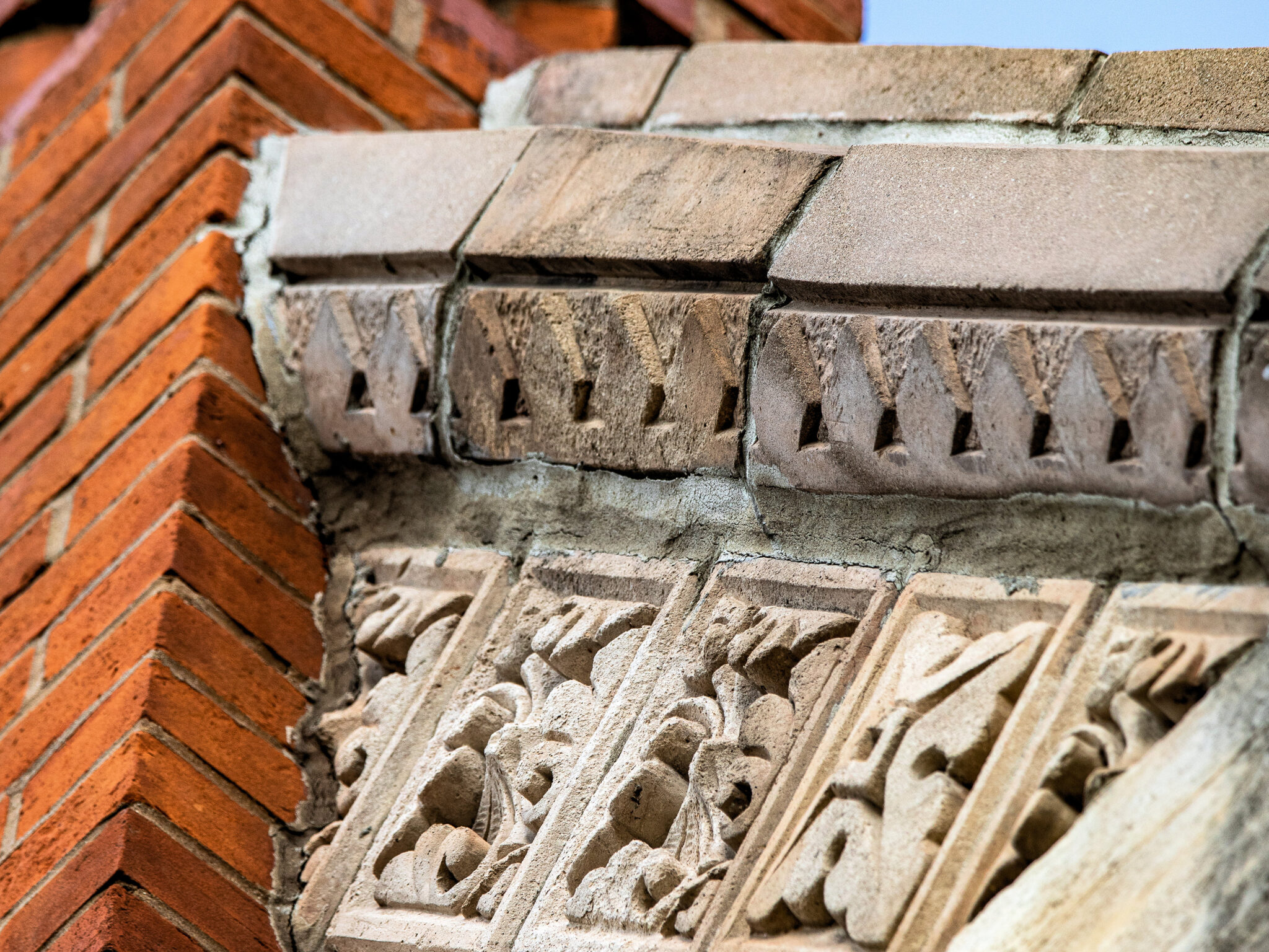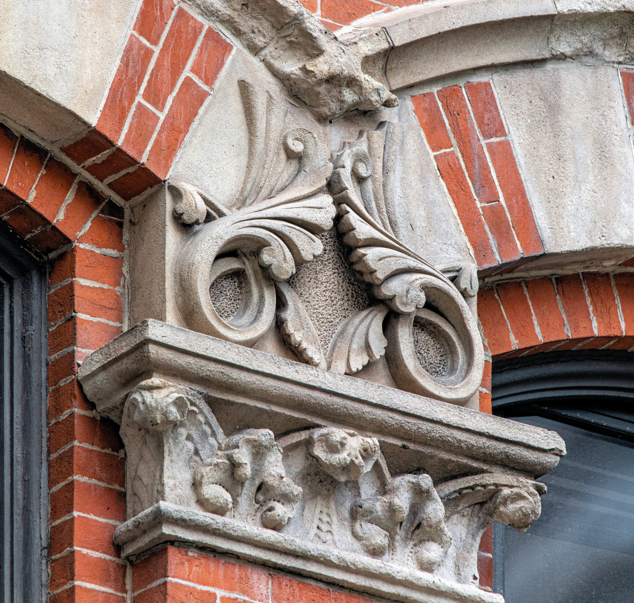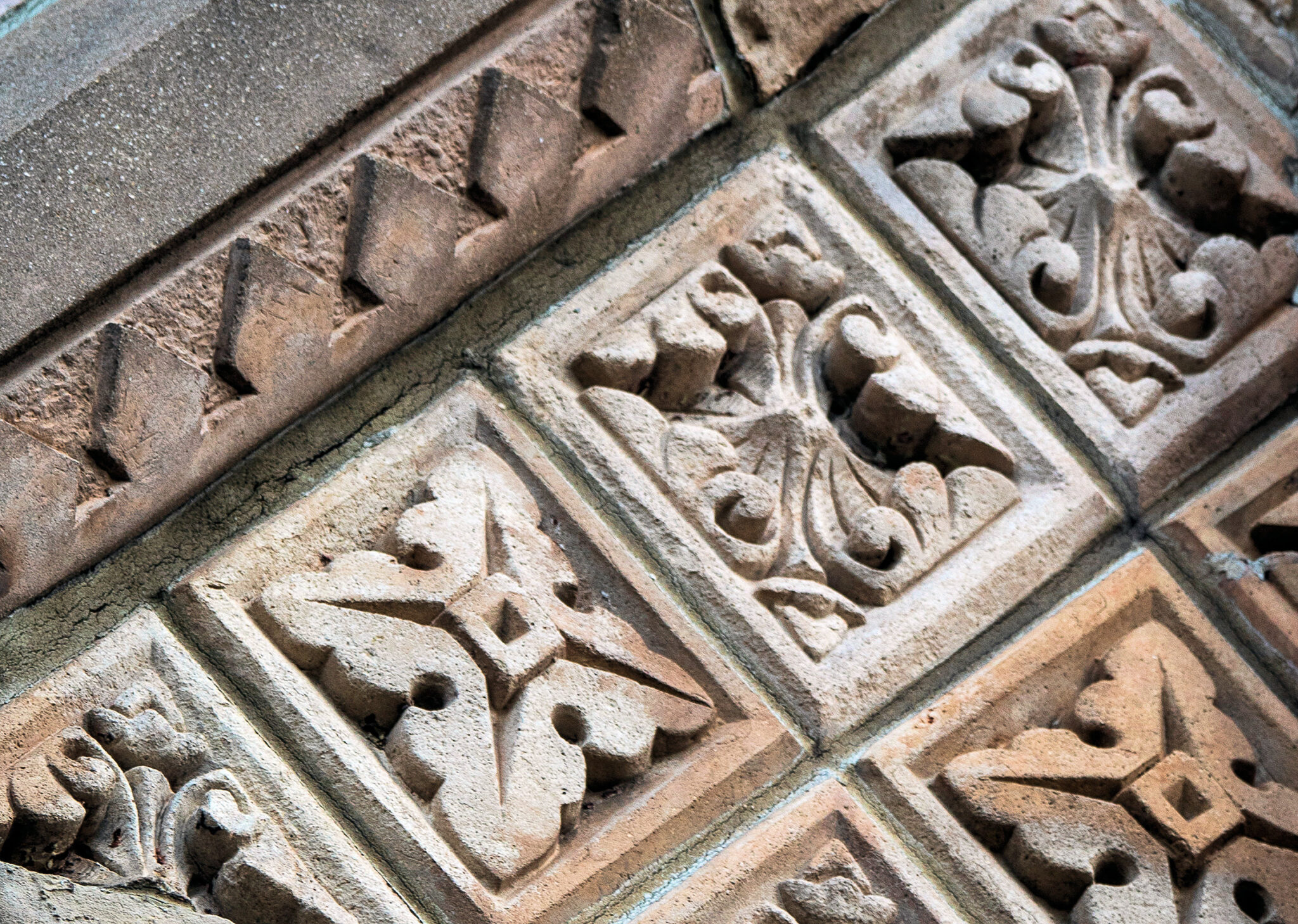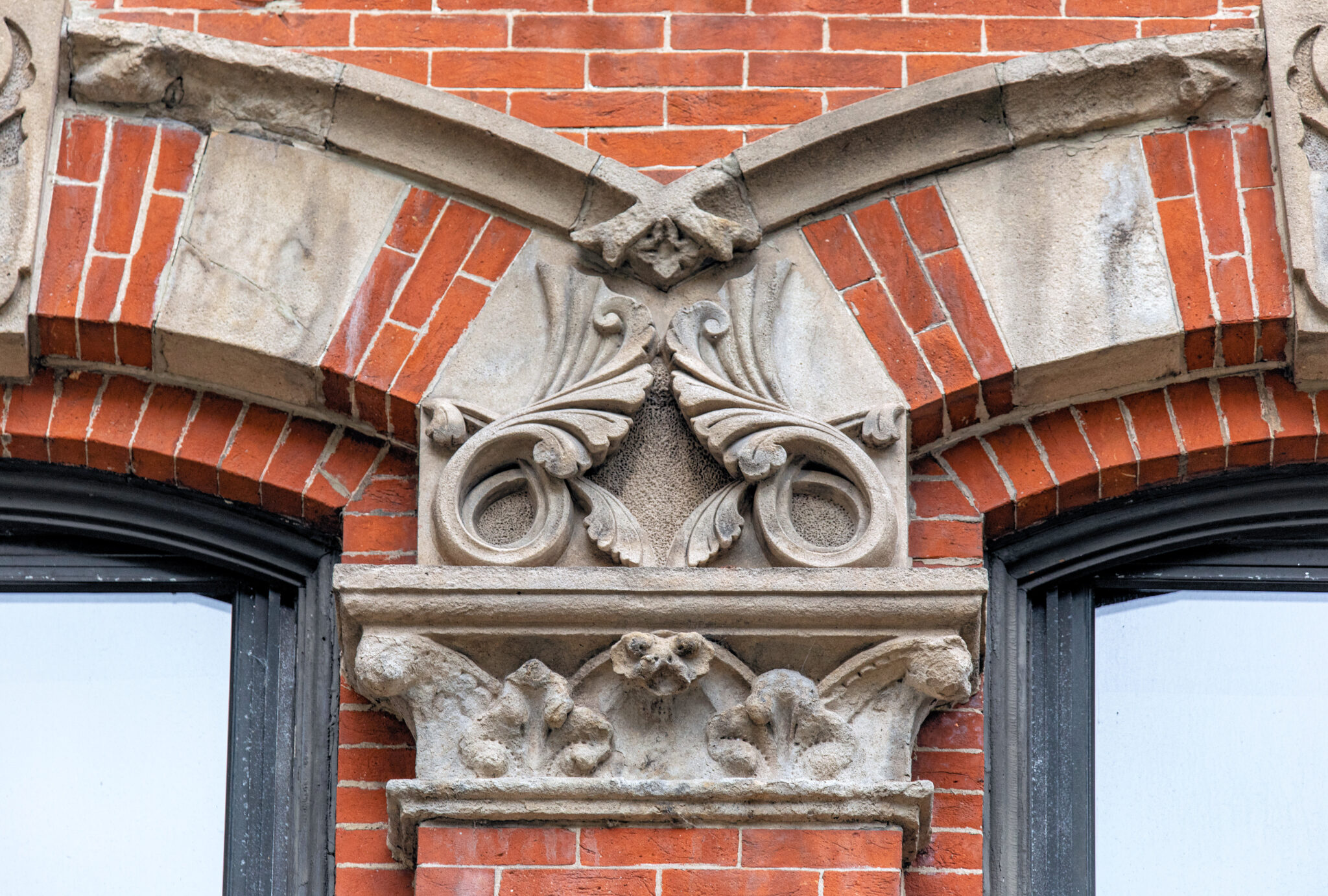 recent detailed photographic images of hand-carved “gray body” terra cotta panels sculpted by isaac elwood scott for the chicago terra cotta company. the custom-designed panels and “stock” terra cotta blocks punctuate the facade of asa lyon’s luther mcconell house (1877) located at 1401 north dearborn street, chicago, il.