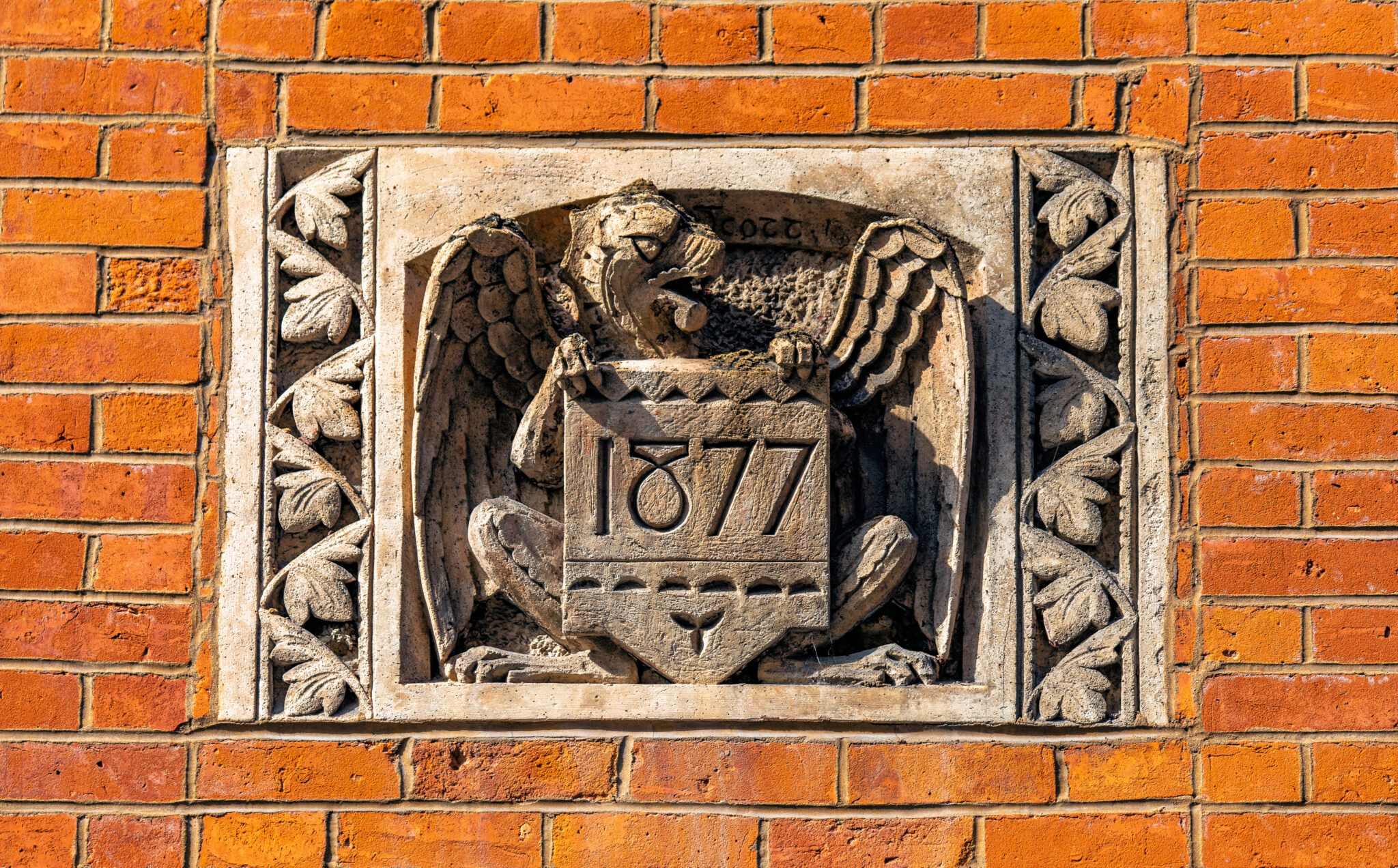 the custom-designed ornament was executed by the chicago terra cotta company, which was founded in 1866, but did not begin operations in chicago until 1868. the company later became the northwestern terra cotta works, with their first factory built in 1881-82 in lakeview.