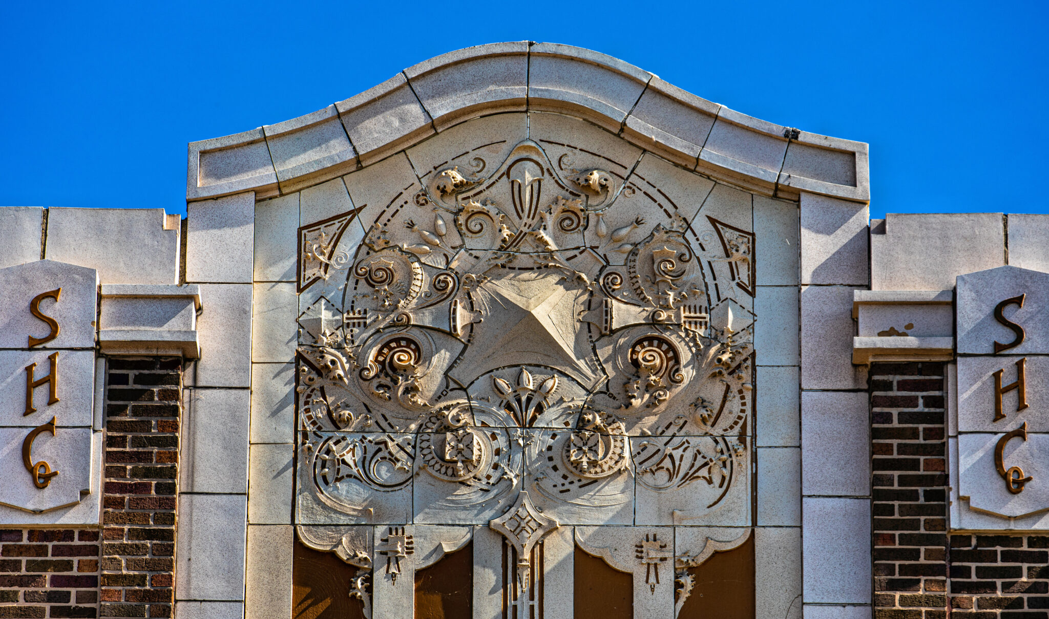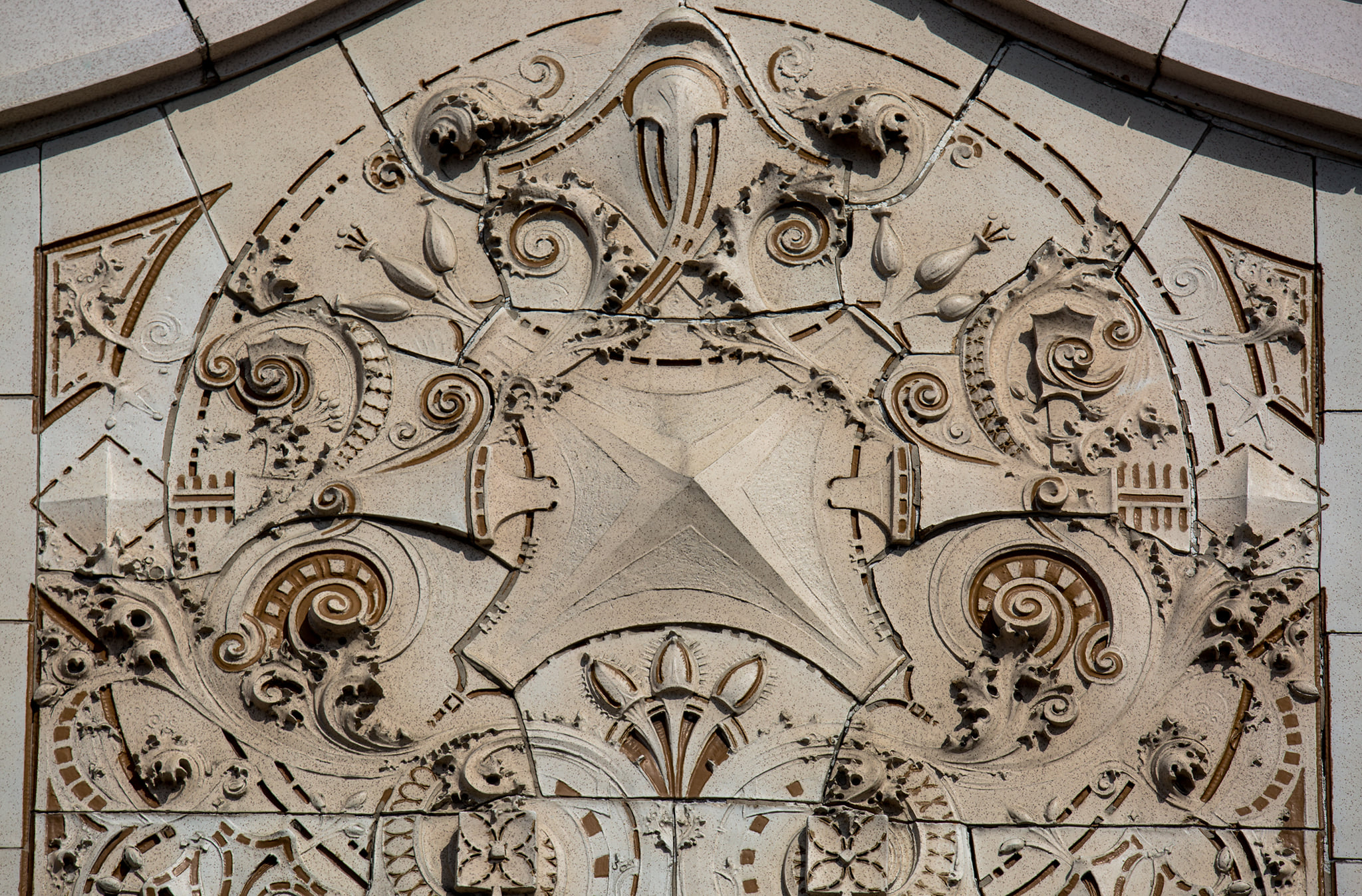the sullivanesque style polychromed glazed terra cotta was likely fabricated by the midland terra cotta company, chicago, il.