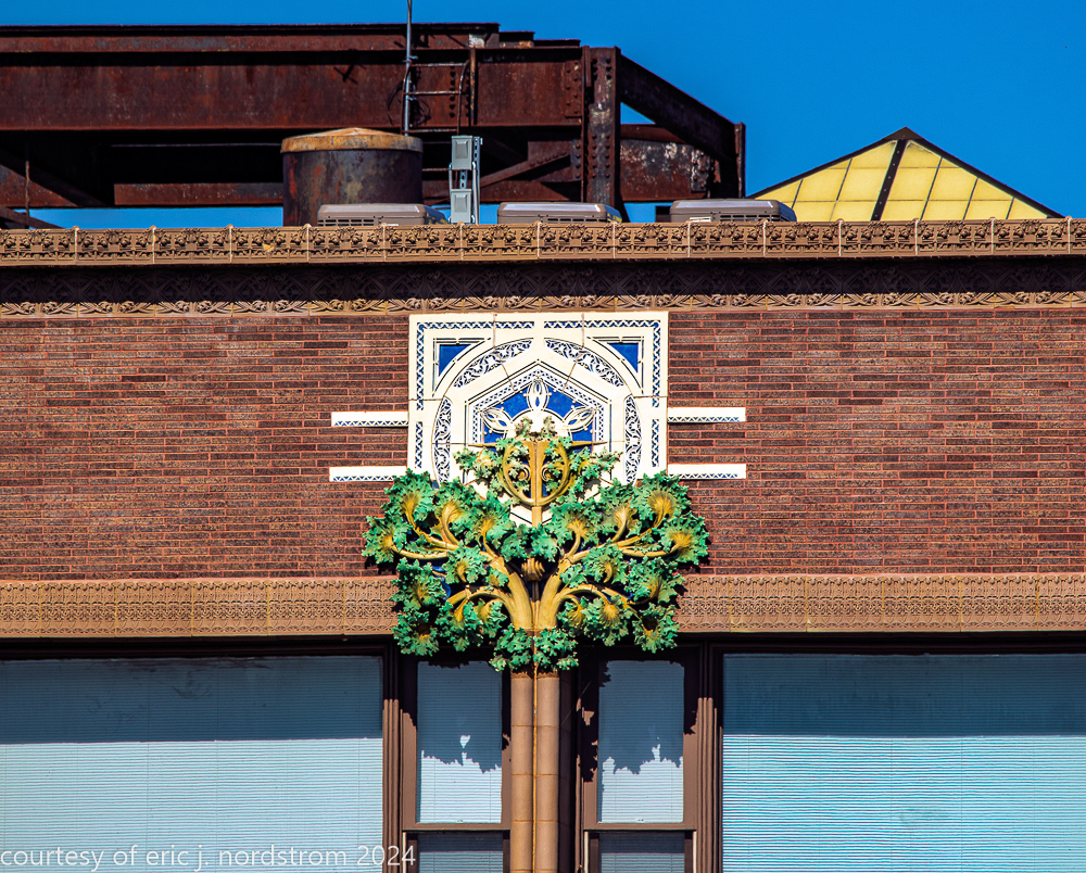 to achieve a rhythmic balance, sullivan designed false dividers on the main facade to make the width of the windows synchronize with the side elevations through the use of terra cotta ornament, beginning with an organic burst springing out above the first floor, extending upwards like a giant stem and then blossoming at the top.