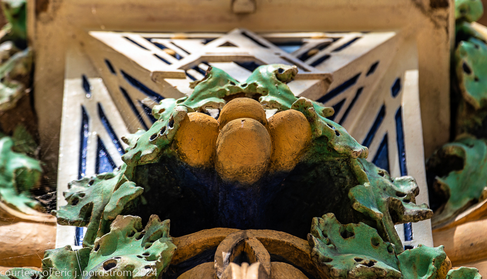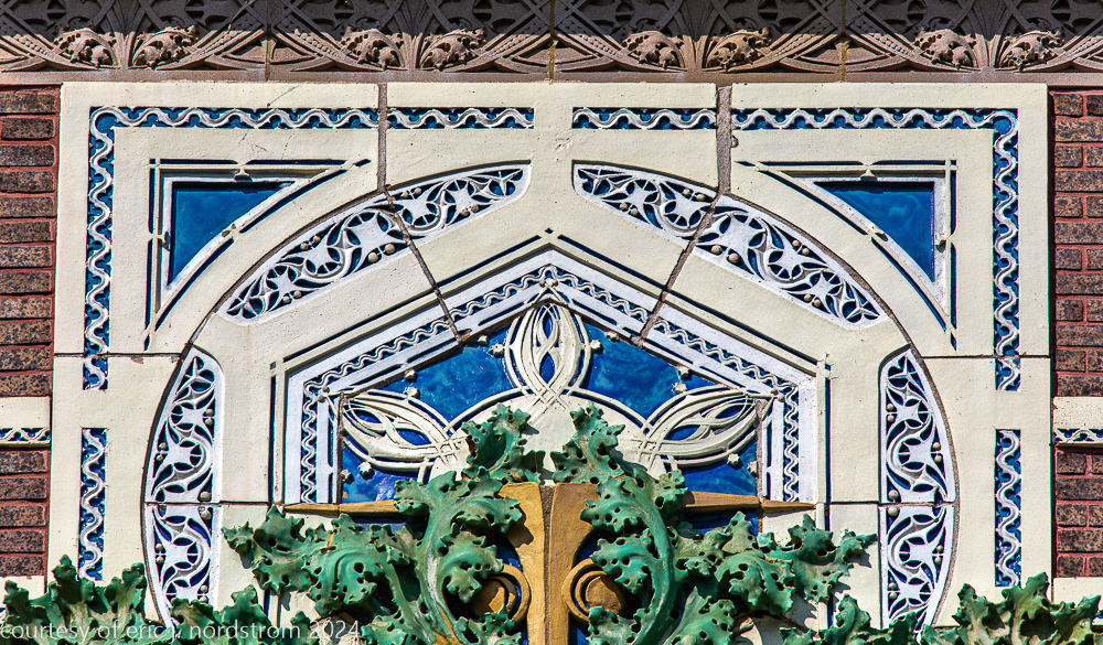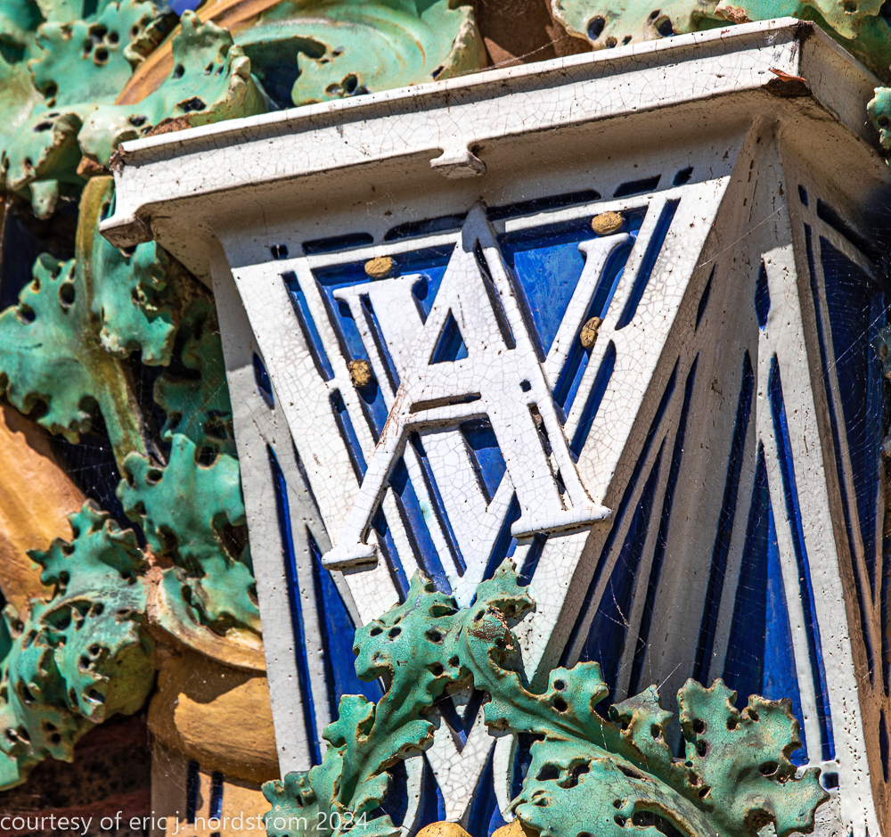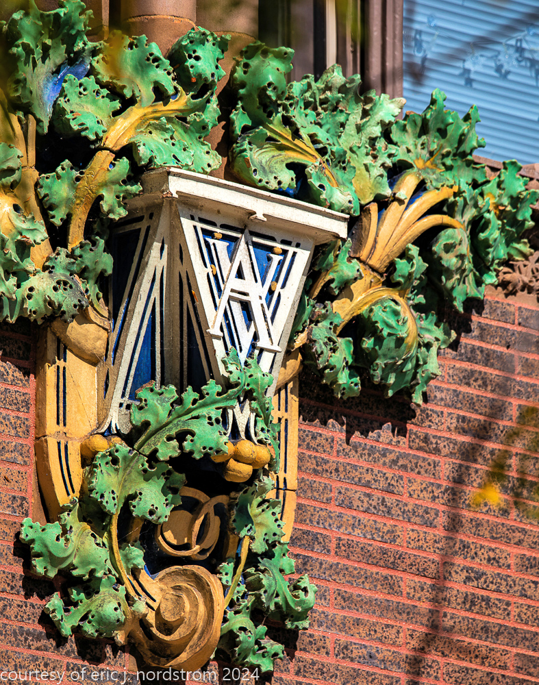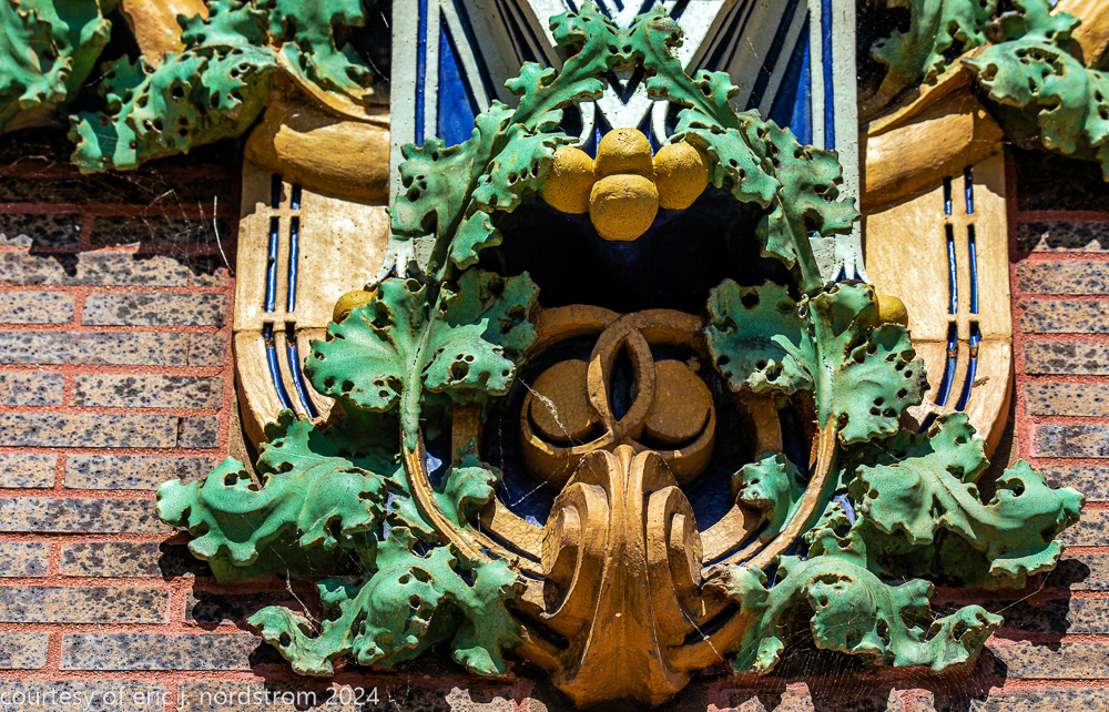 the richly colored polychromed matte finishes were done at a time when the american terra cotta company was experimenting heavily in colors, application techniques, finish, etc. in the case of van allen, the colors were carefully hand-applied versus the less costly and time-consuming spay glaze technique.