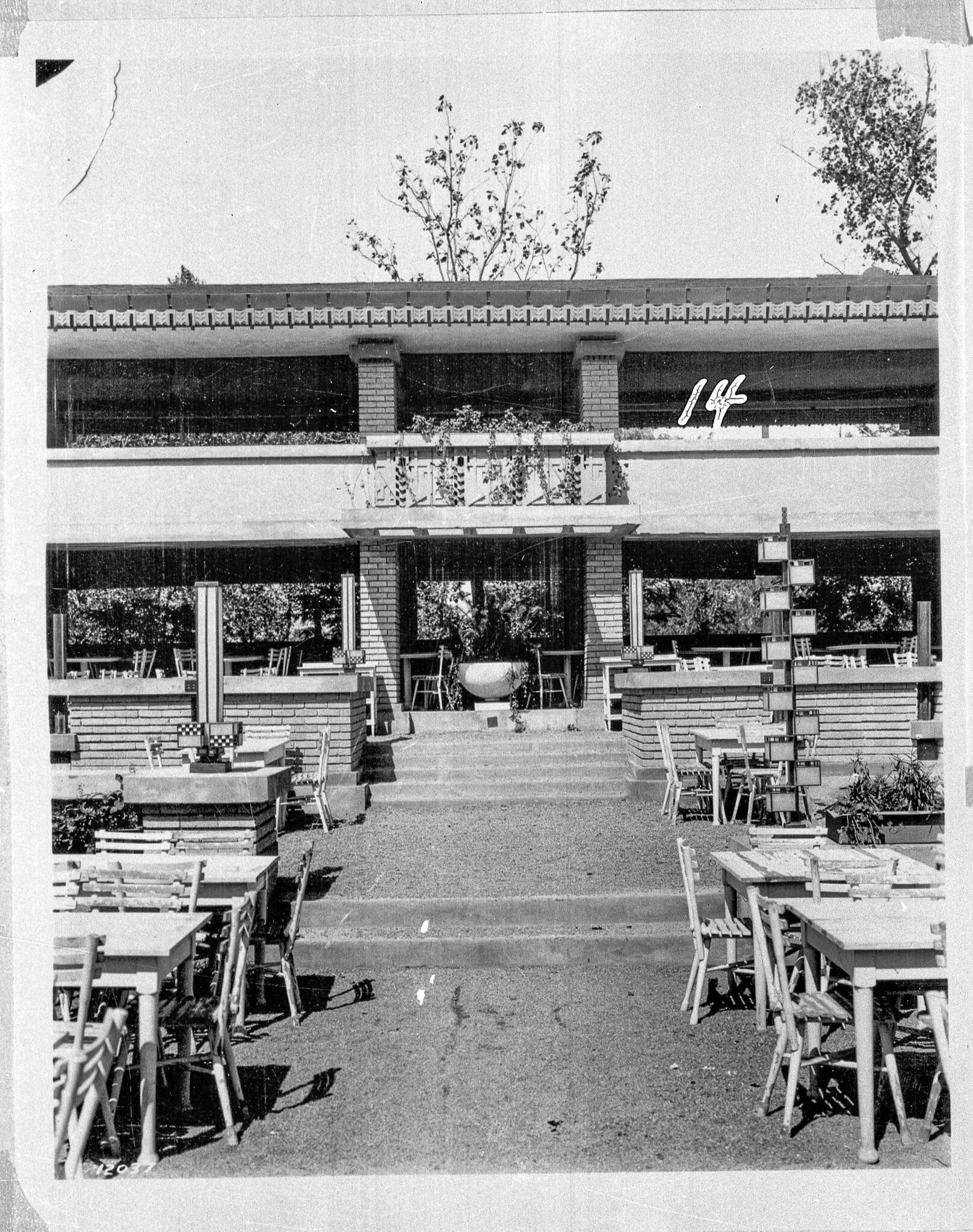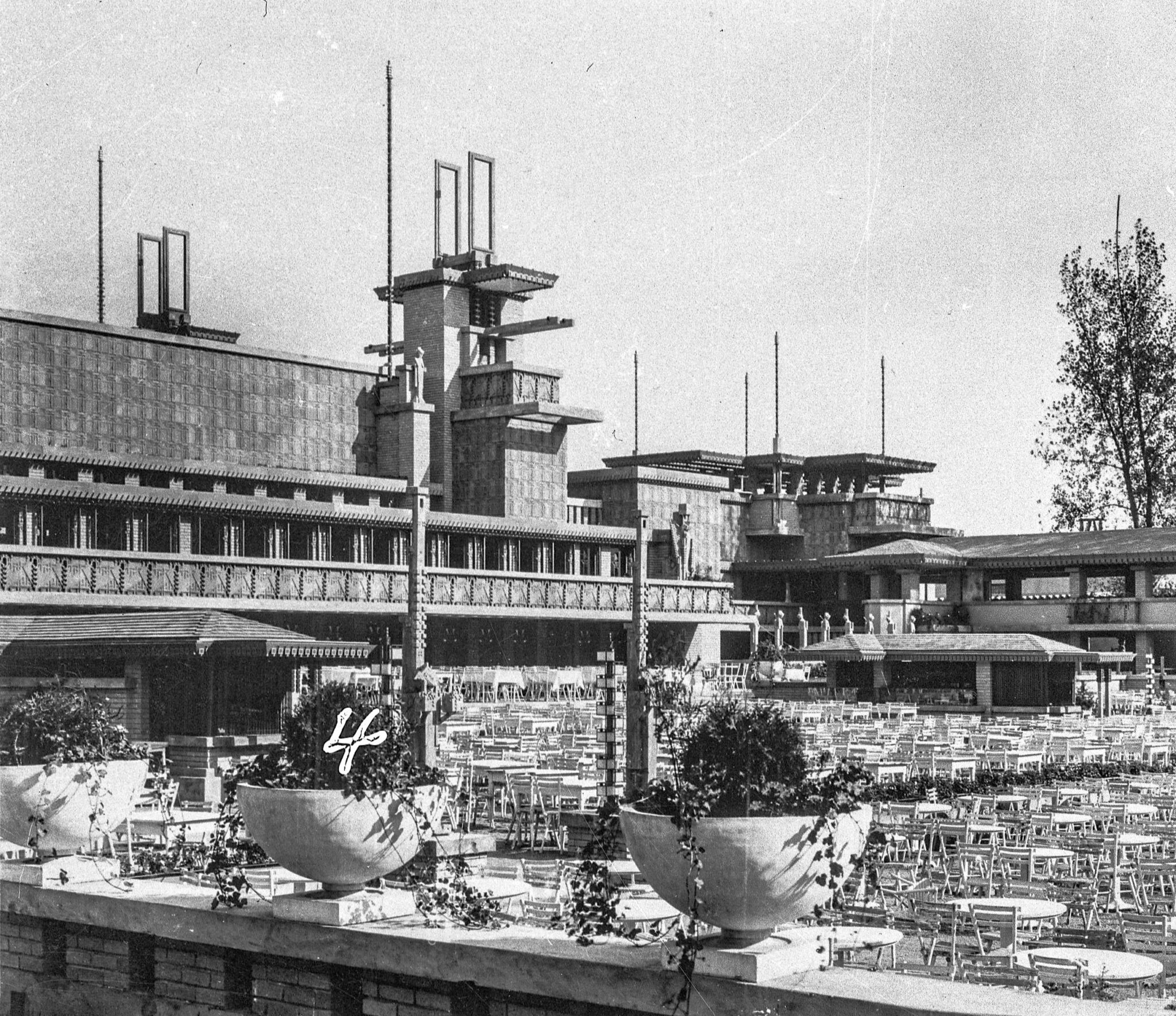 midway gardens was opened on the site of the former sans souci amusement park on the southwest corner of cottage grove avenue and east 60th street. edward c. waller commissioned frank lloyd wright to design and build the gardens in 1914. construction was completed very quickly, and the complex opened in june of 1914. the modernist architecture of the gardens was based on strict geometrical forms designed by wright. a large, open–air central area, filled with tables and chairs, was ringed by a series of three–story buildings with indoor spaces for dancing and other activities, as well as cantilevered balconies with overhanging roofs. there were terraced gardens, pools, and a music pavilion and stage.the building itself was made of yellow brick and patterned concrete block. it featured highly intricate ornament and many geometric sculptures, which frank lloyd wright named “sprites” and were co-designed with alfonso ianelli.