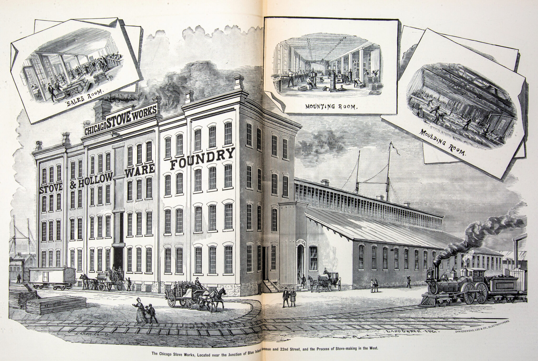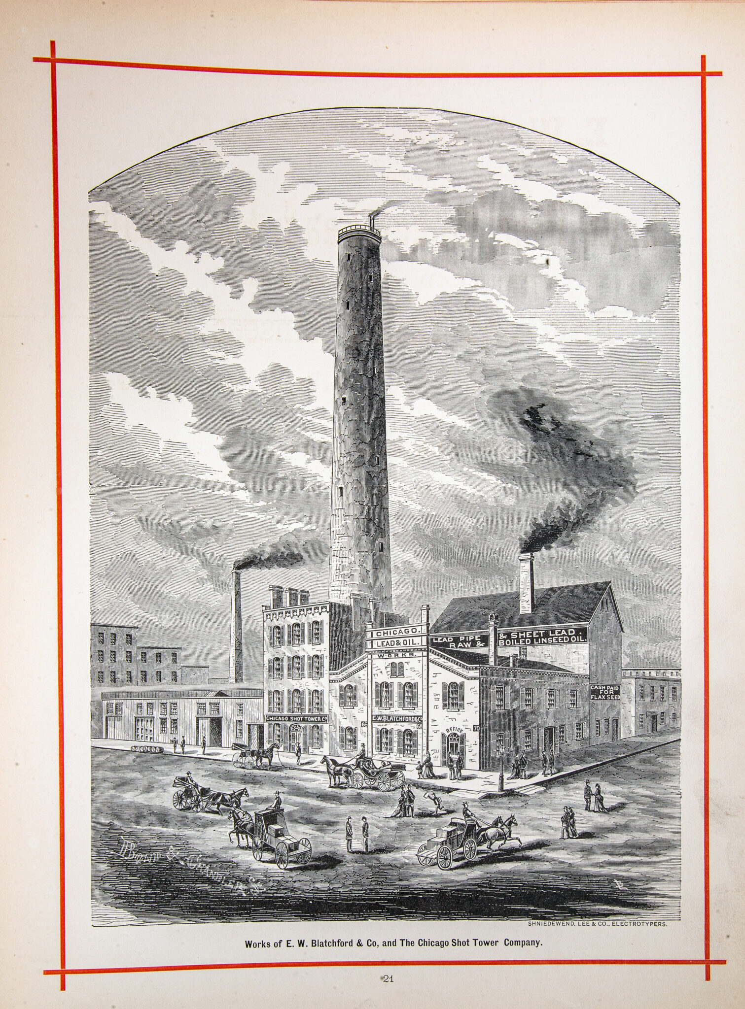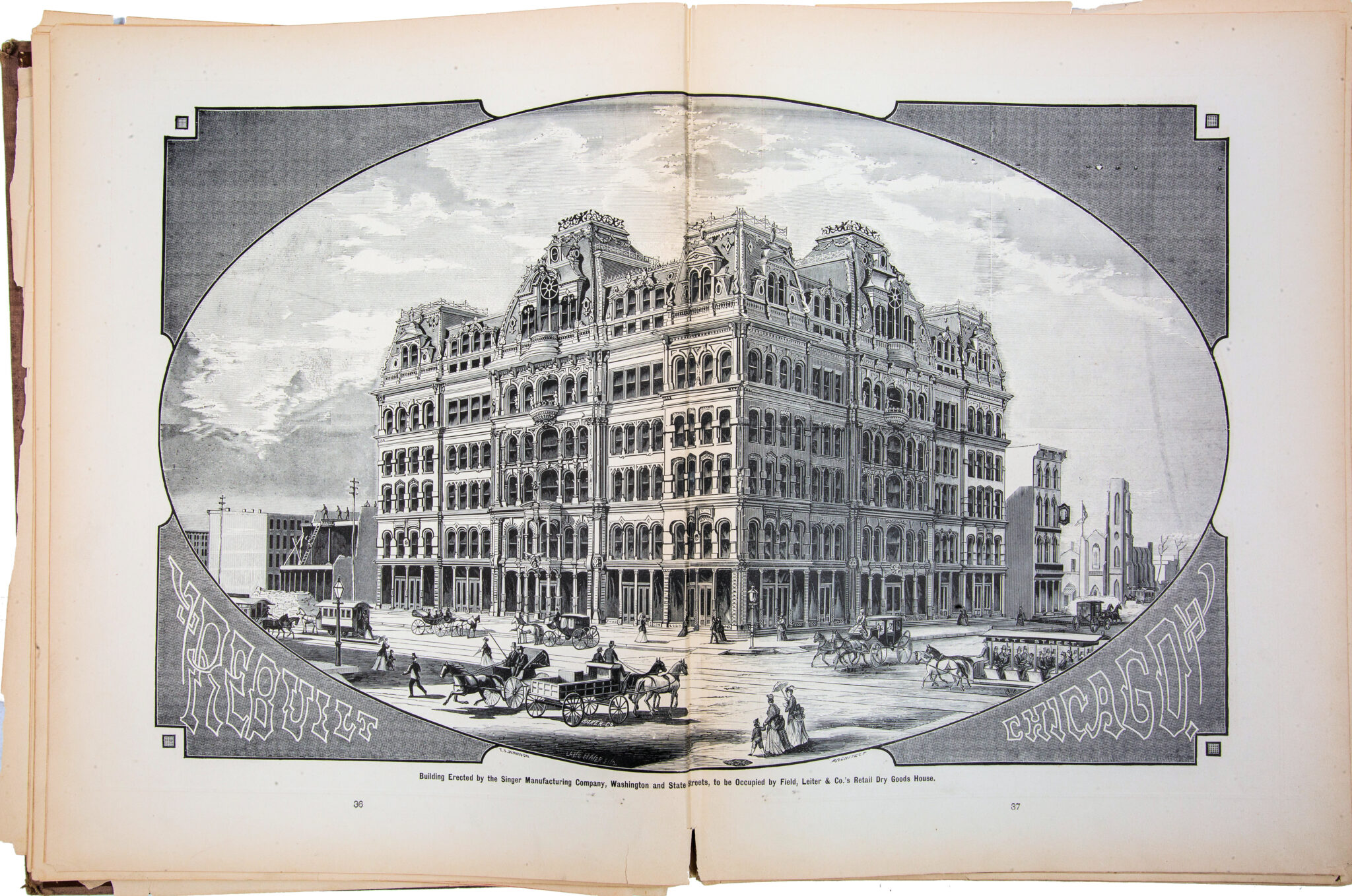 scanned pages (including cover and advertisements) from a recently found and exceptionally rare oversized hardbound book entitled “the merchants and manufacturers of chicago : being a complete history of our mercantile and manufacturing interests, and their progress since the fire : illustrated with upwards of one hundred fine wood engravings, printed with chas. eneu johnson & co.’s fine wood cut ink.”