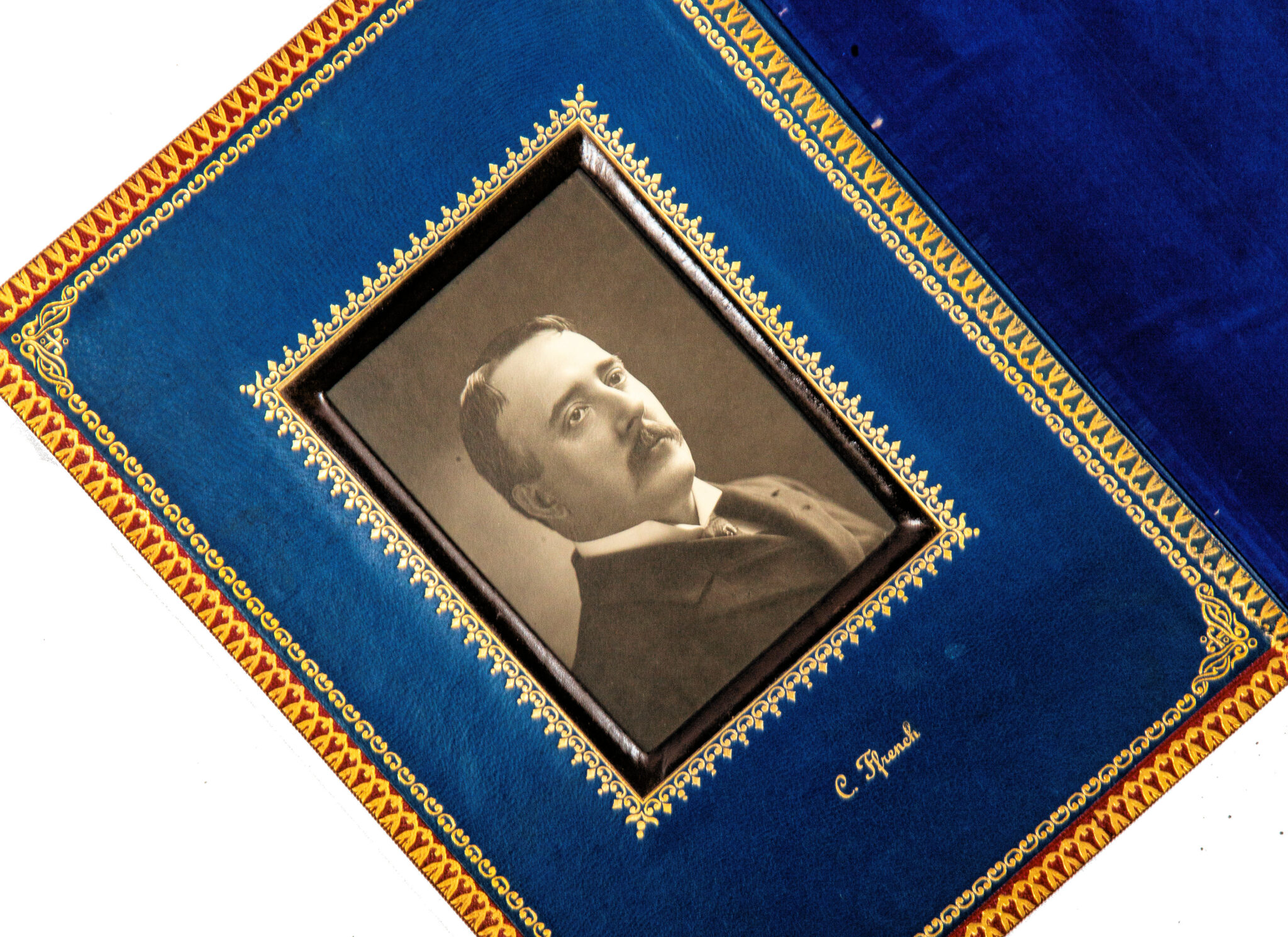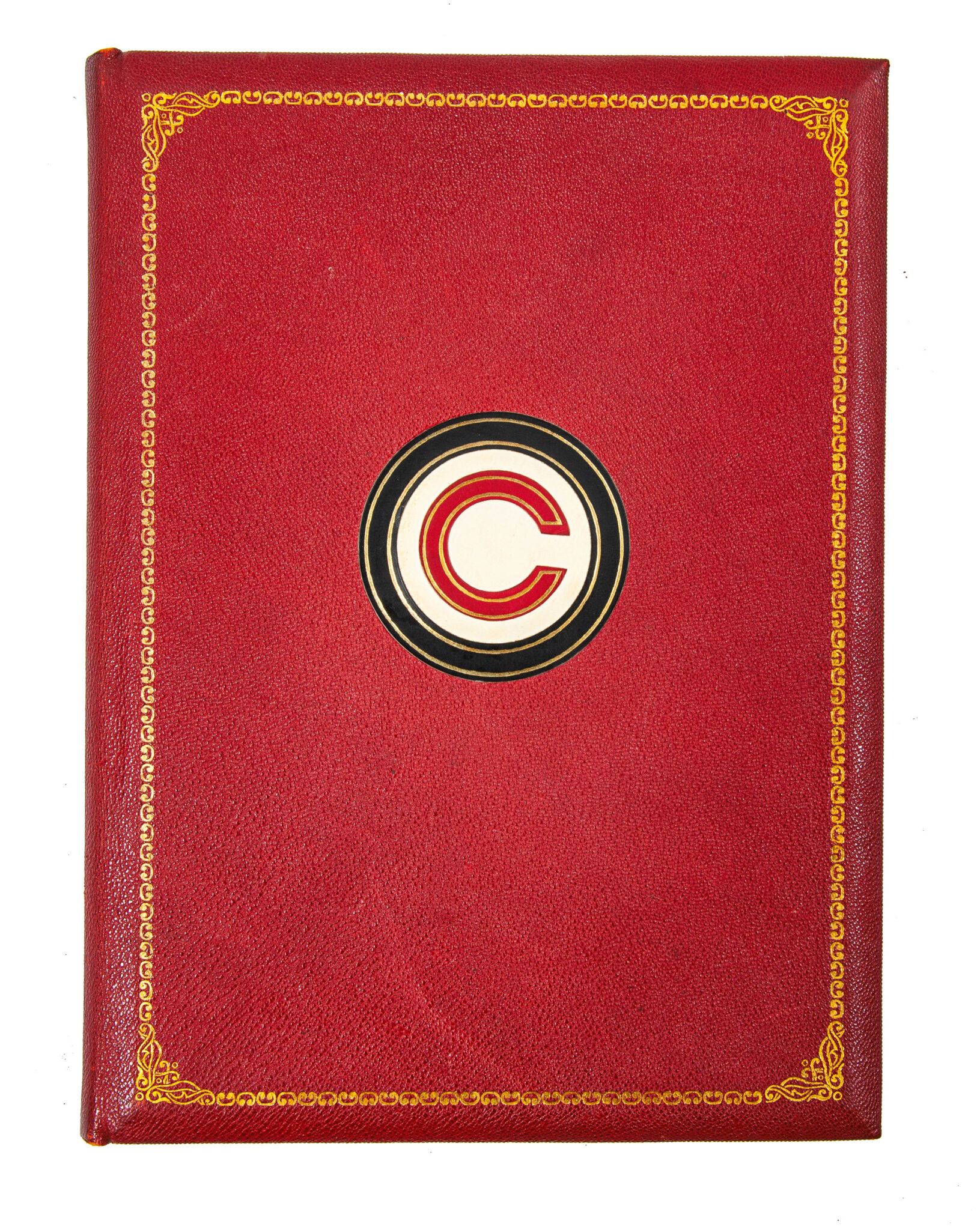 rare 1909 chicago athletic association building “cherry circle” 19th anniversary gilt edge hardbound special issue (given to officers and club members only) with silver gelatin photographic image of club member charles ffrench (president, director, and manager of the iron and steel publishing company) inlaid into book cover board.