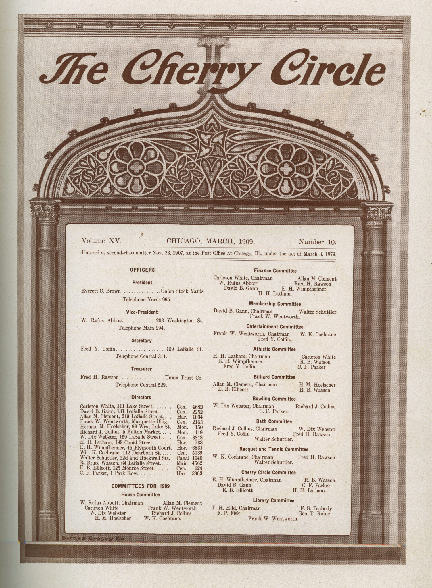the 19th anniversary issue of the cherry circle (the monthly publication of the chicago athletic association) is profusely illustrated, with several halftone images (mainly interior with some exterior) of both henry ives cobb’s 1893 building and schmidt, martin, and garden’s annex as they appeared in 1909.