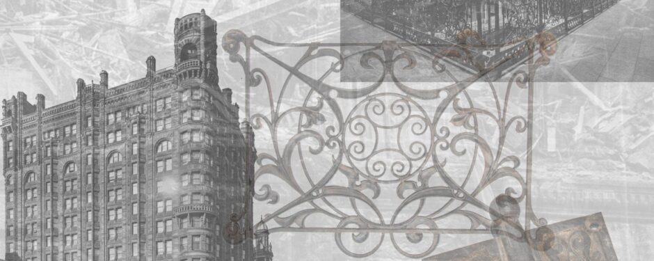 two largely intact ornamental black painted cast iron building atrium grilles and custom-designed yale and towne company interior commerical office door ornamental cast iron hinges and doorknobs retaining original bower-barff “rust-proof” finish from edward townsend mix’s northwestern guaranty loan company building (1890) were added to … Continue reading historically important edward townsend mix-designed architectural ornament from “the met” building joins bldg. 51 museum collection