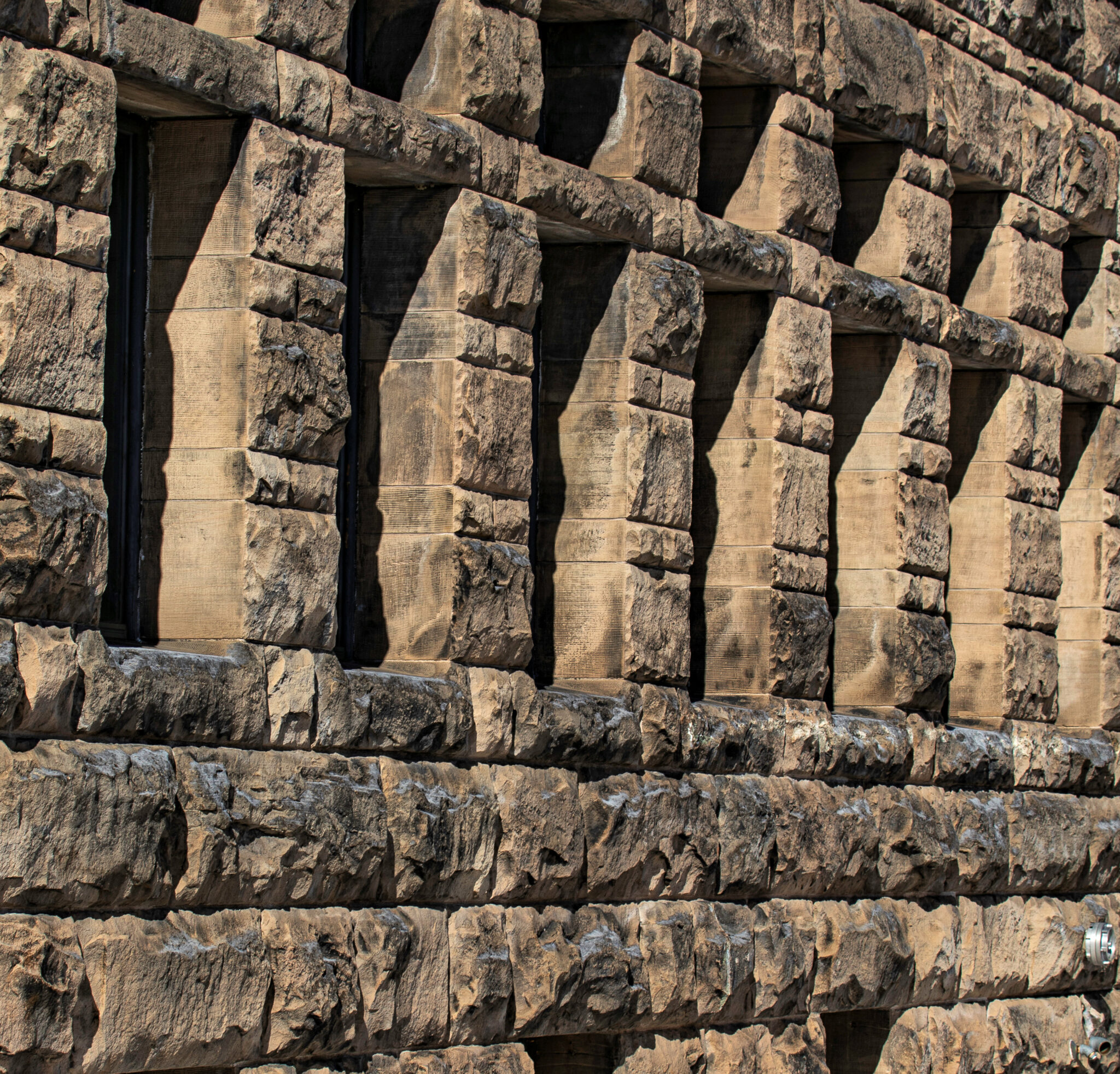 the two-story hipped-roof building with flanking corner towers, is comprised of carved and rusticated dunnville sandstone, quarried from the red cedar river located south of menomonie , wisc.