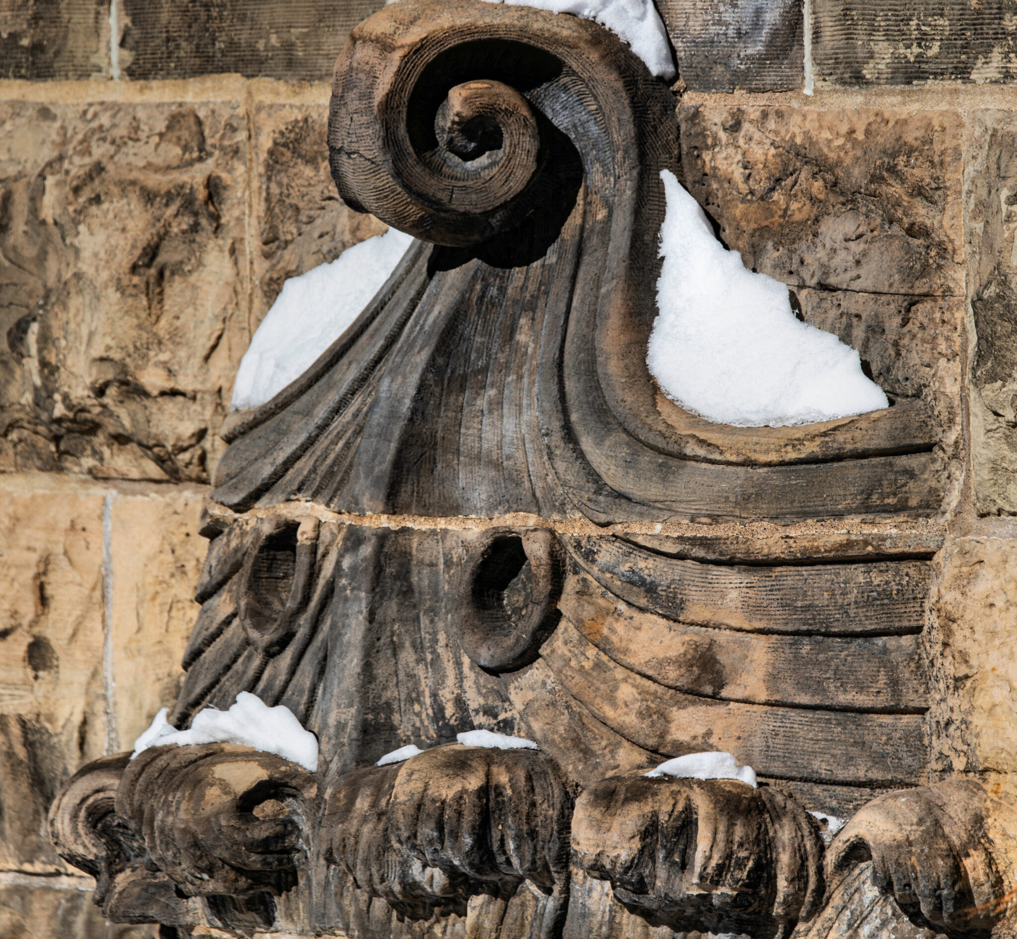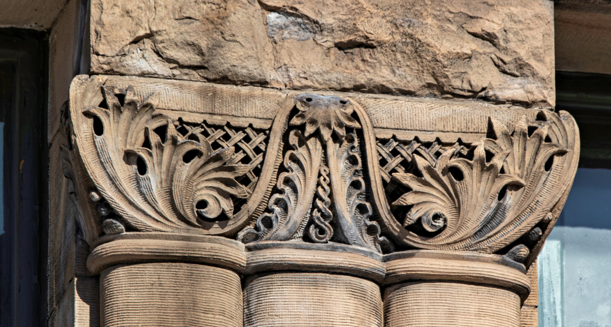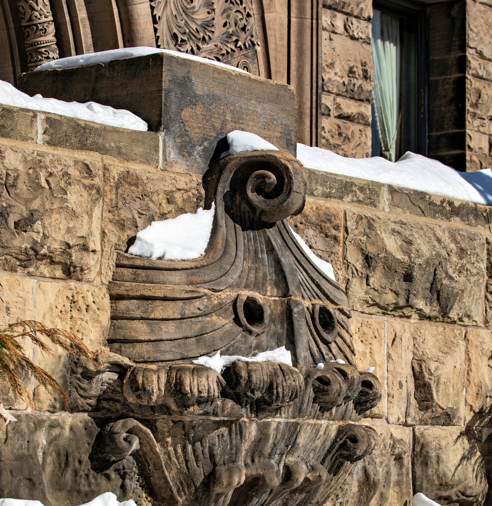 the two-story hipped-roof building with flanking corner towers, is comprised of carved and rusticated dunnville sandstone, quarried from the red cedar river located south of menomonie , wisc.
