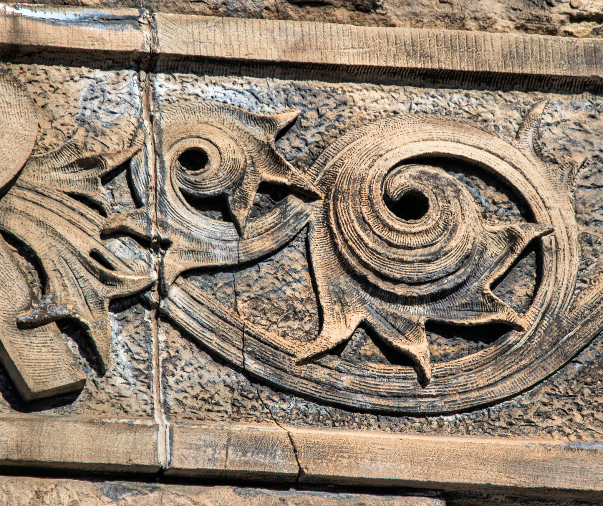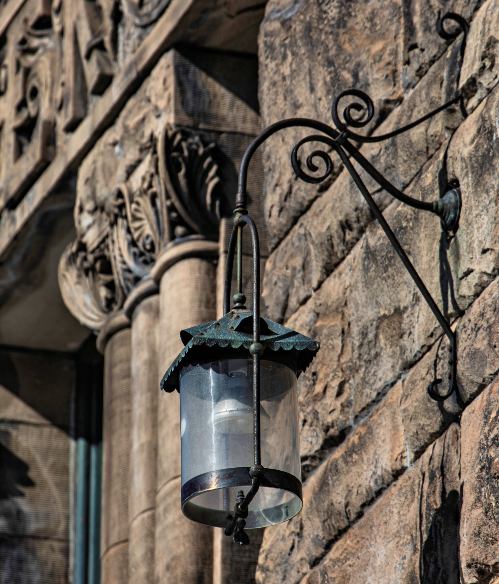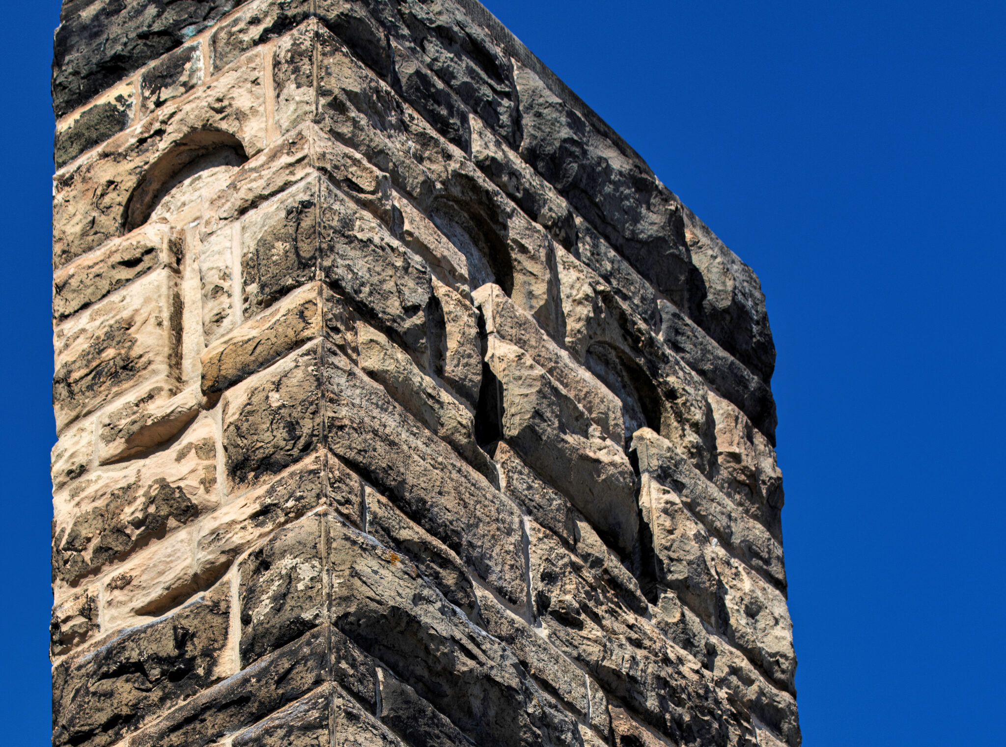 the two-story hipped-roof building with flanking corner towers, is comprised of carved and rusticated dunnville sandstone, quarried from the red cedar river located south of menomonie , wisc.