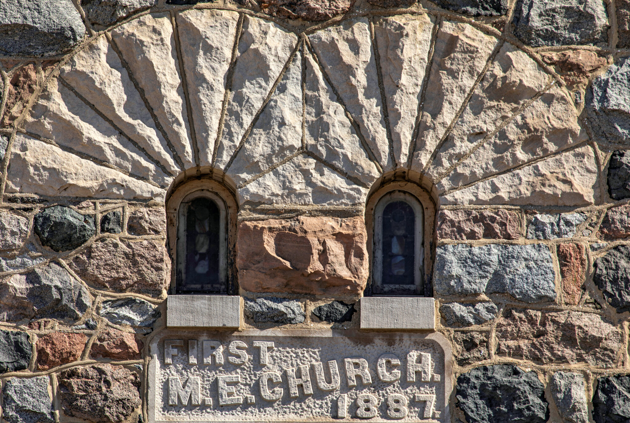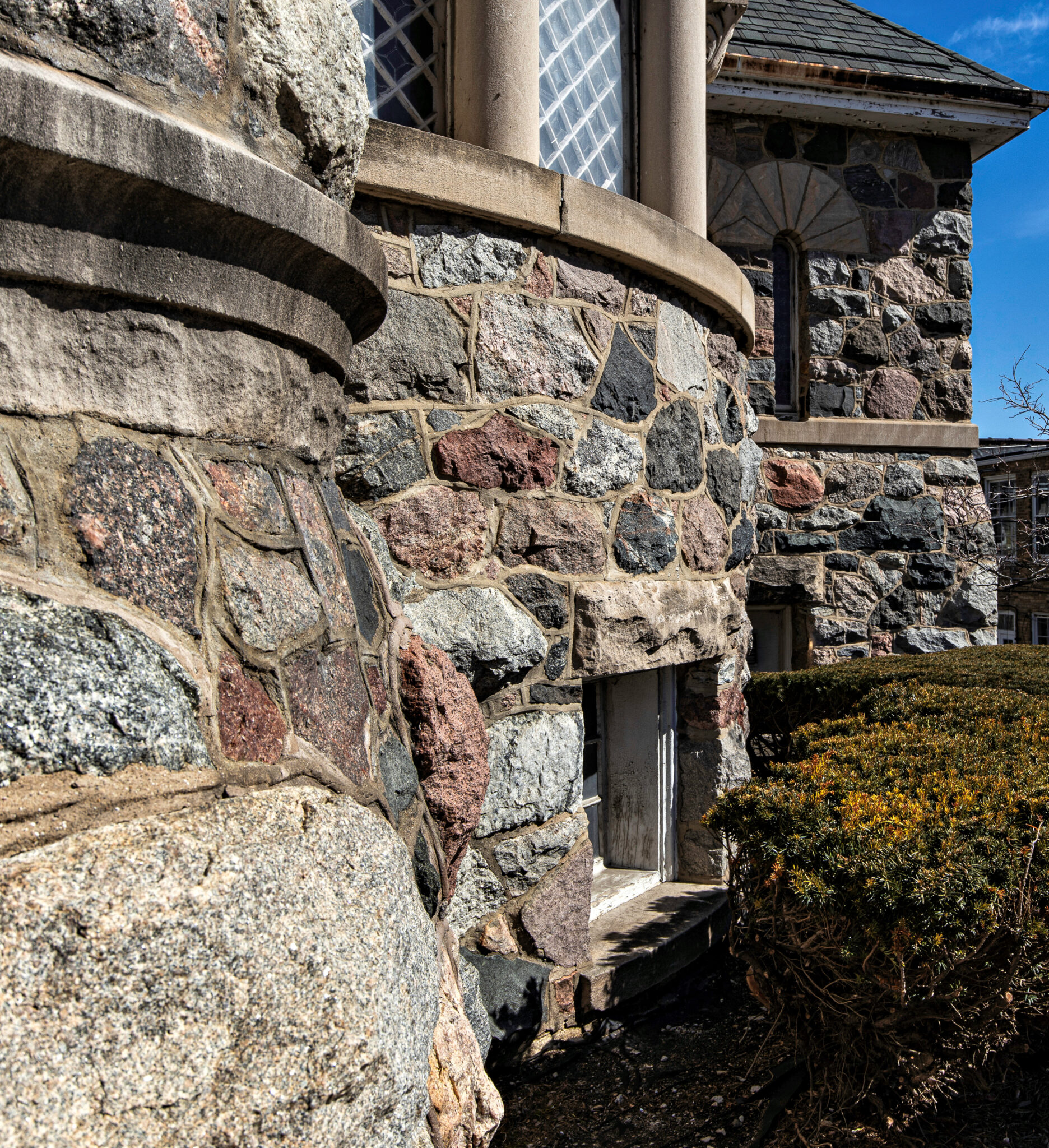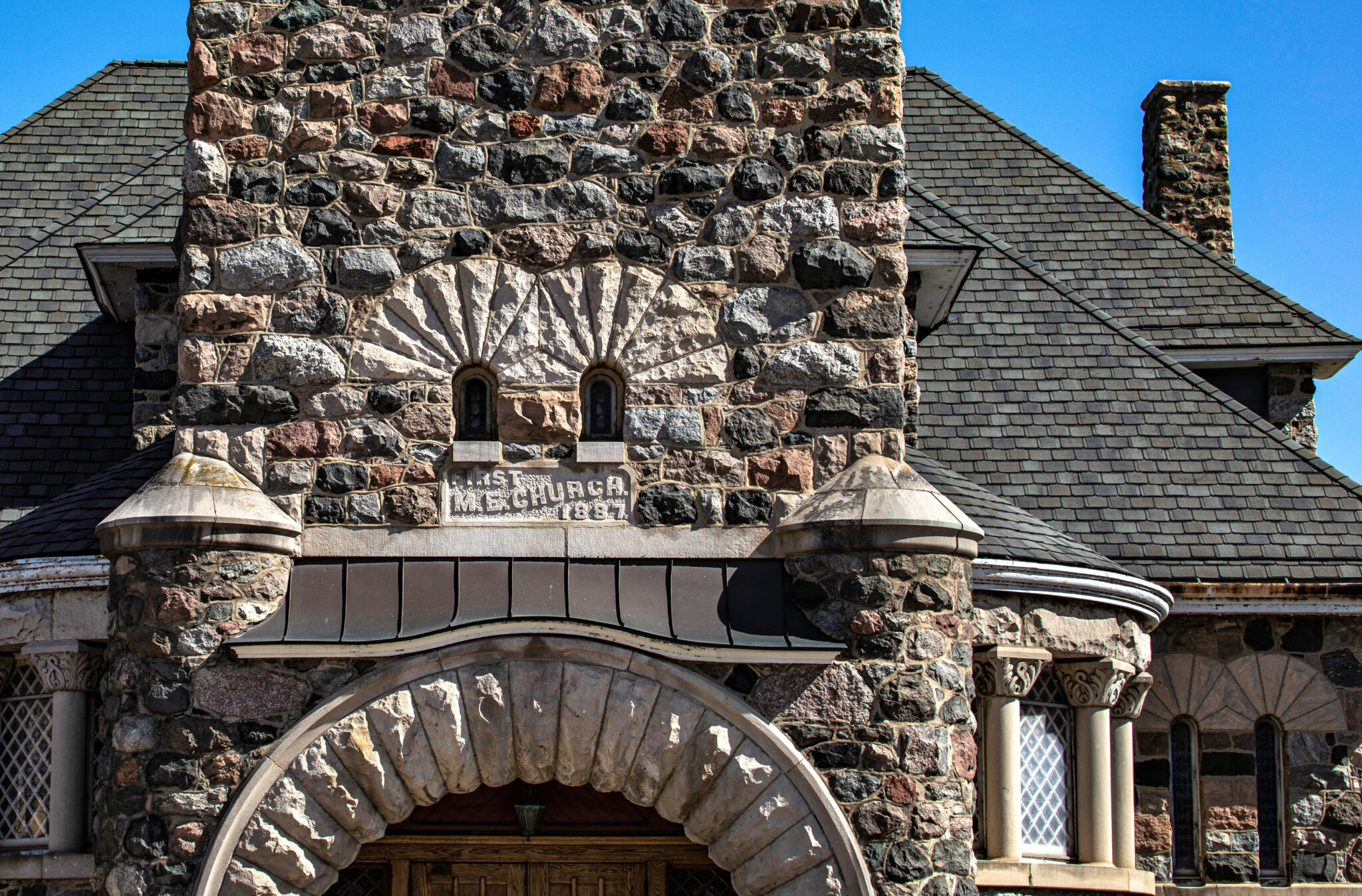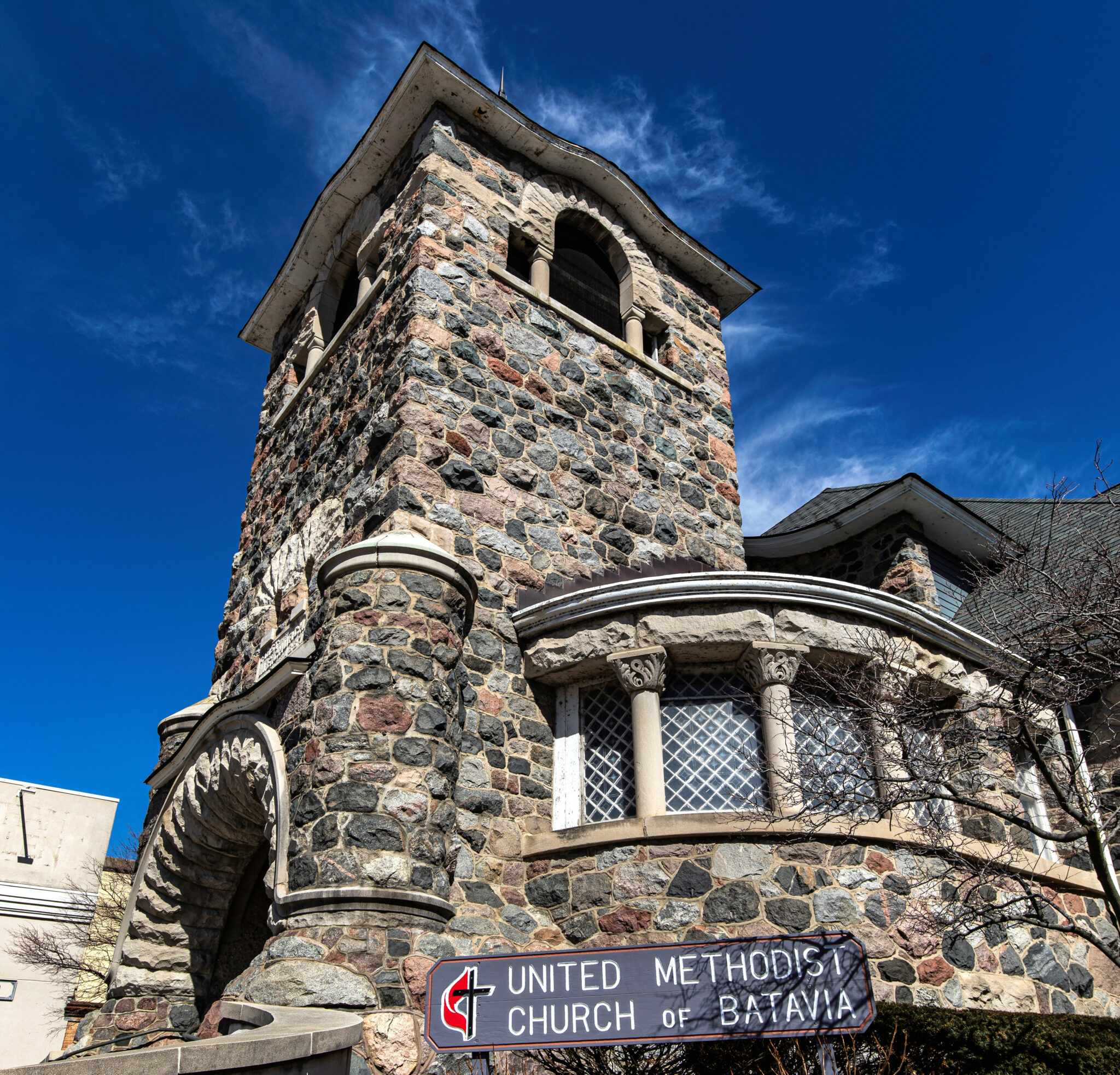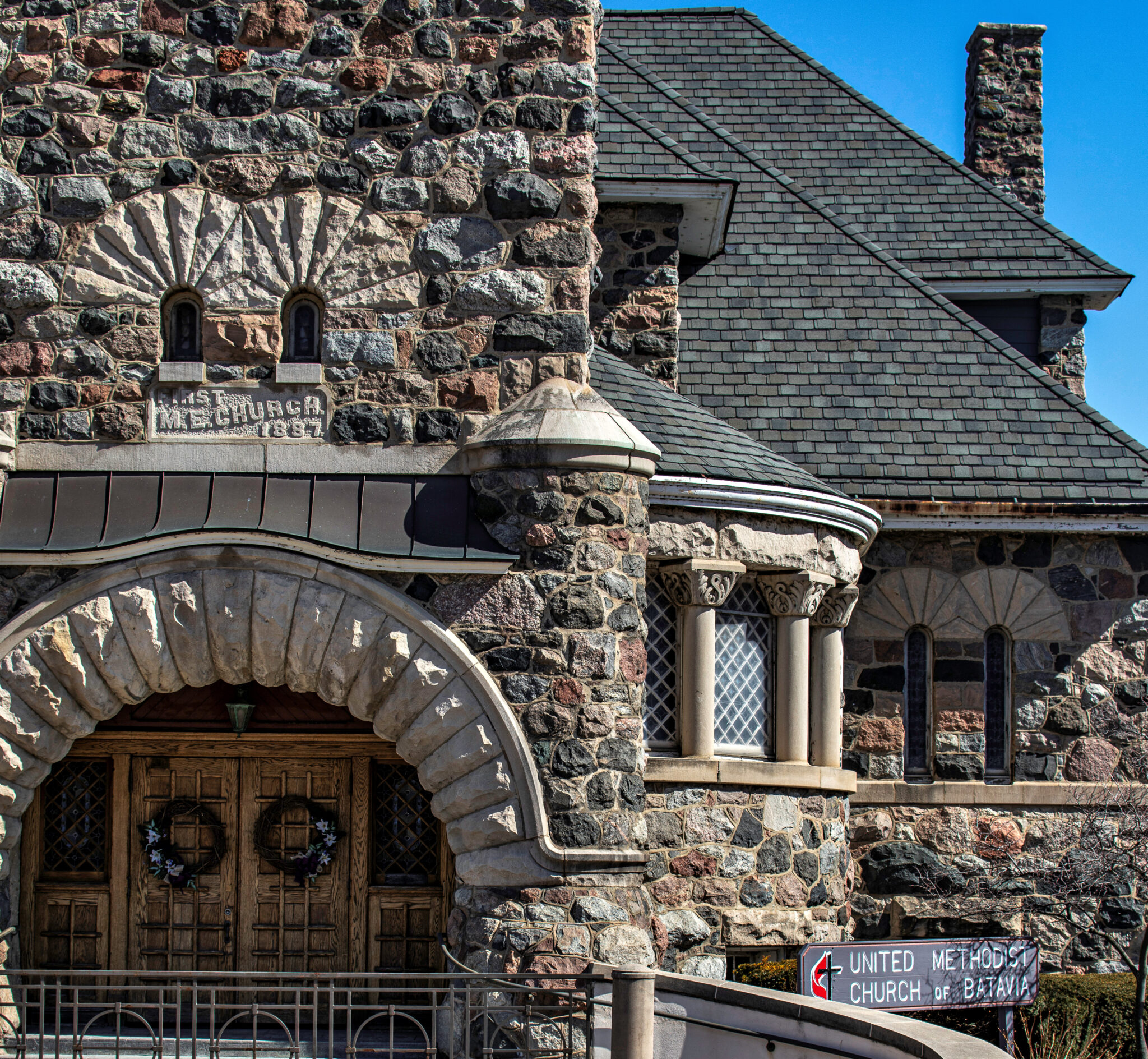 detailed photographic survey of solon spencer beman’s first methodist church of batavia, located at 8 north batavia avenue, batavia, il. the richardsonian romanesque style church’s exterior is comprised of multi-coloed rough-faced stones or boulders, harvested from local building contractor i.s. stephens’s mill creek farm in batavia.