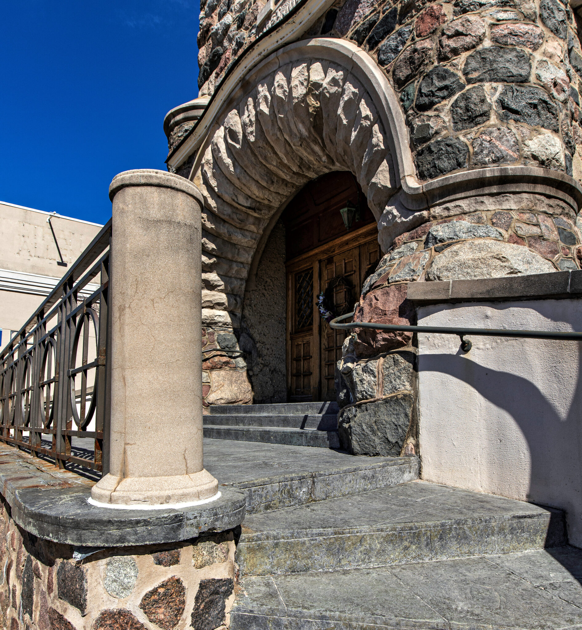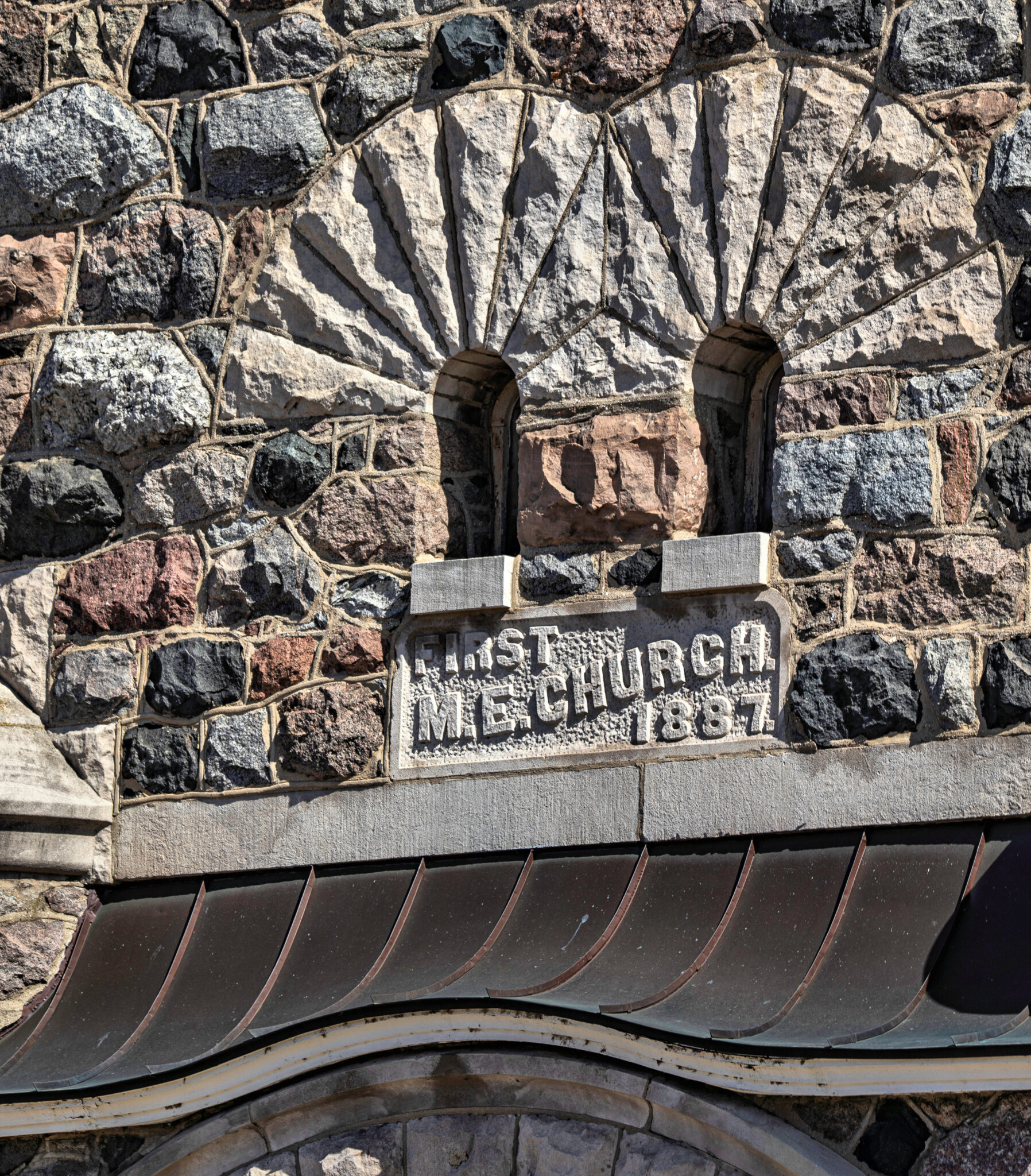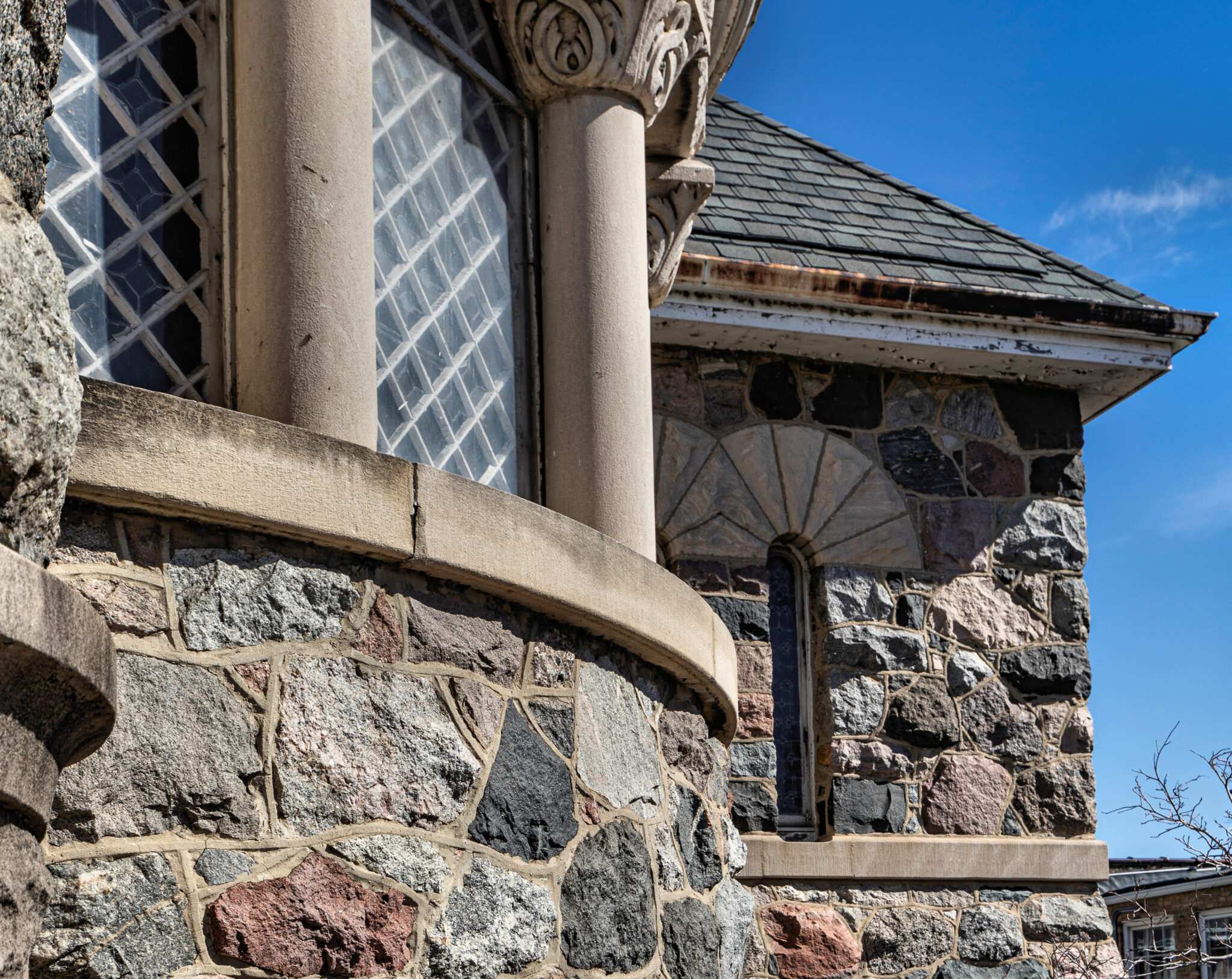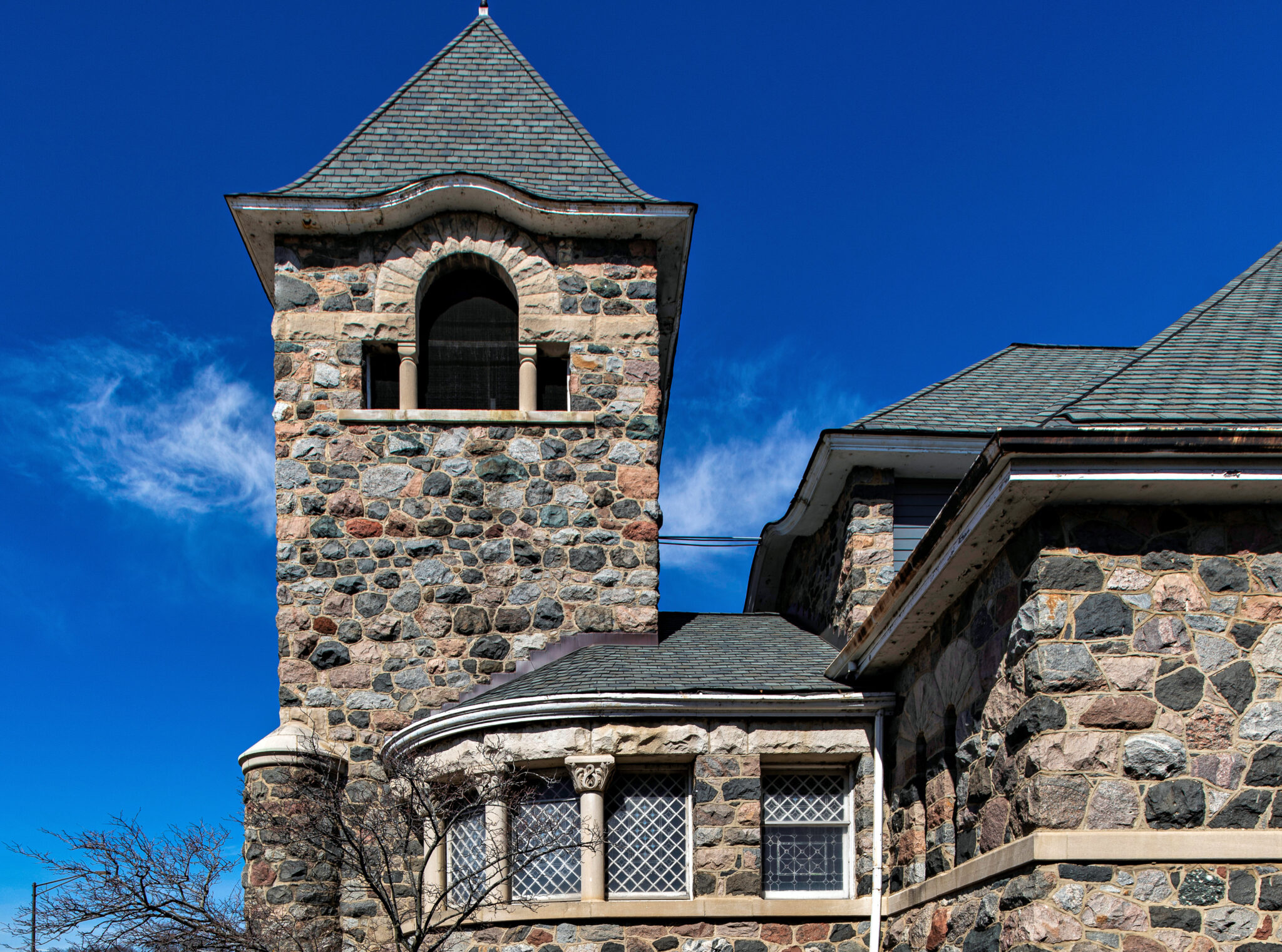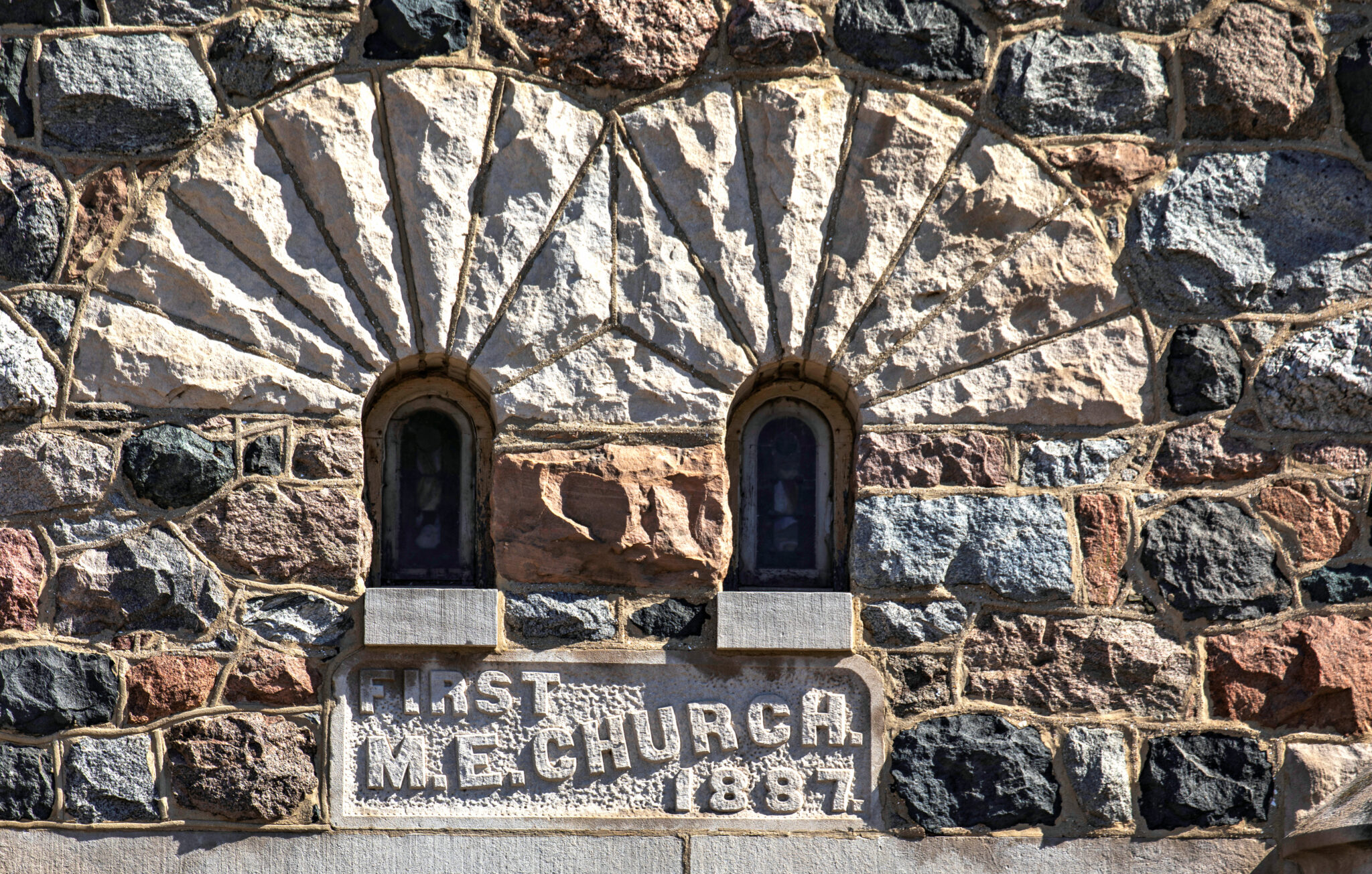 detailed photographic survey of solon spencer beman’s first methodist church of batavia, located at 8 north batavia avenue, batavia, il. the richardsonian romanesque style church’s exterior is comprised of multi-coloed rough-faced stones or boulders, harvested from local building contractor i.s. stephens’s mill creek farm in batavia.