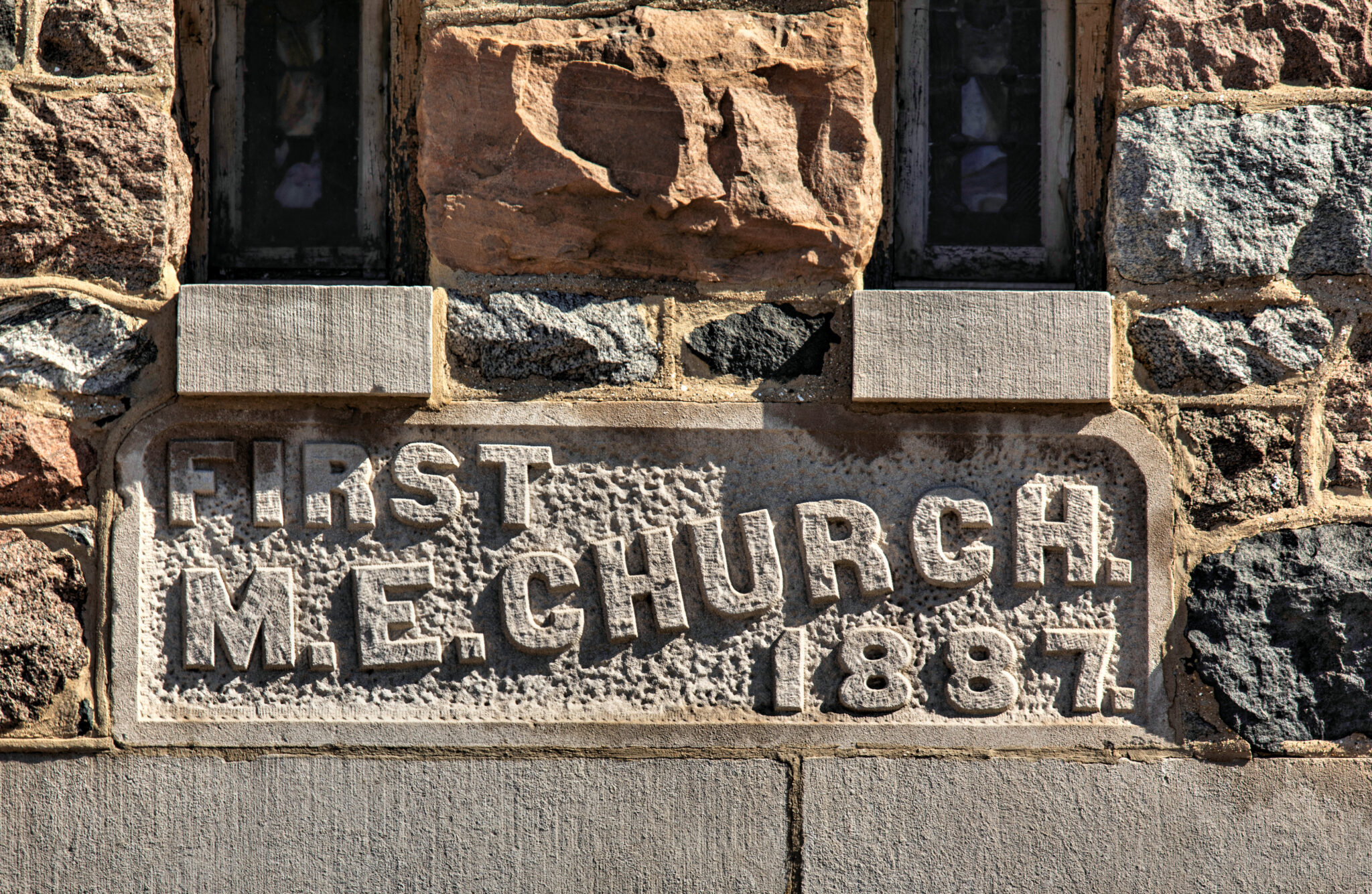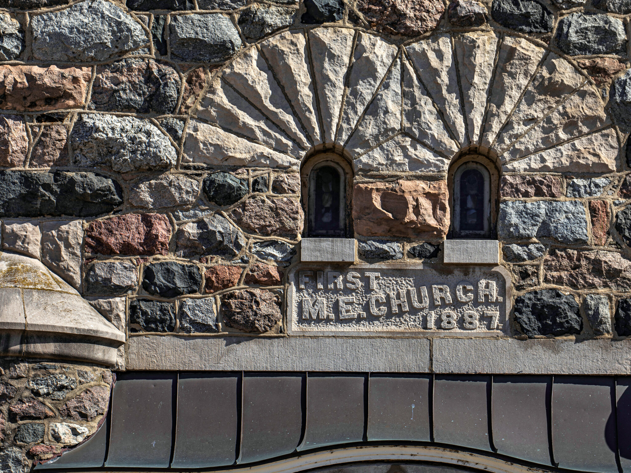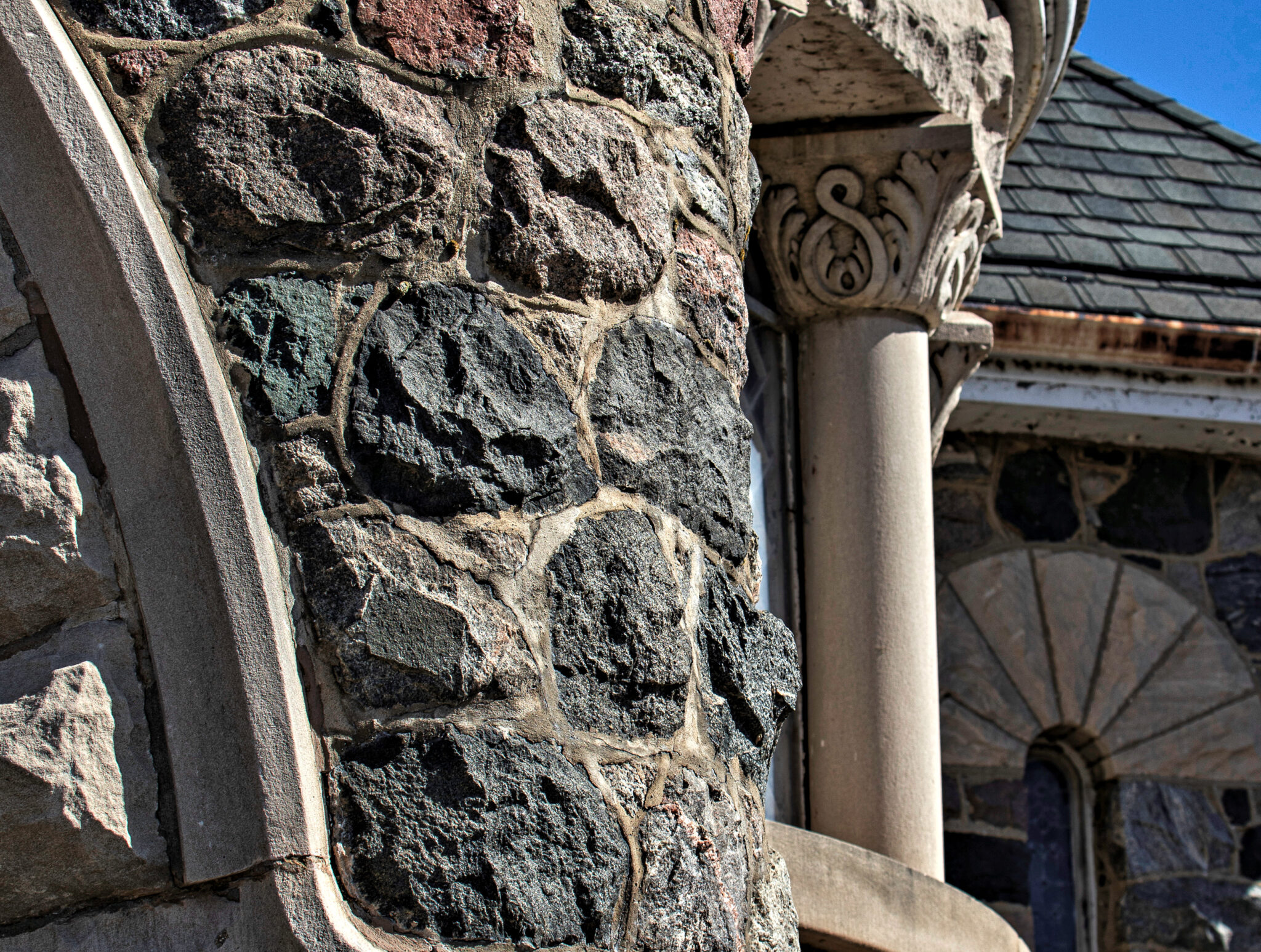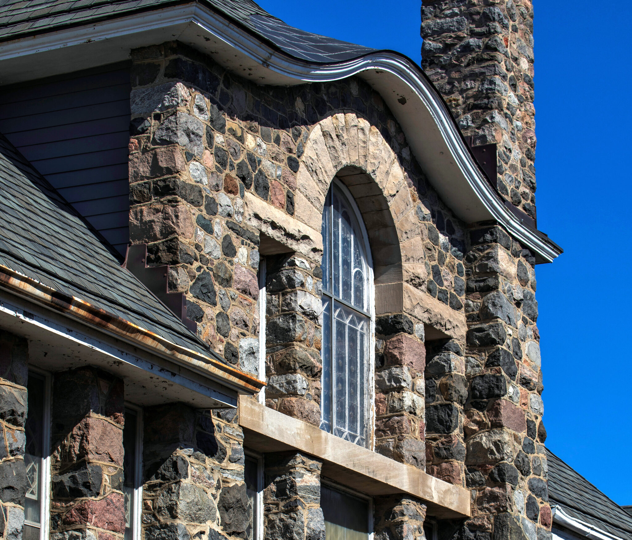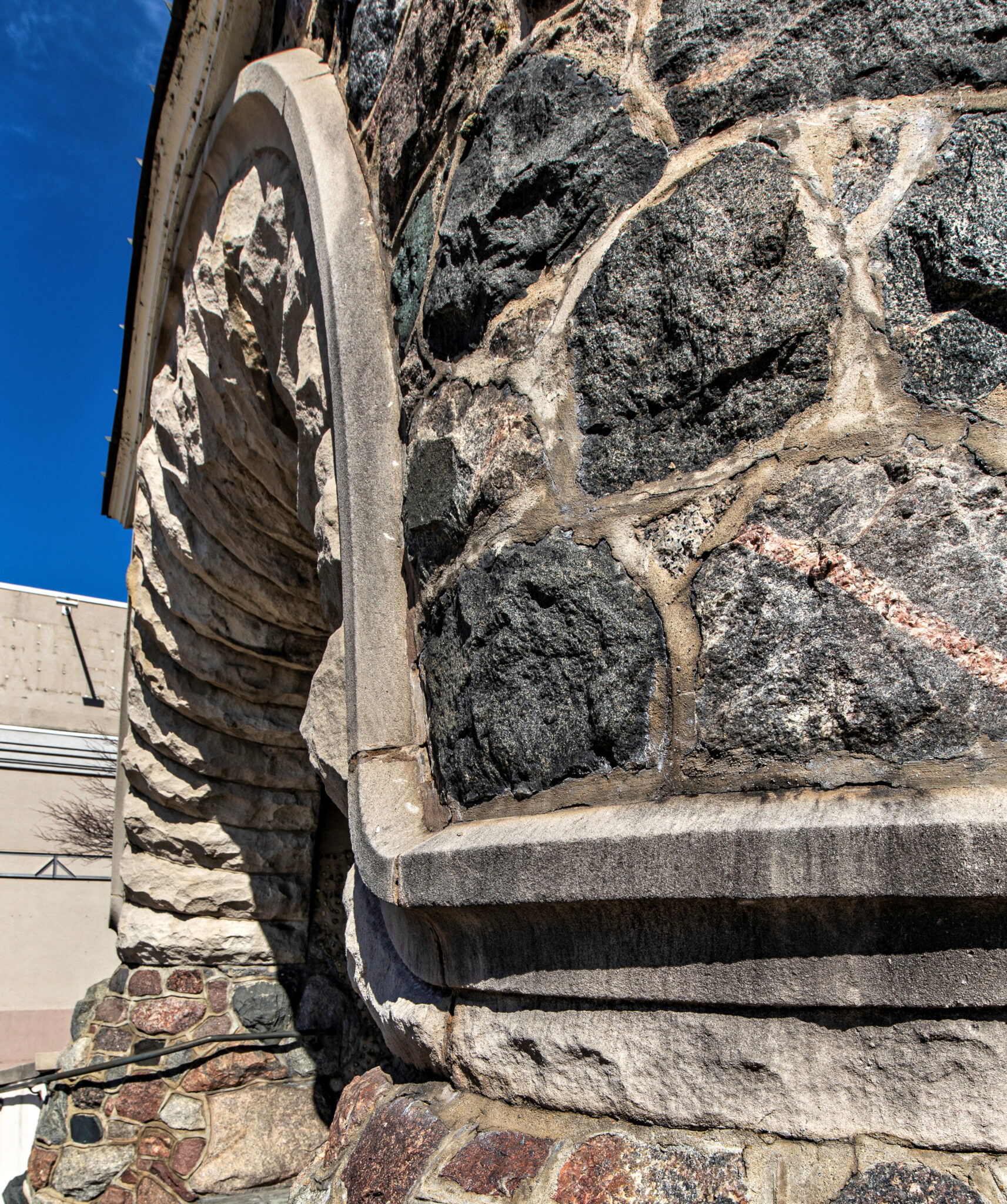 detailed photographic survey of solon spencer beman’s first methodist church of batavia, located at 8 north batavia avenue, batavia, il. the richardsonian romanesque style church’s exterior is comprised of multi-coloed rough-faced stones or boulders, harvested from local building contractor i.s. stephens’s mill creek farm in batavia.