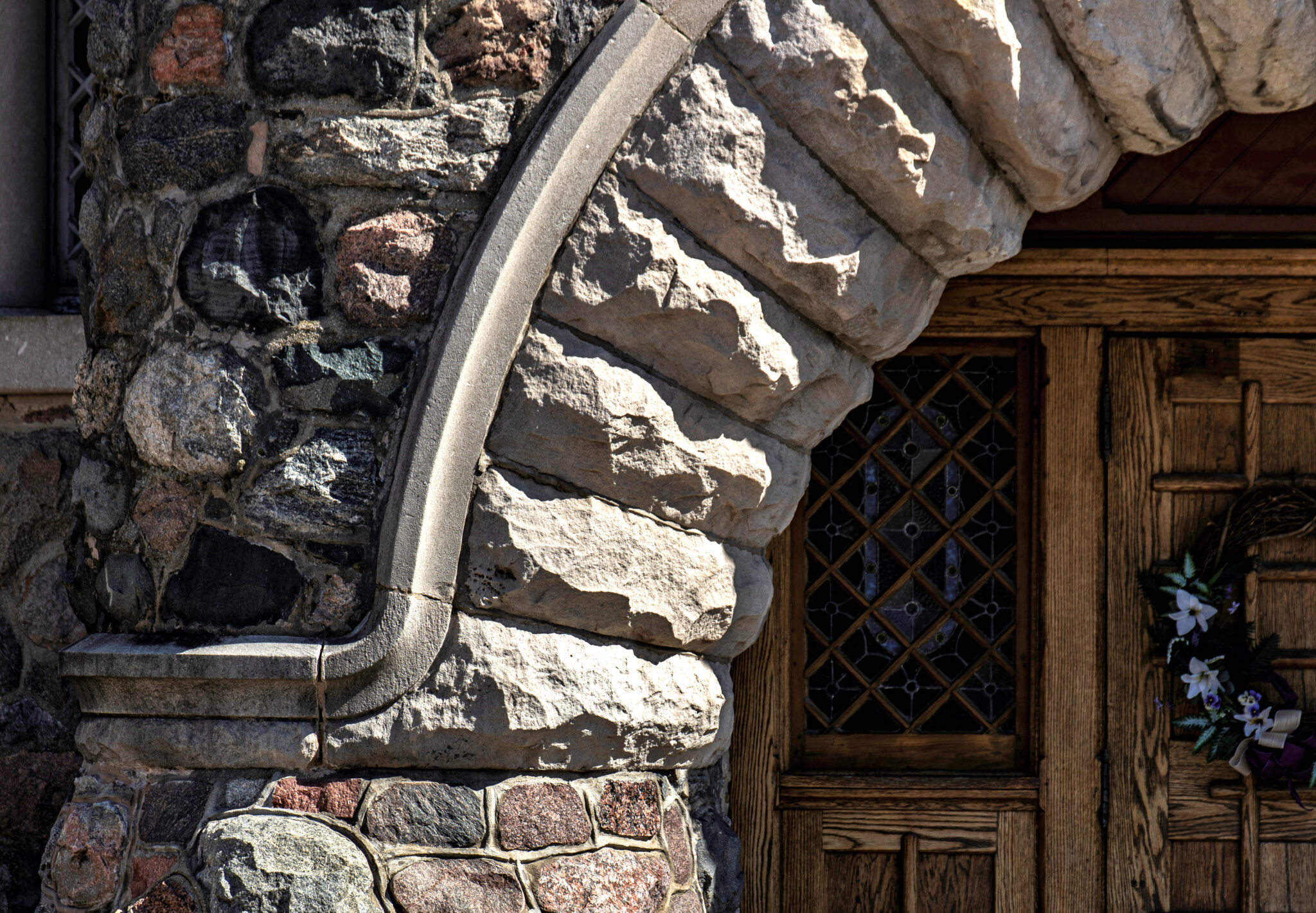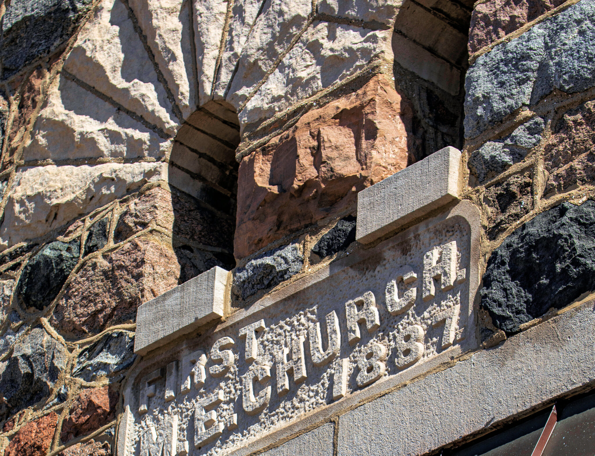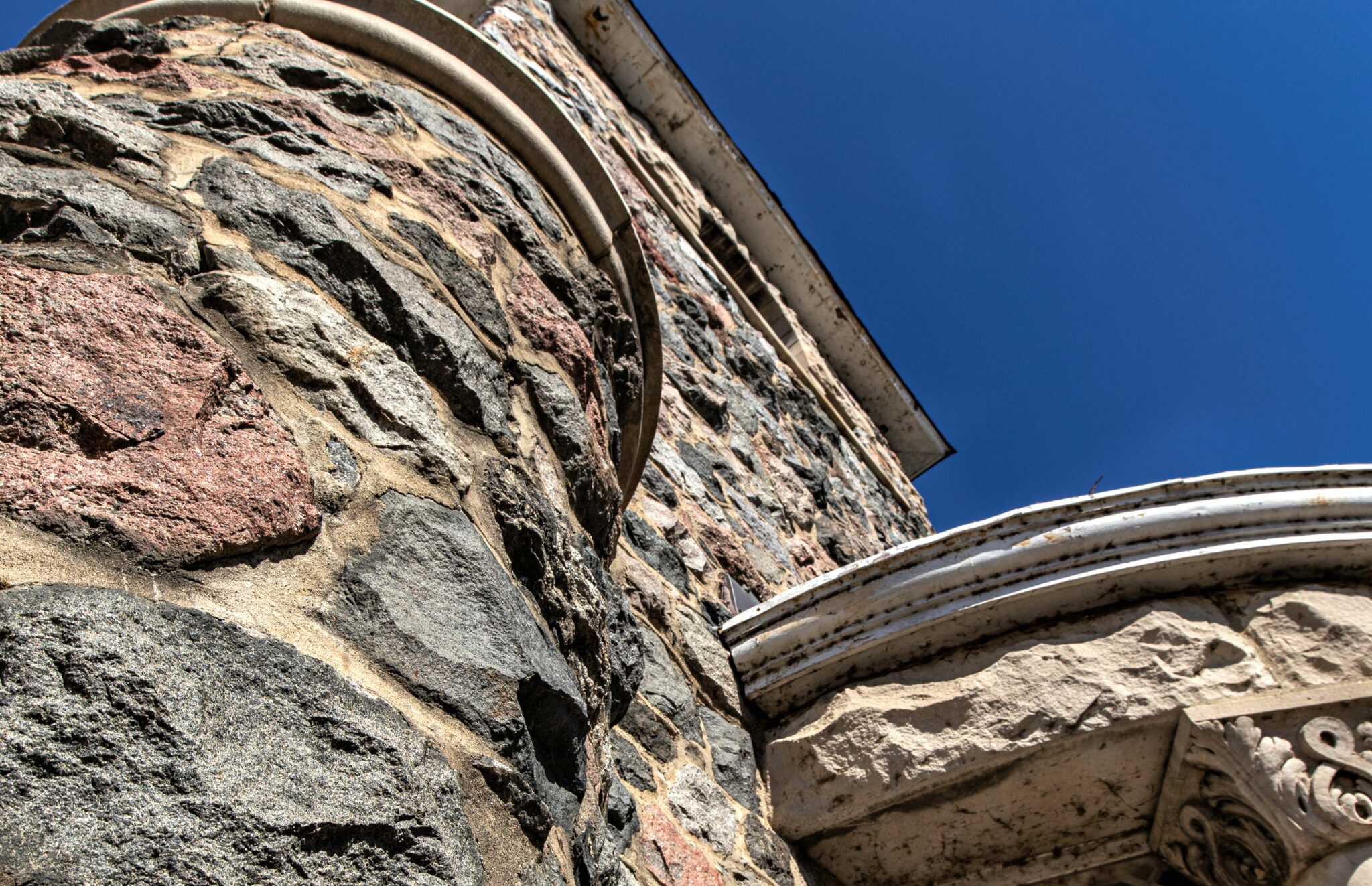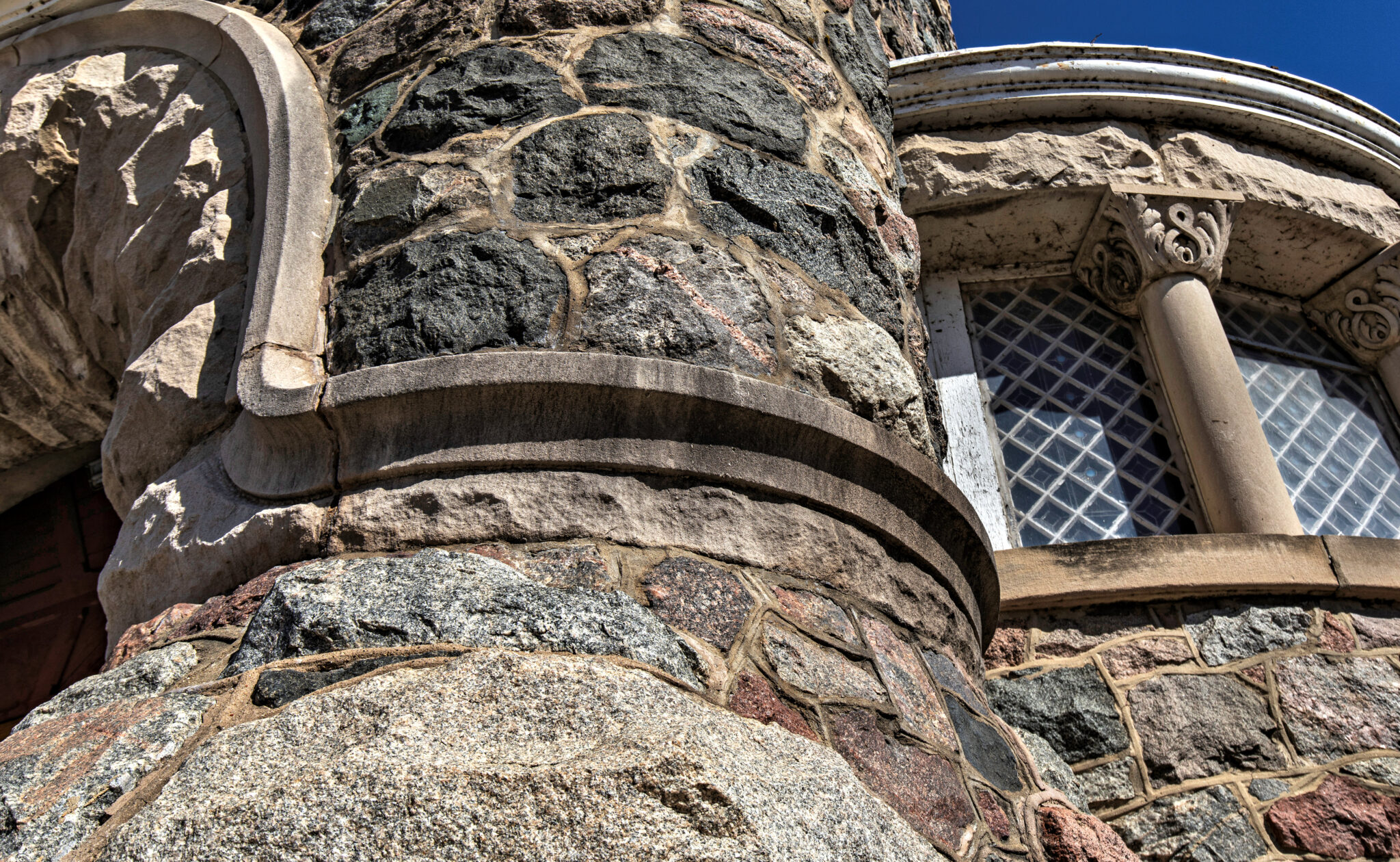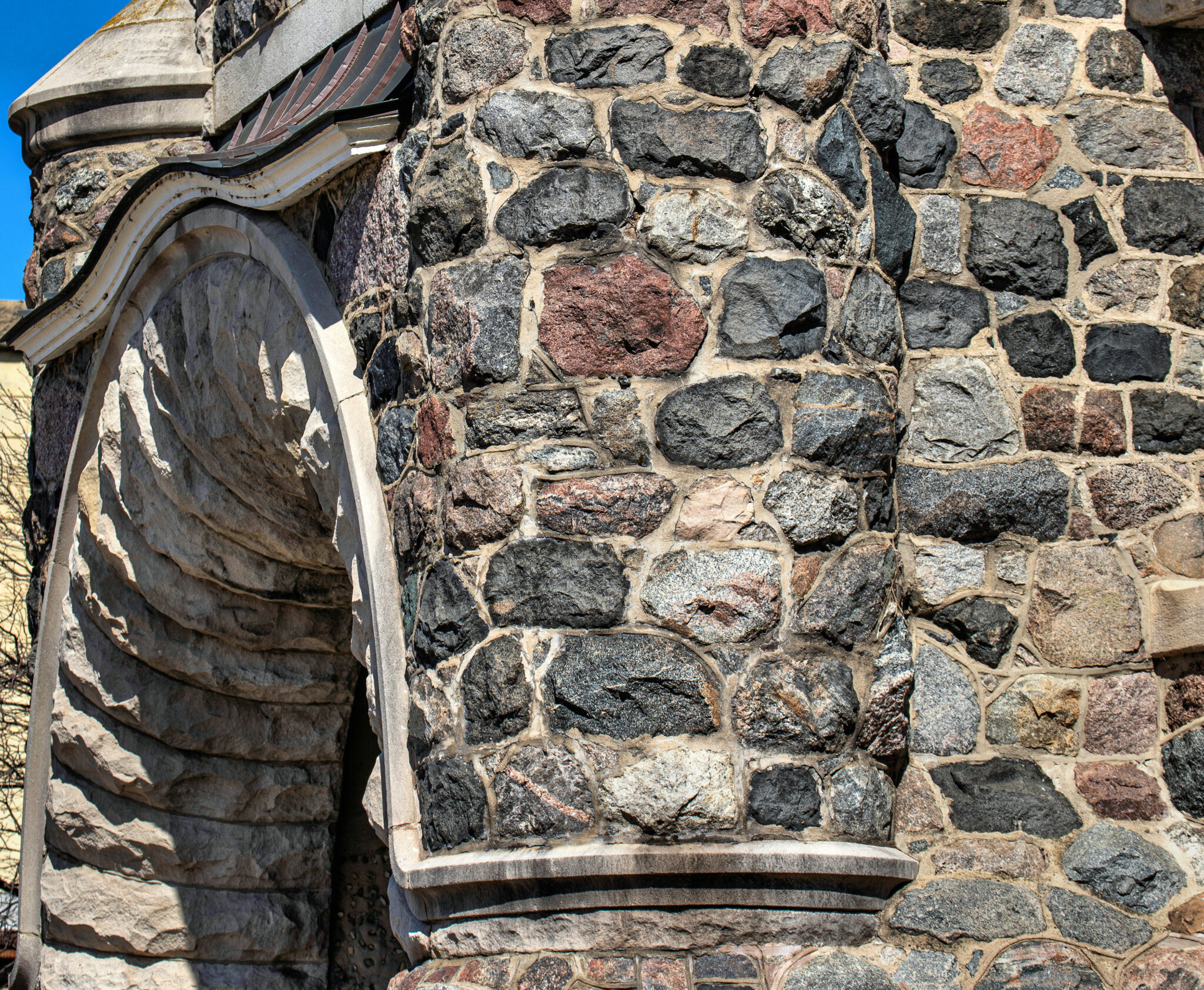 detailed photographic survey of solon spencer beman’s first methodist church of batavia, located at 8 north batavia avenue, batavia, il. the richardsonian romanesque style church’s exterior is comprised of multi-coloed rough-faced stones or boulders, harvested from local building contractor i.s. stephens’s mill creek farm in batavia.