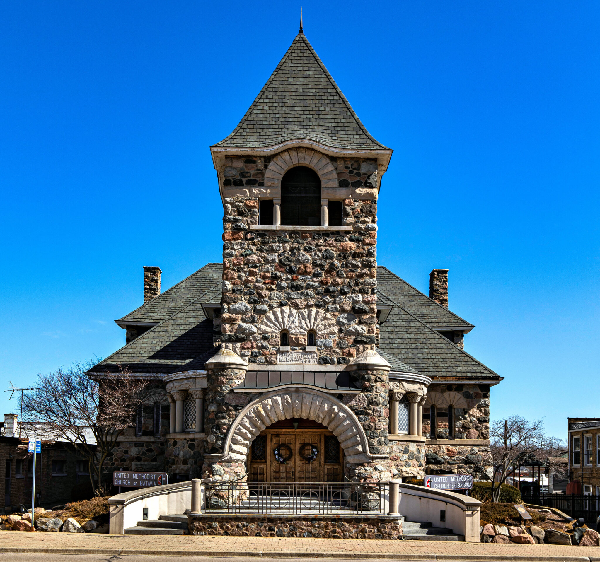 10 Mar solon spencer beman’s 1887 rock-faced romanesque revival style united methodist church of batavia