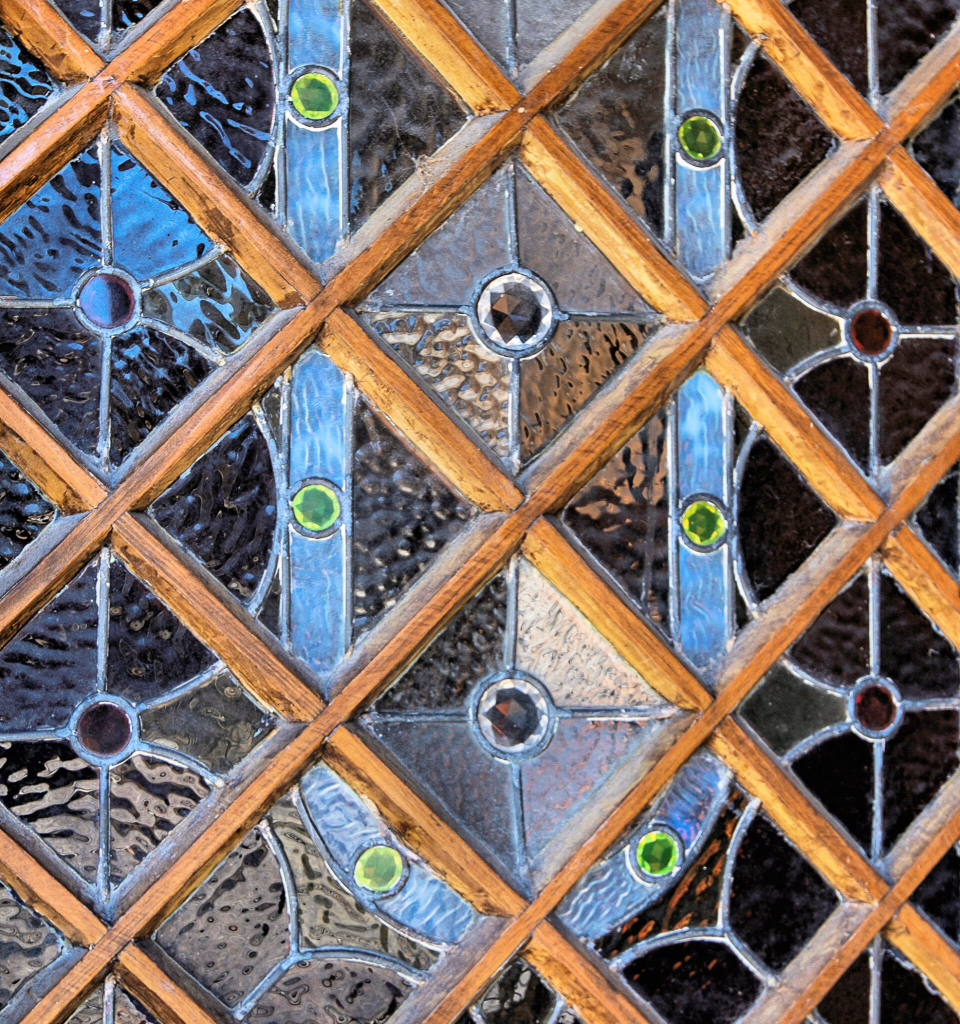 the interior contains features a darkly stained oak wood barrel-vaulted ceiling and a multitude of richly colored stained glass window.