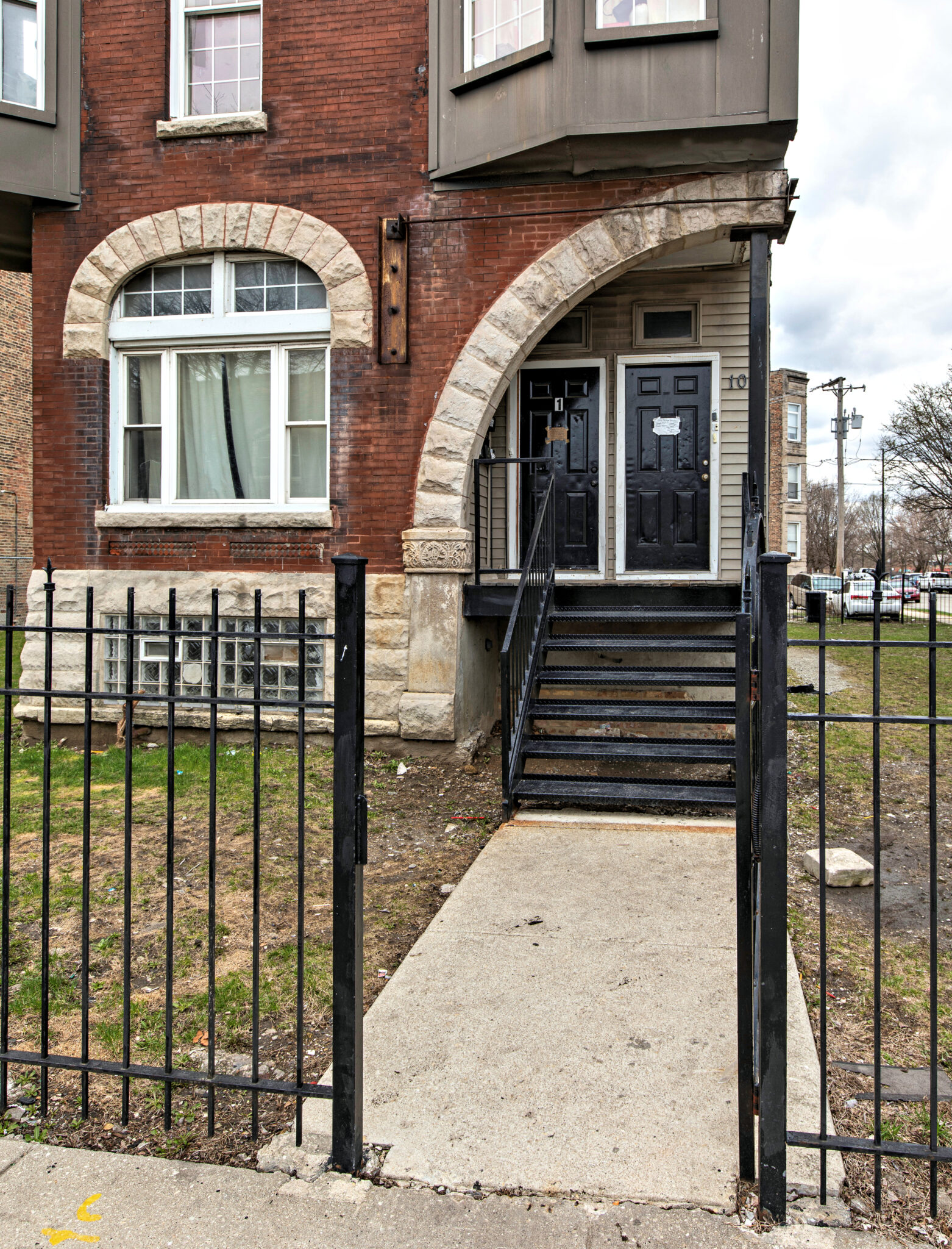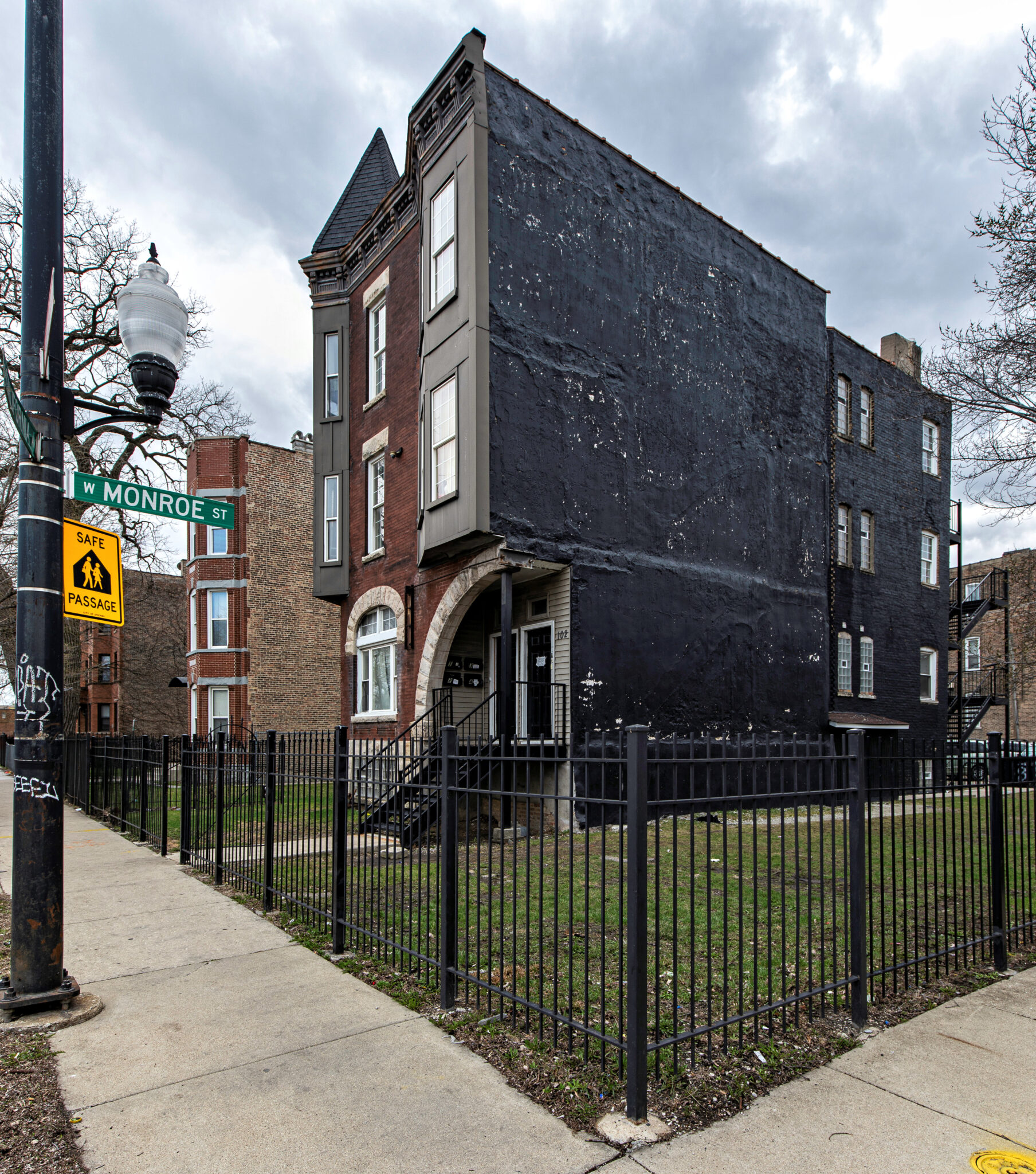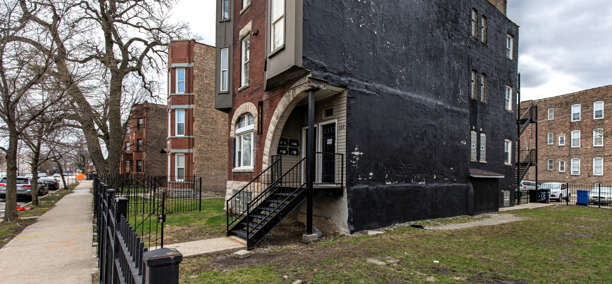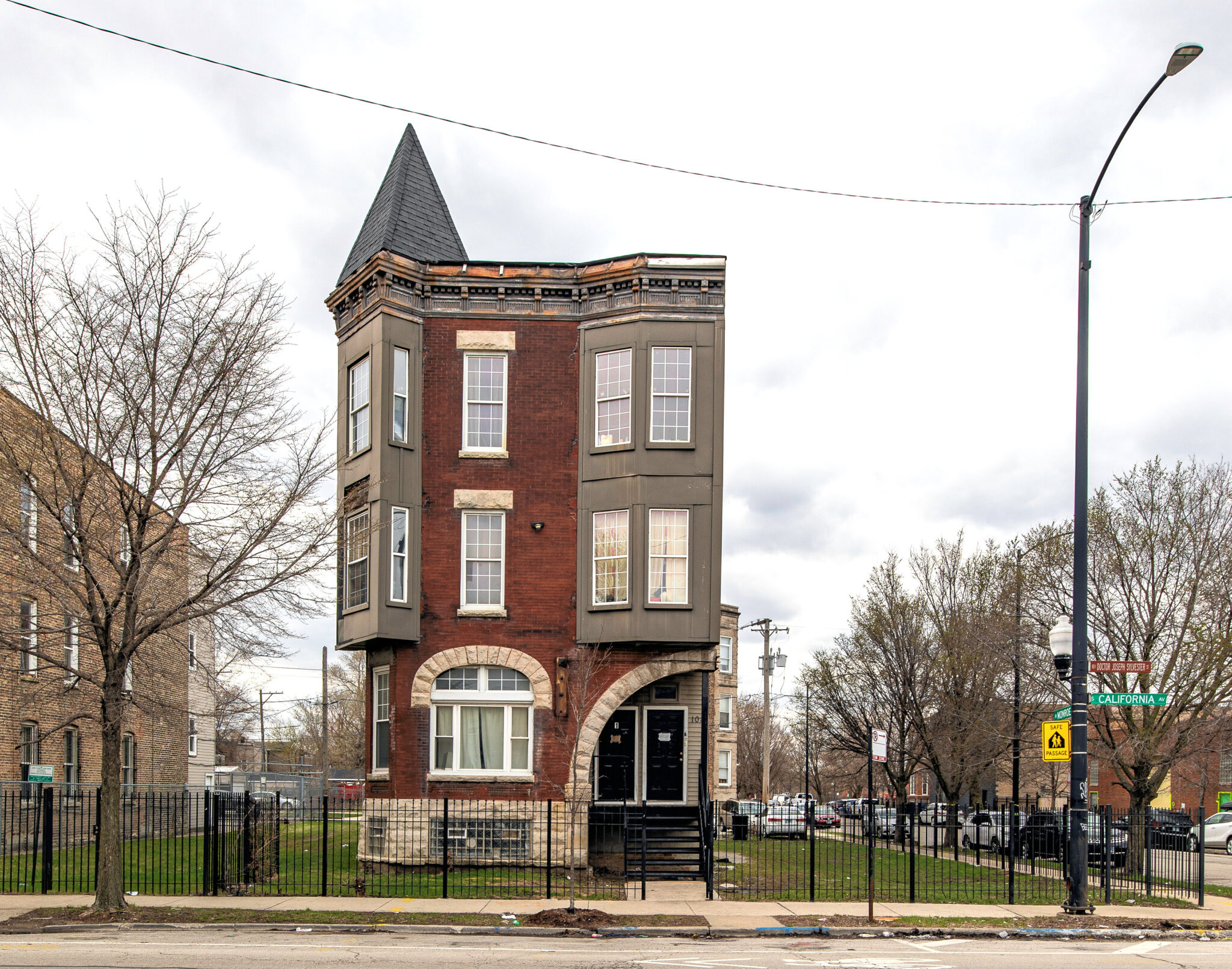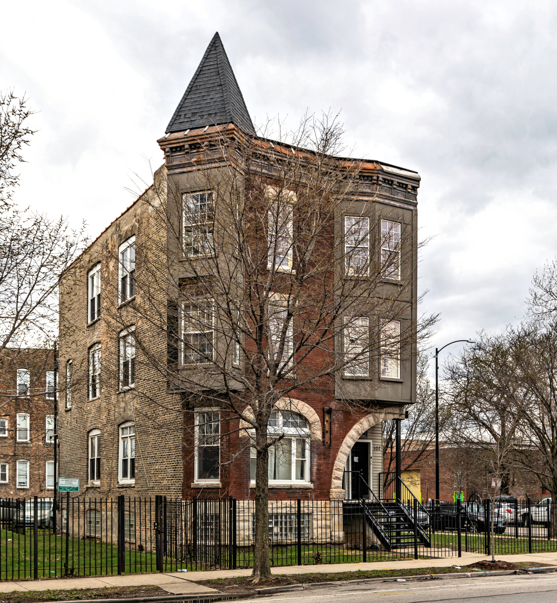 exterior images of a late 19th century three-story residential masonry building, punctuated with carved and rough-faced limestone, stamped steel cornice, and pyramid-shaped shingled turret, located at 104 south california avenue, chicago, il.