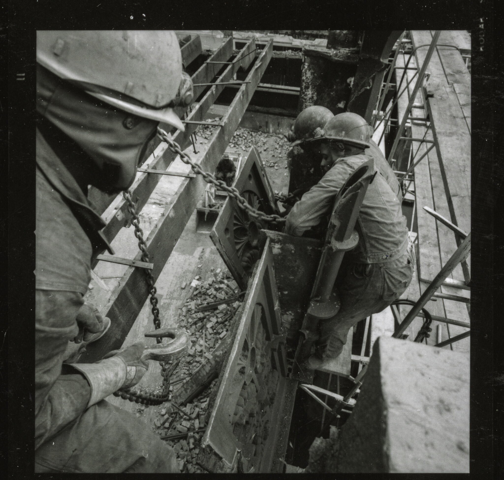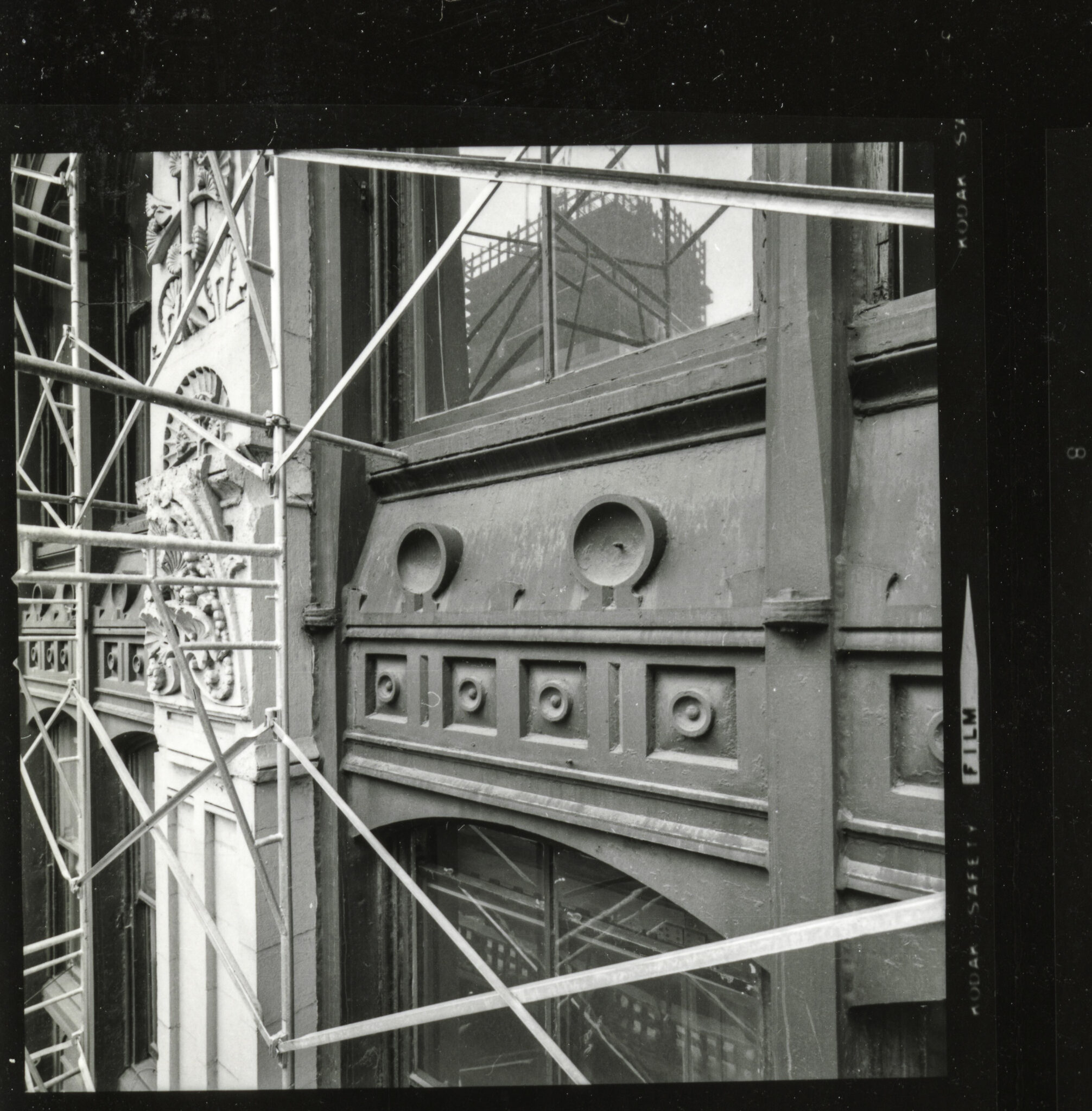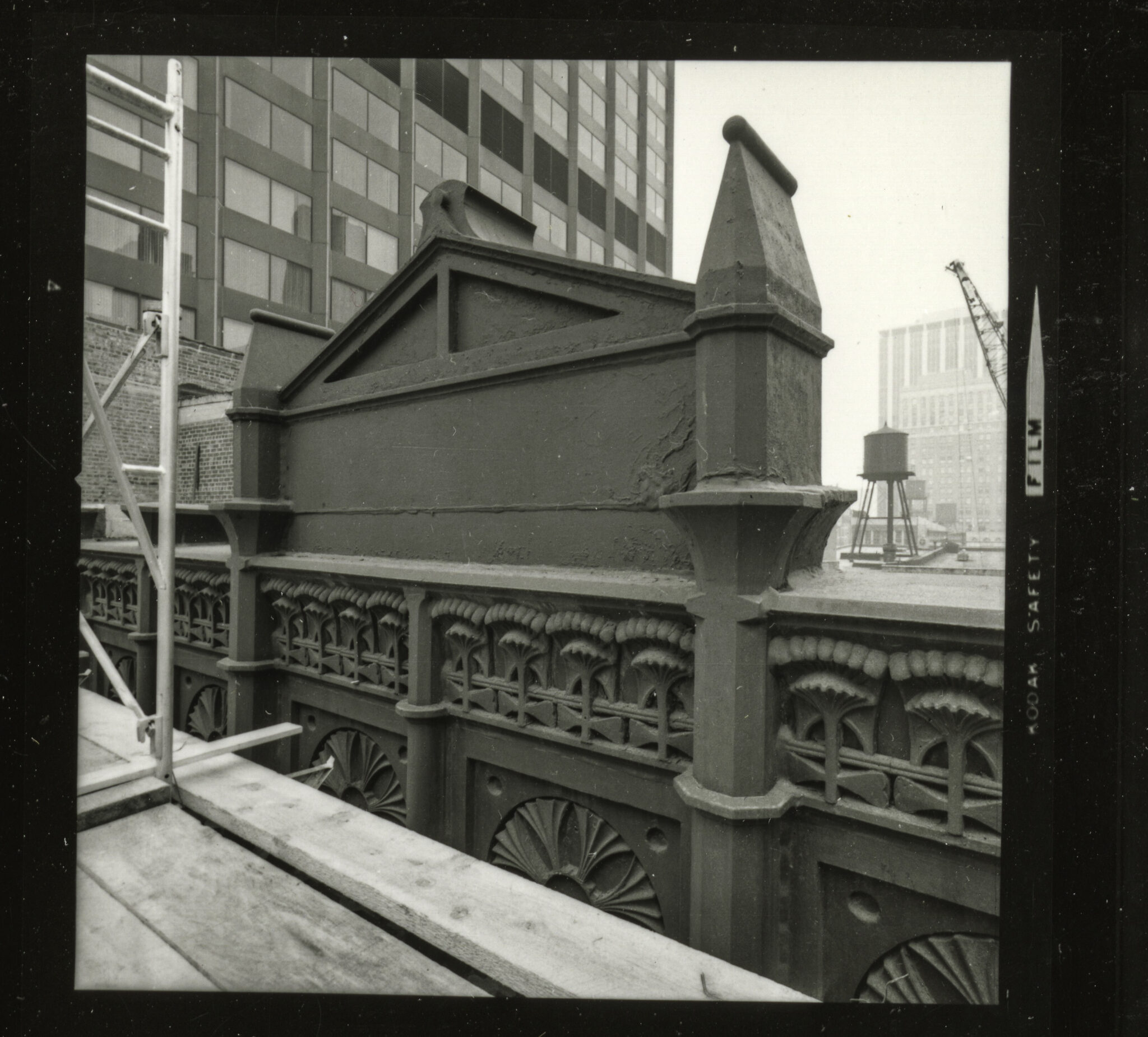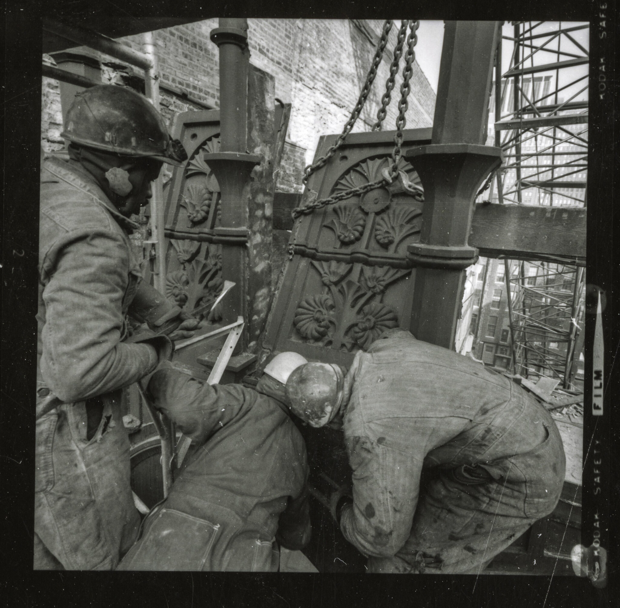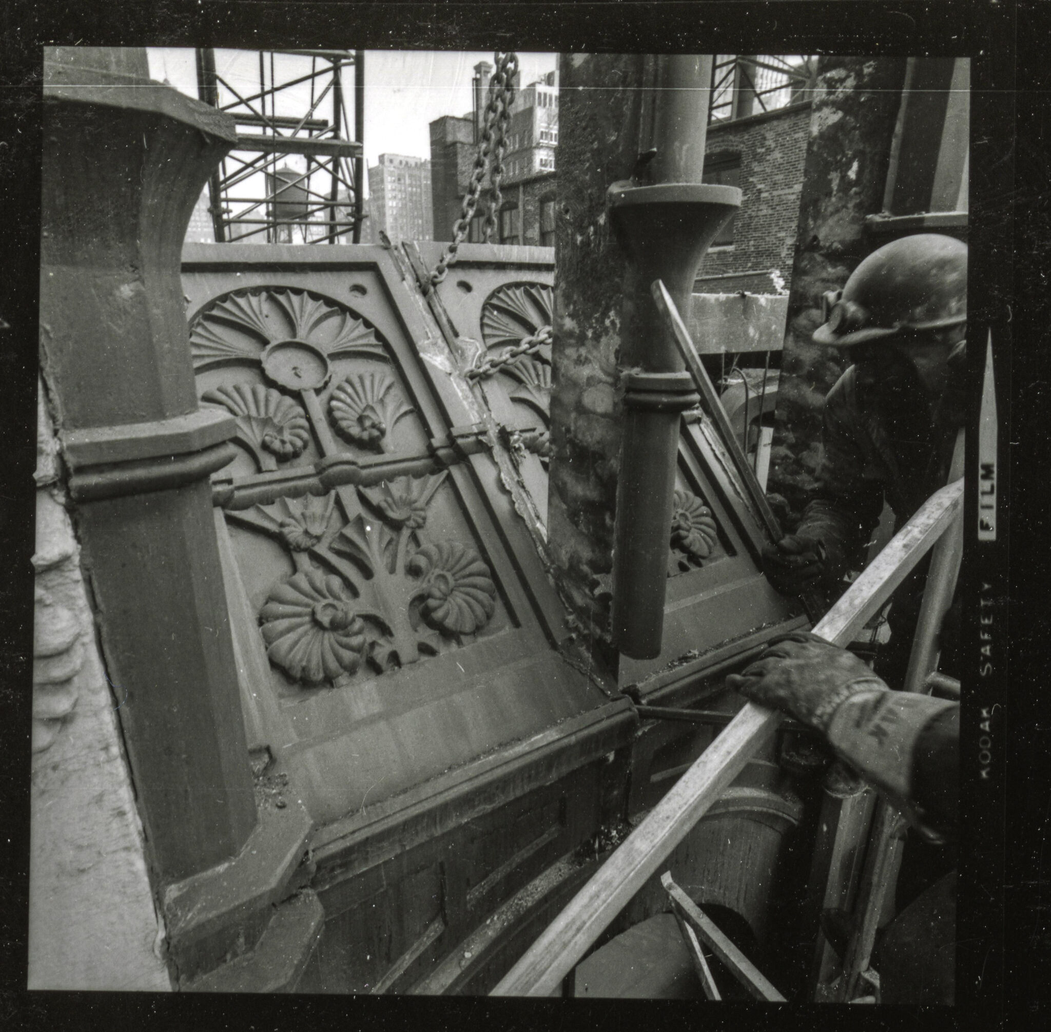 with unrestricted building access during demolition, nickel systematically documented the wreckers dismantle the limestone and cast iron cornice, including the removal of four panels he arranged to have saved for the art institute, edwardsville, and other institutions. the eight remaining iron panels and cornice sections were scrapped.