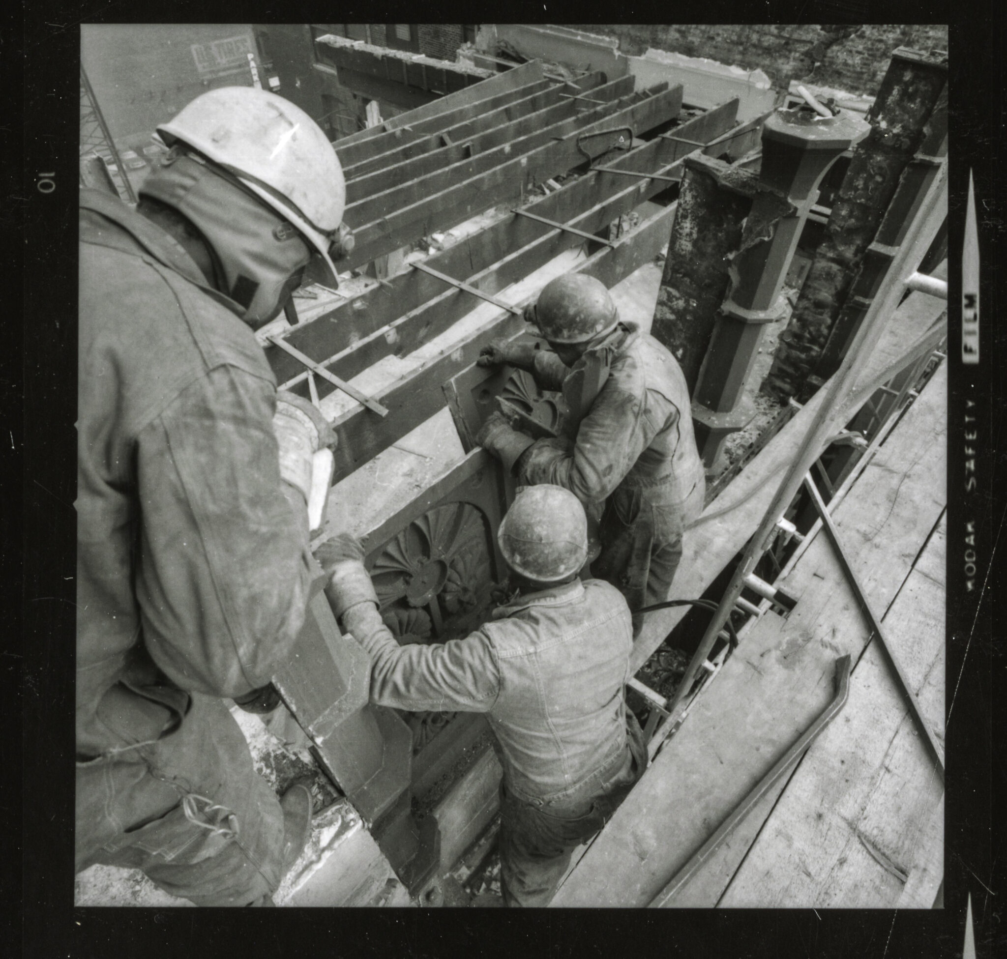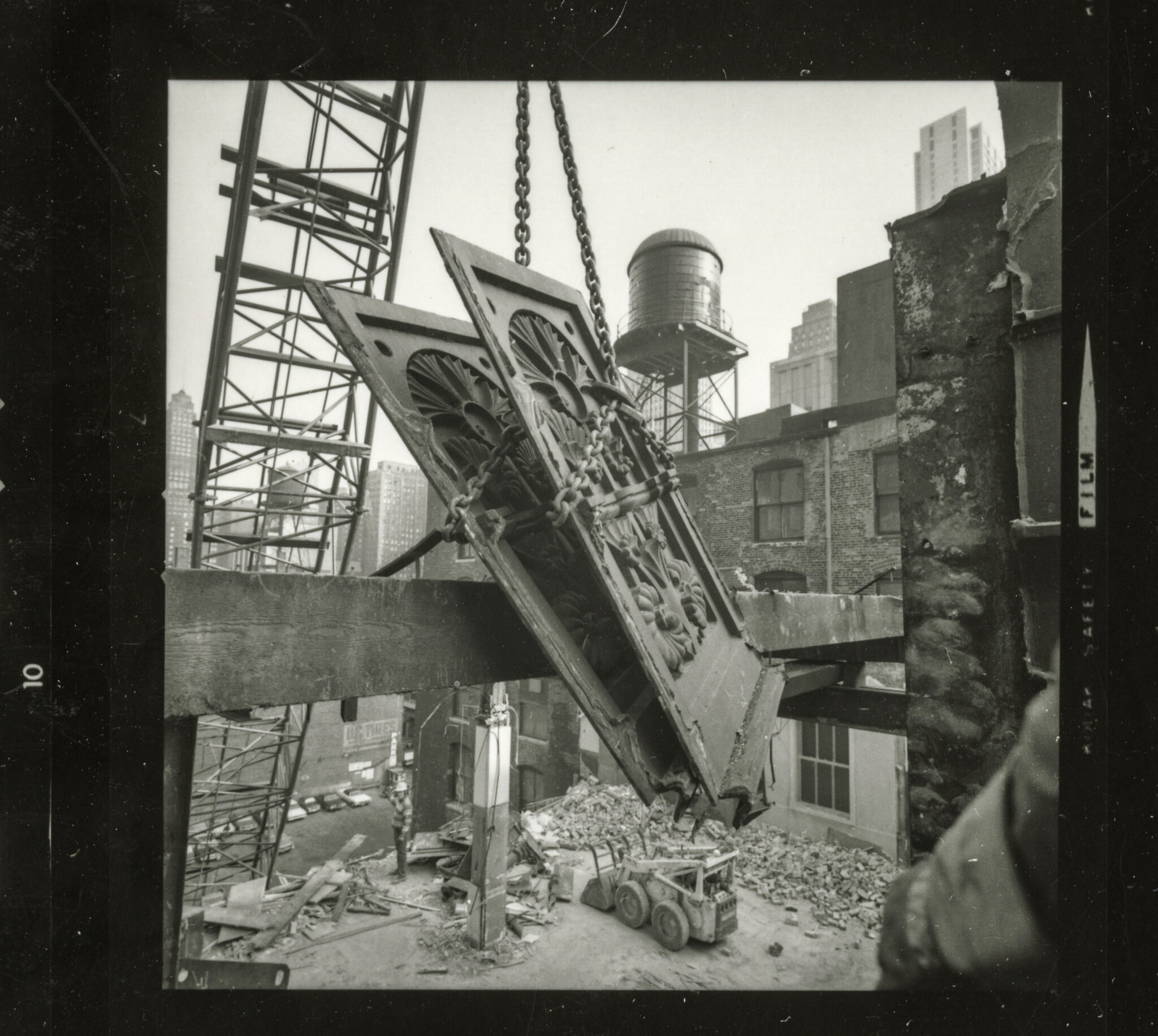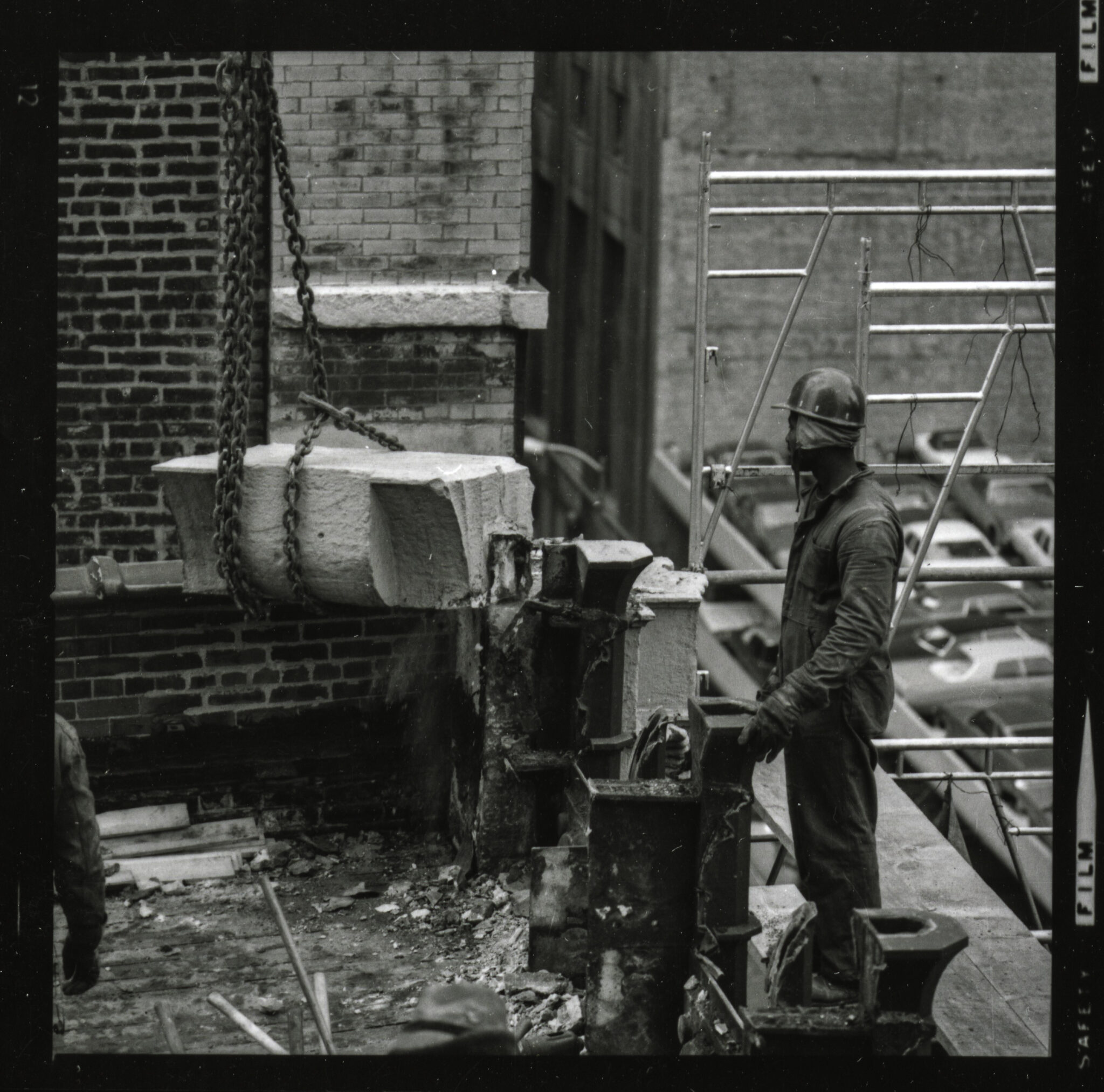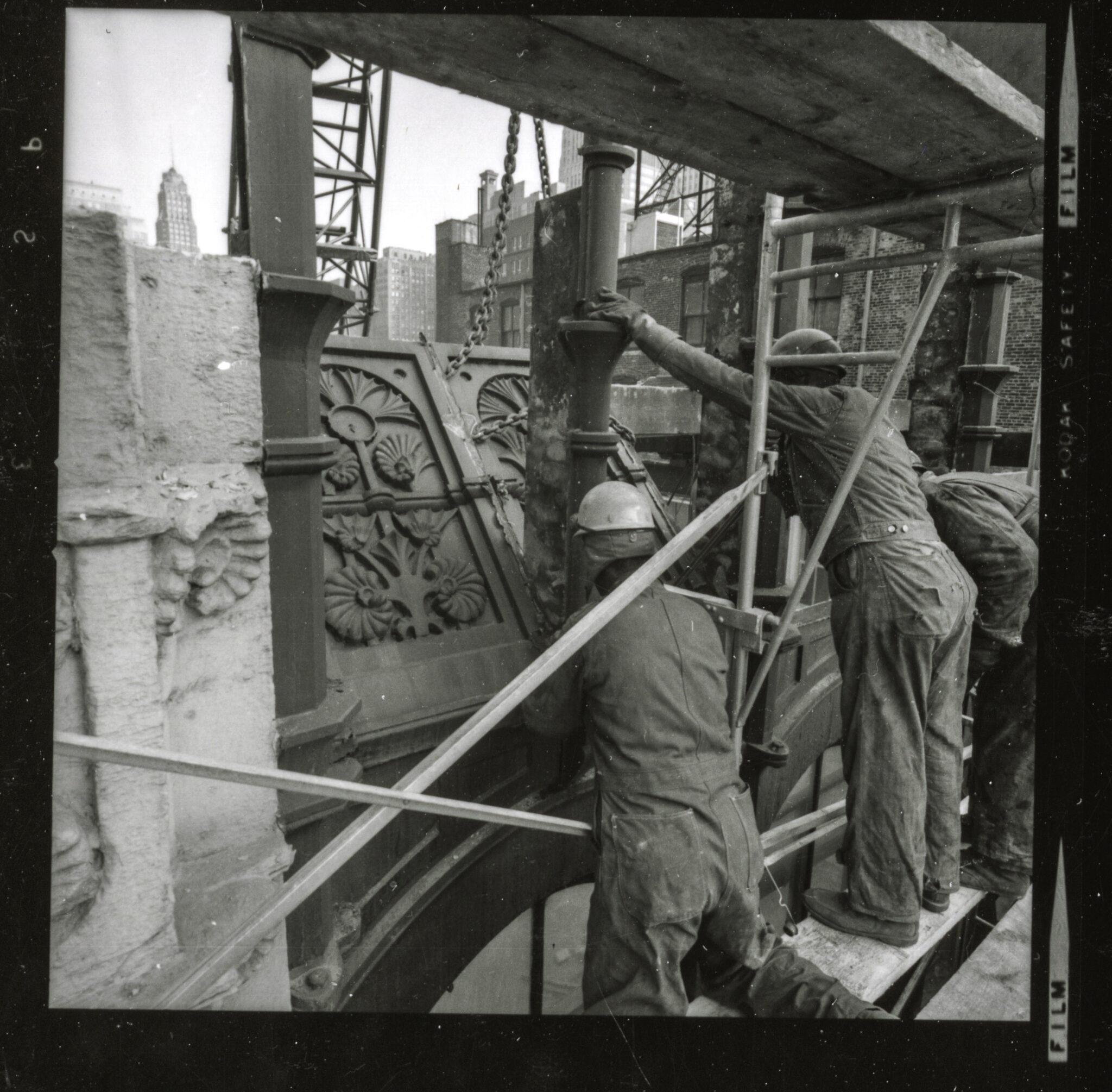 with unrestricted building access during demolition, nickel systematically documented the wreckers dismantle the limestone and cast iron cornice, including the removal of four panels he arranged to have saved for the art institute, edwardsville, and other institutions. the eight remaining iron panels and cornice sections were scrapped.
