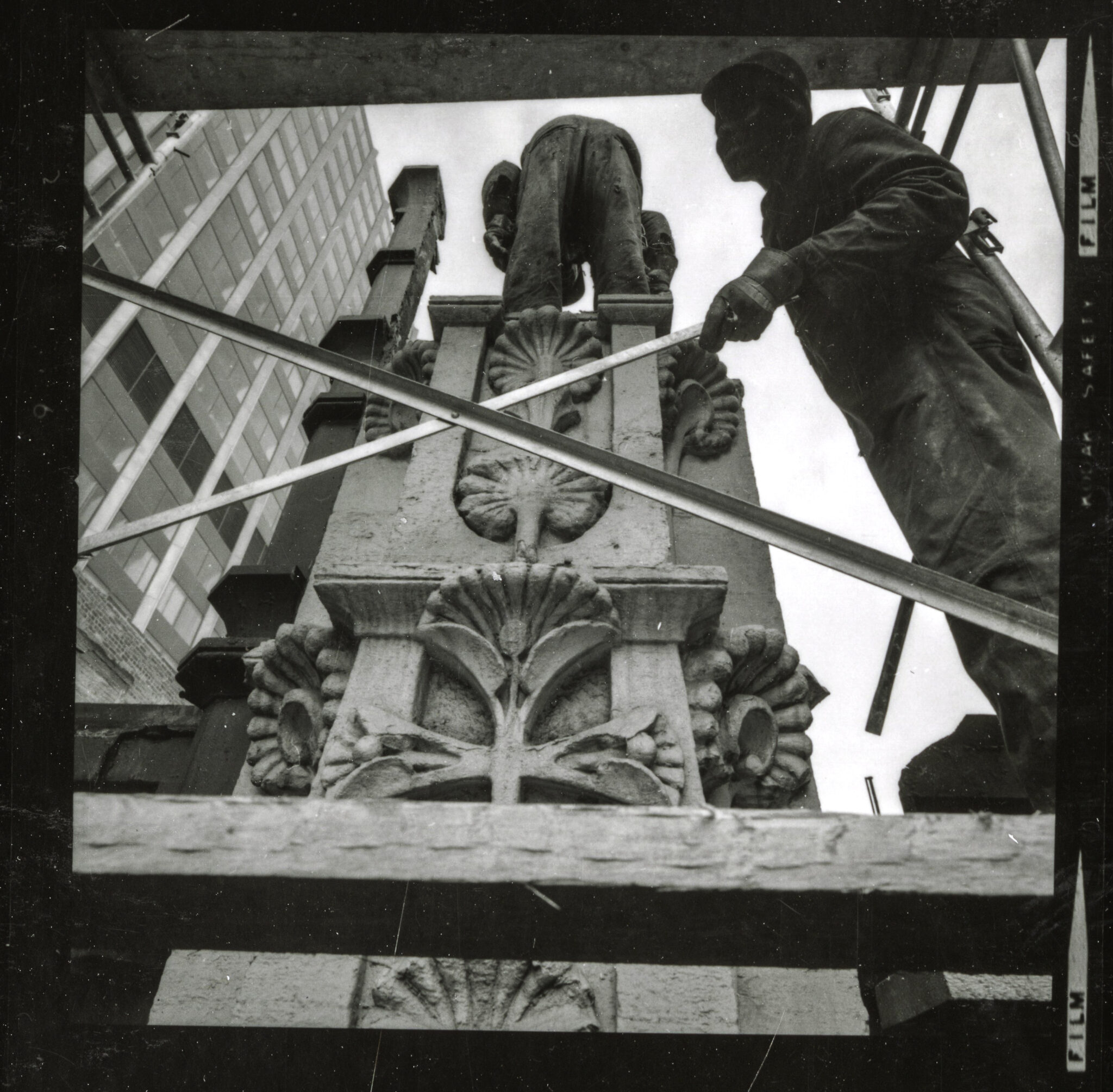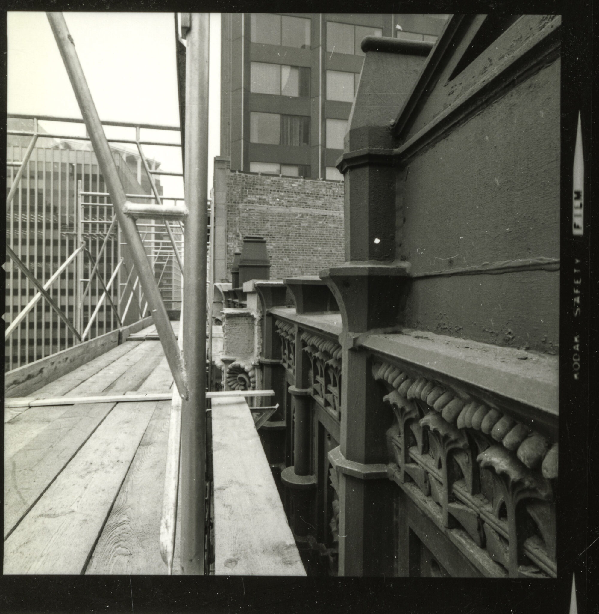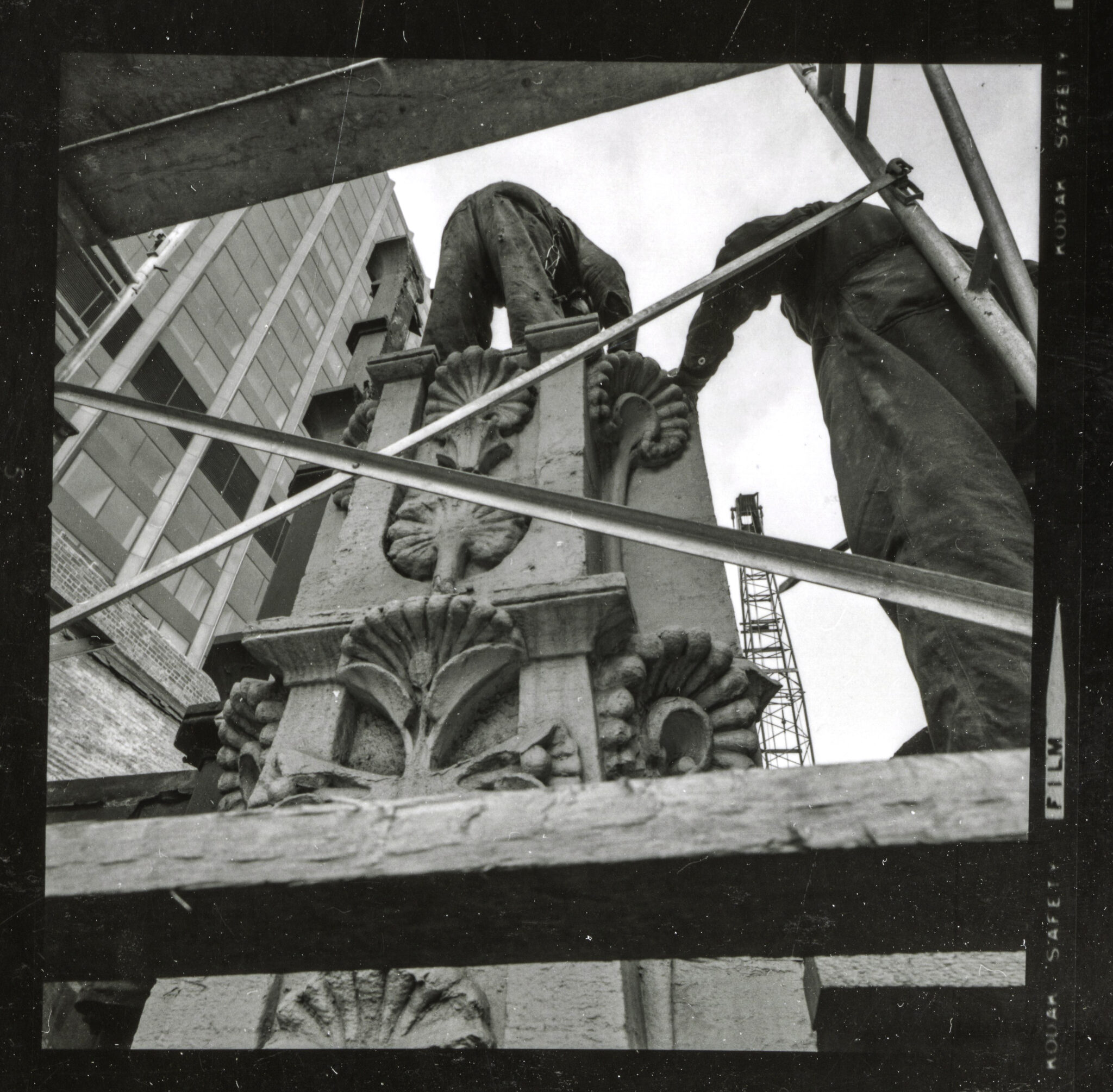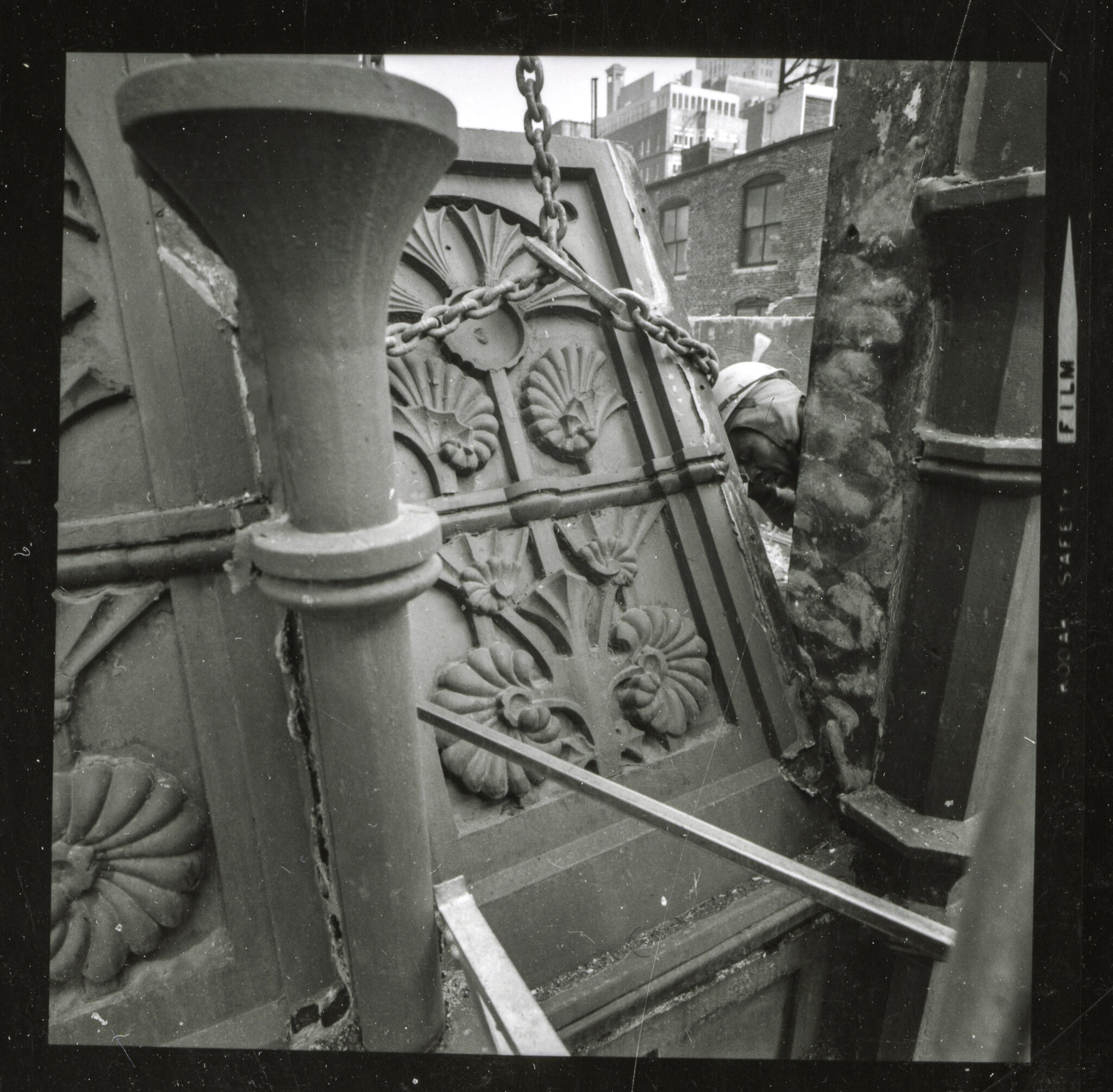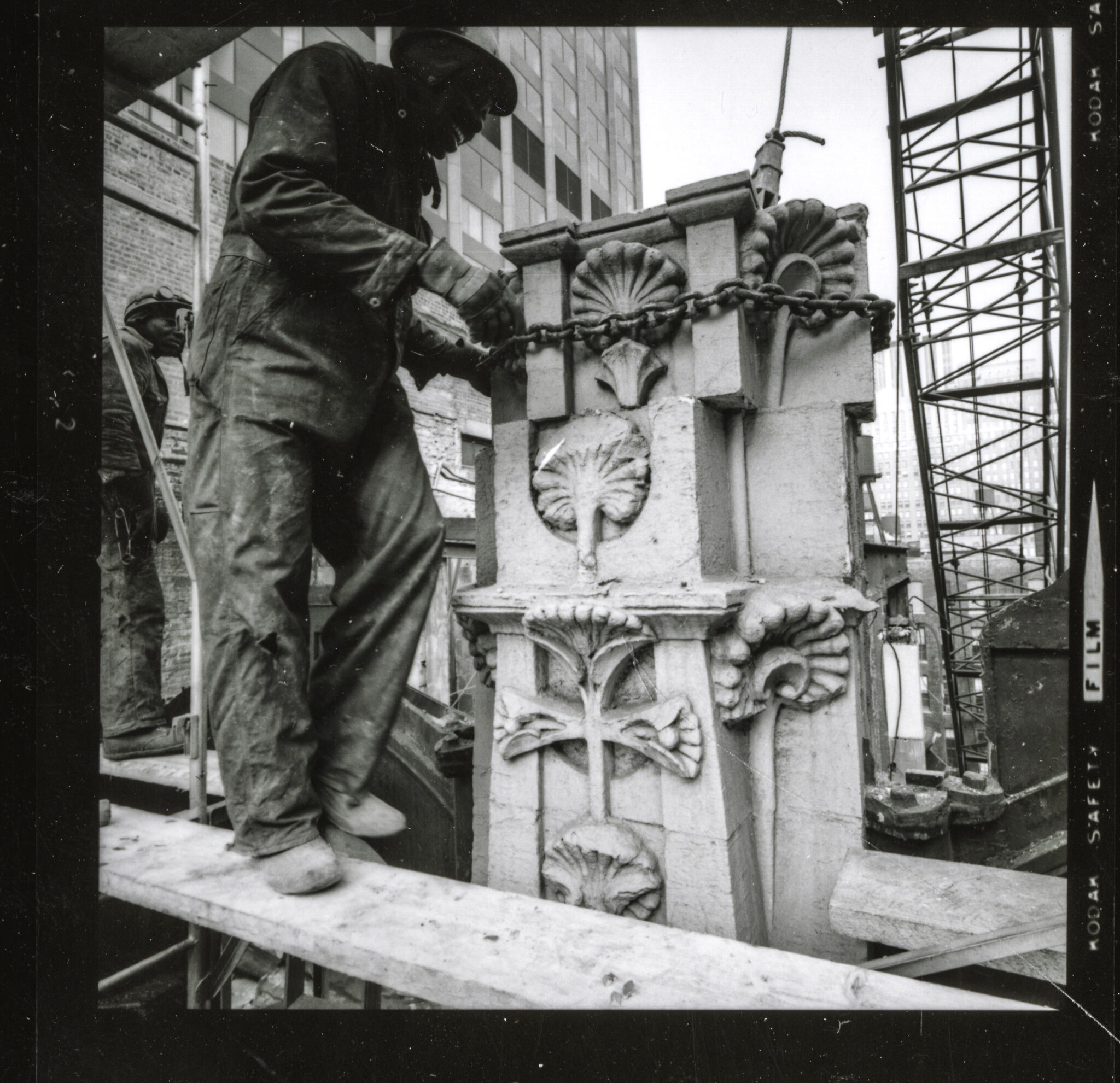 with unrestricted building access during demolition, nickel systematically documented the wreckers dismantle the limestone and cast iron cornice, including the removal of four panels he arranged to have saved for the art institute, edwardsville, and other institutions. the eight remaining iron panels and cornice sections were scrapped.