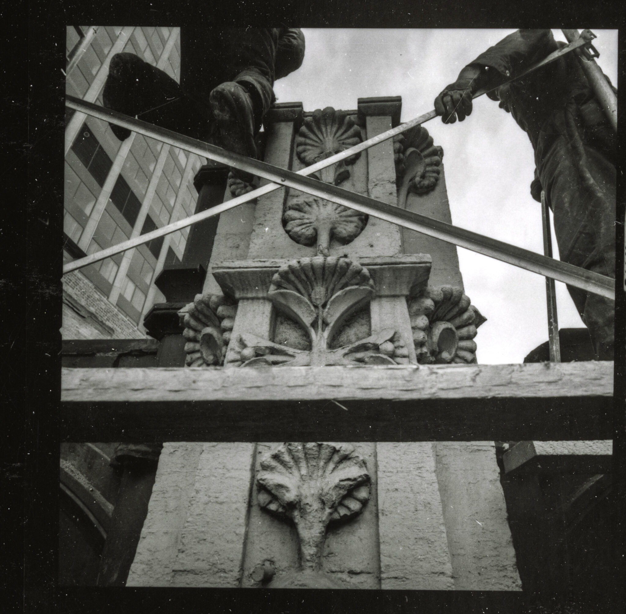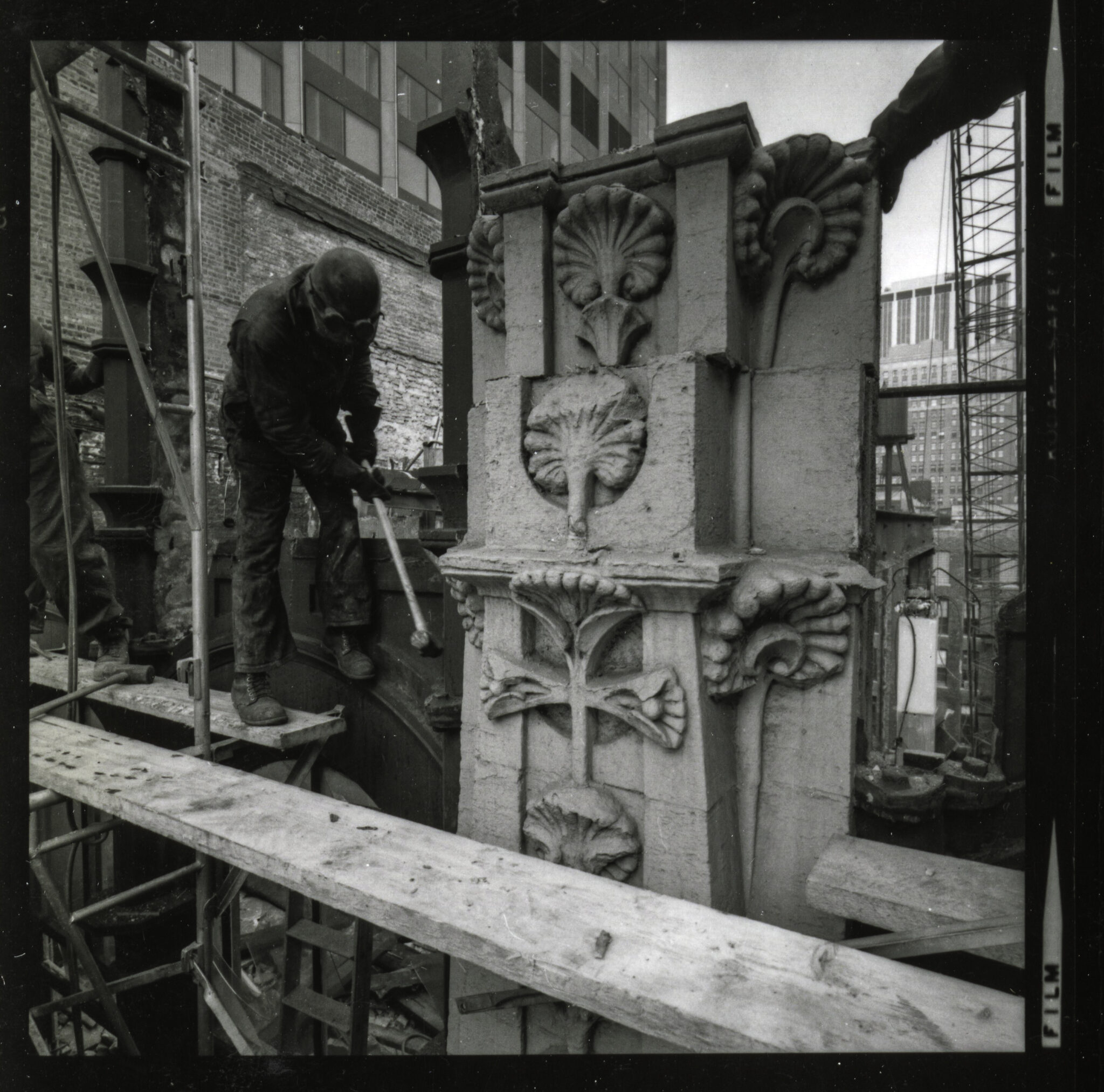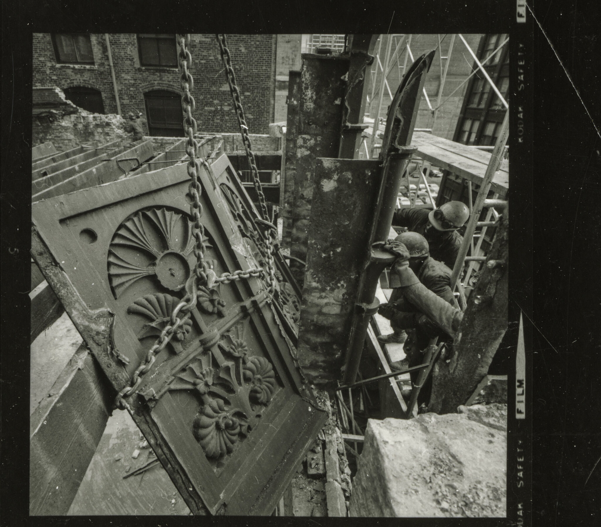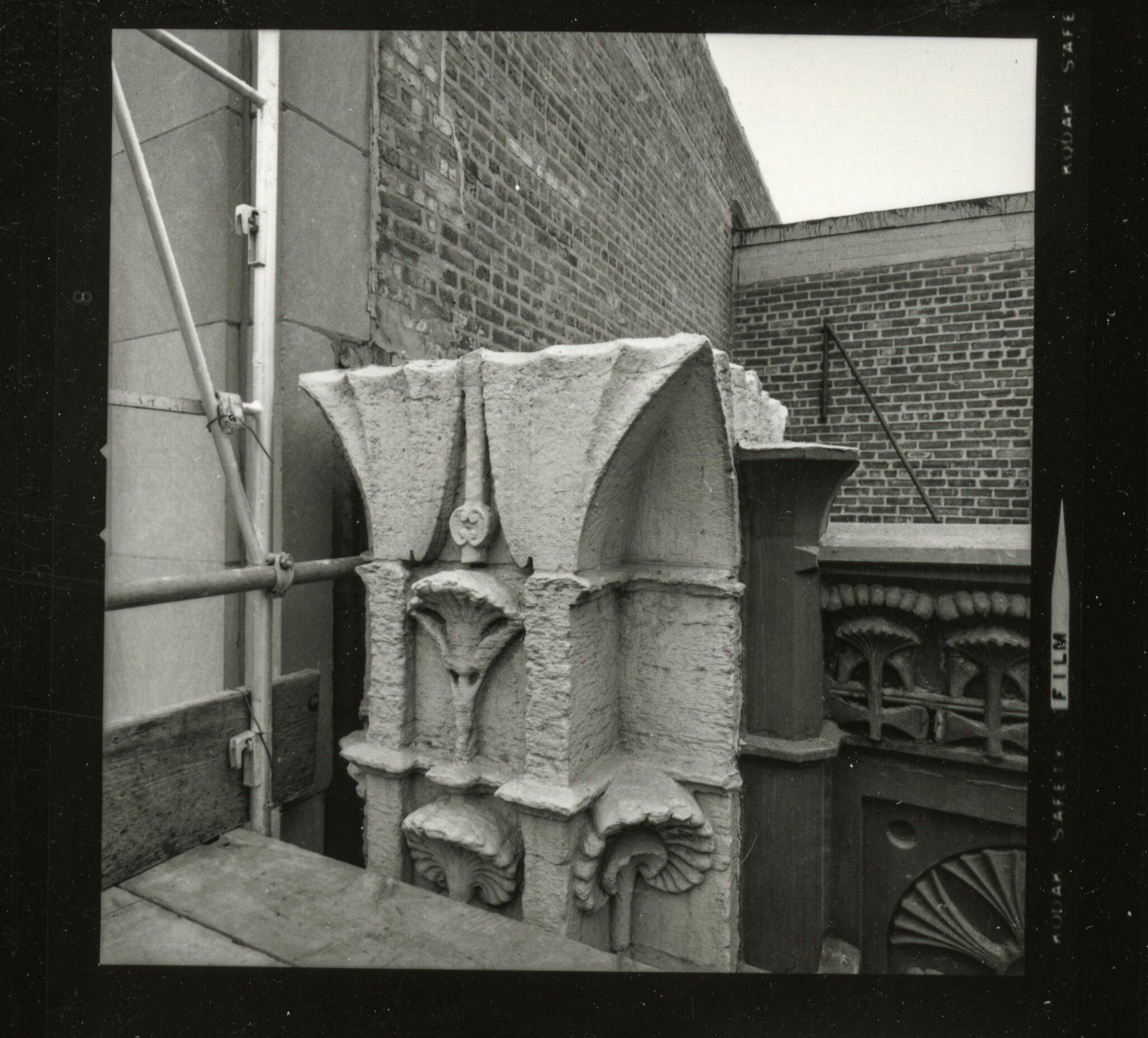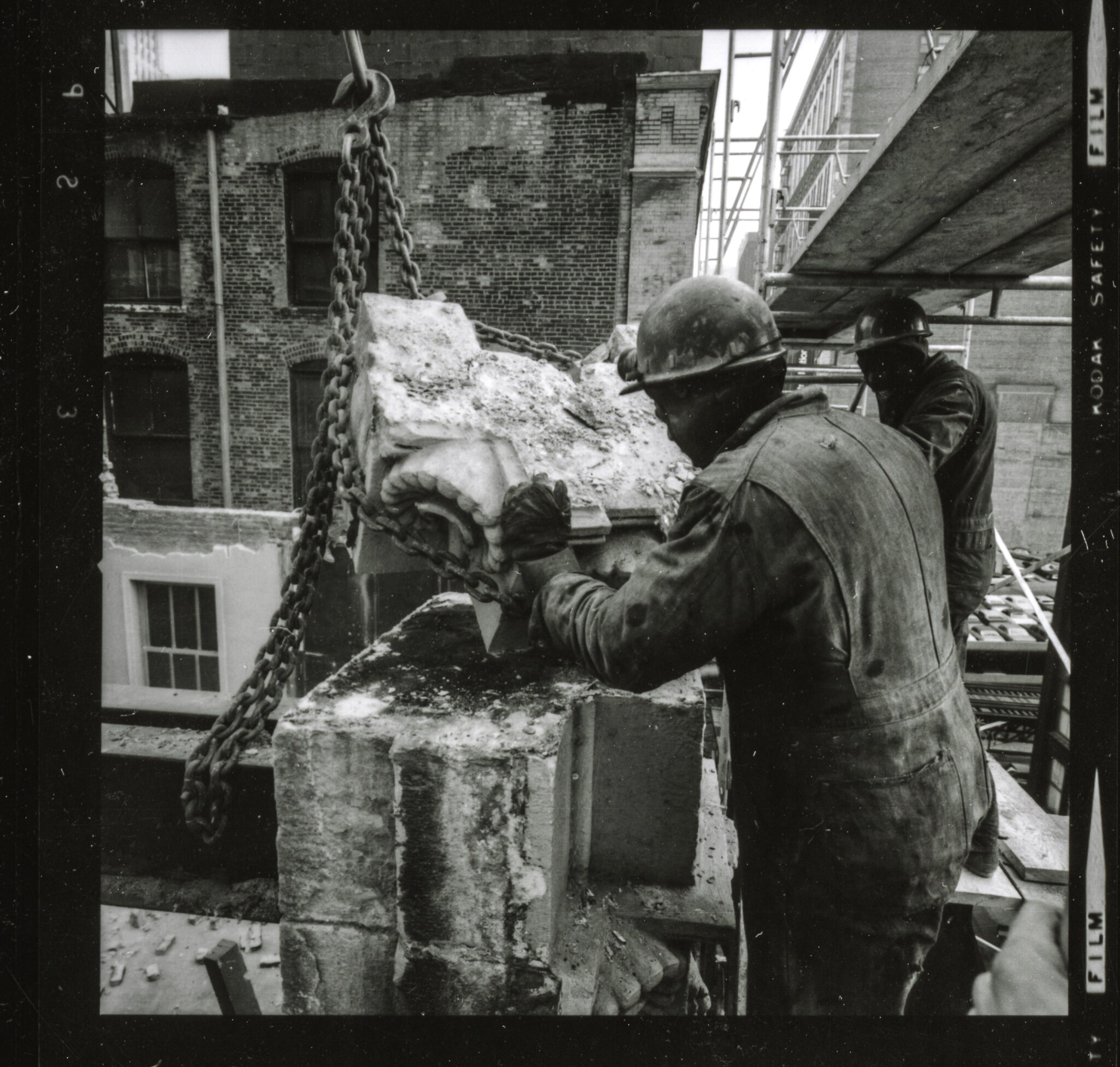 with unrestricted building access during demolition, nickel systematically documented the wreckers dismantle the limestone and cast iron cornice, including the removal of four panels he arranged to have saved for the art institute, edwardsville, and other institutions. the eight remaining iron panels and cornice sections were scrapped.