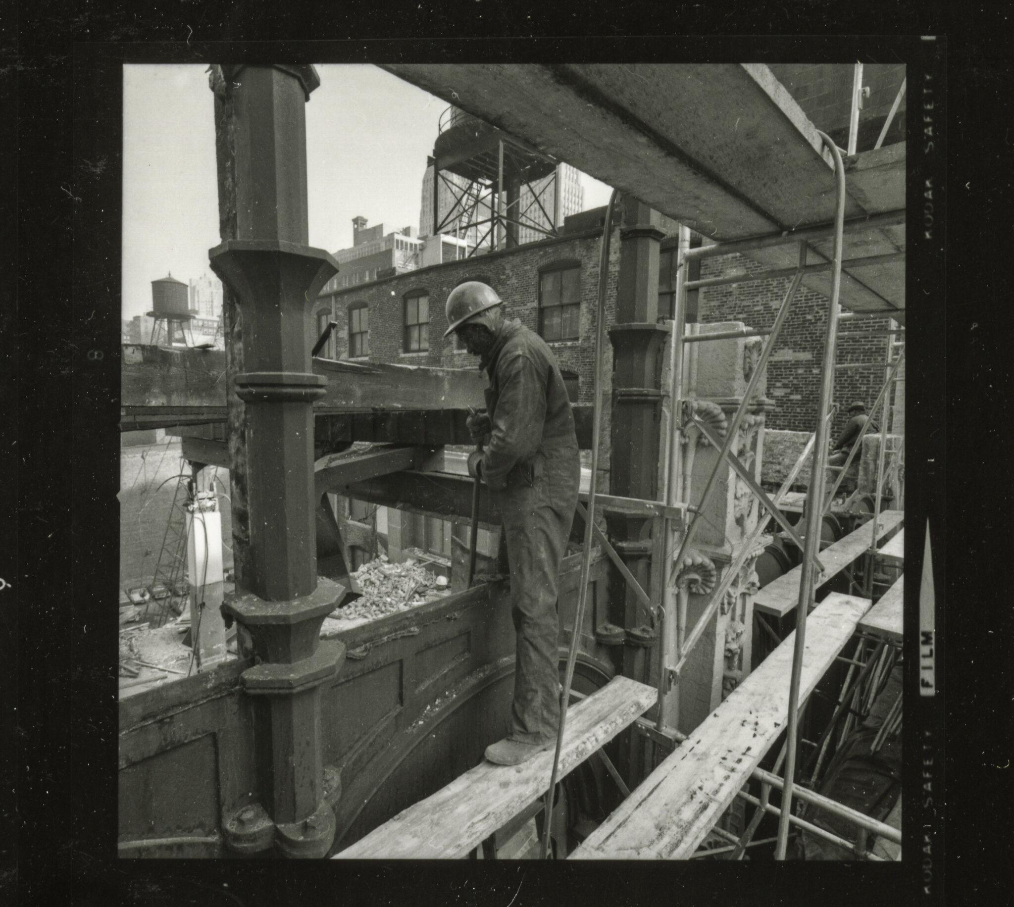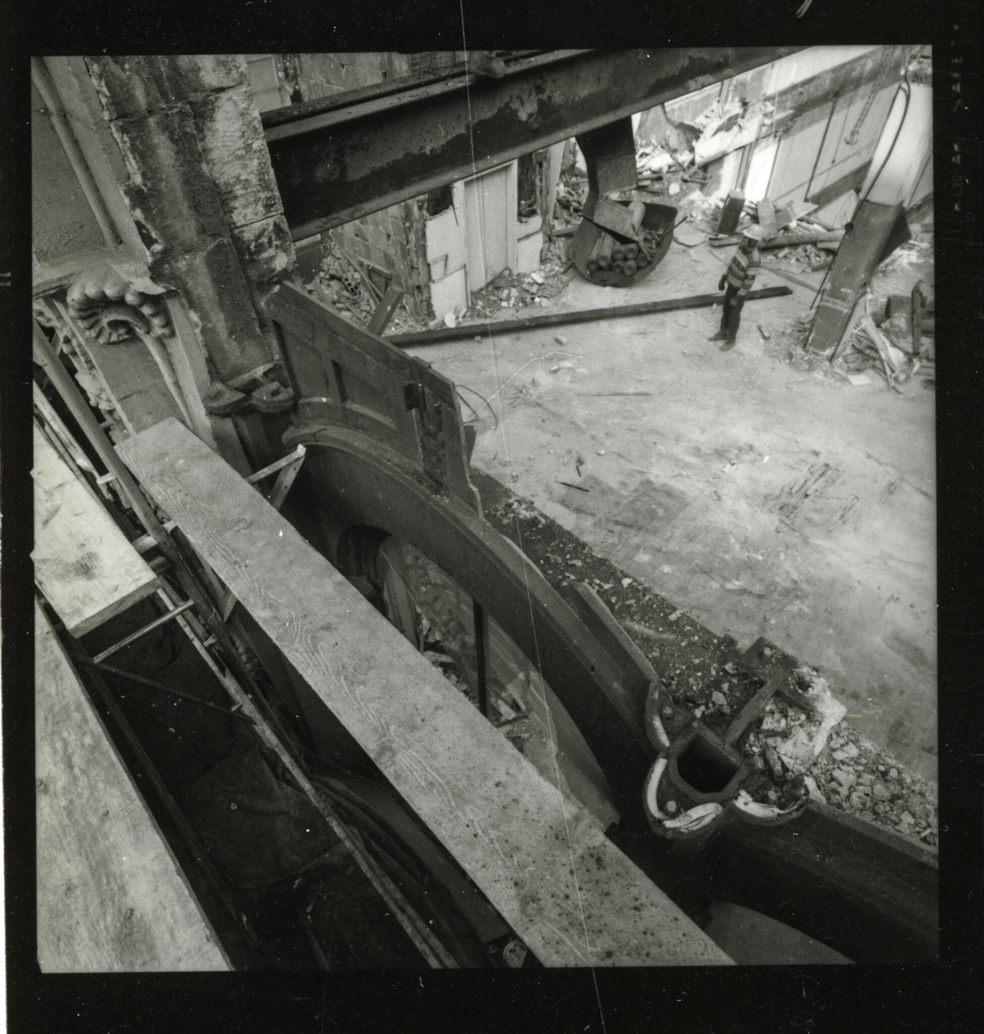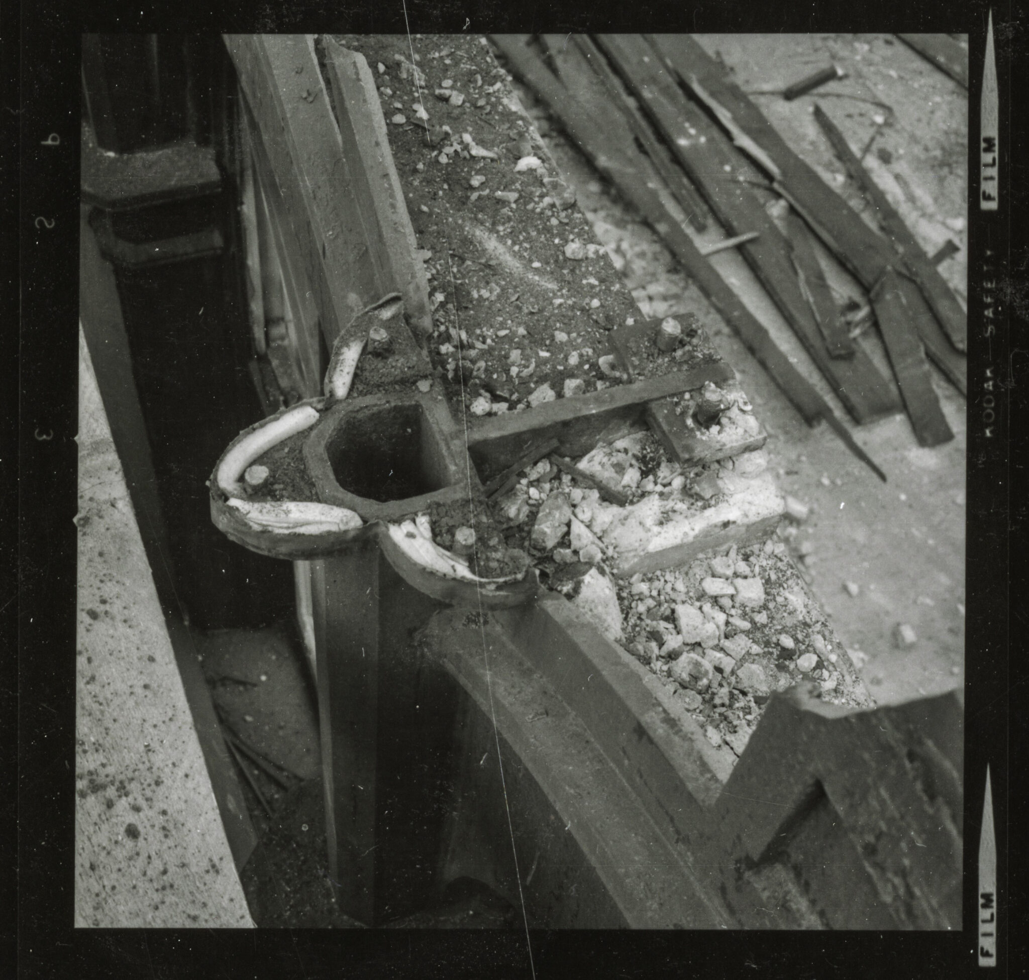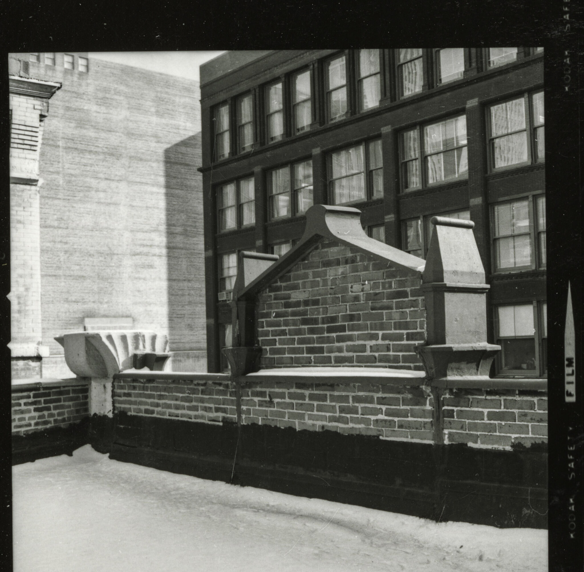 with unrestricted building access during demolition, nickel systematically documented the wreckers dismantle the limestone and cast iron cornice, including the removal of four panels he arranged to have saved for the art institute, edwardsville, and other institutions. the eight remaining iron panels and cornice sections were scrapped.