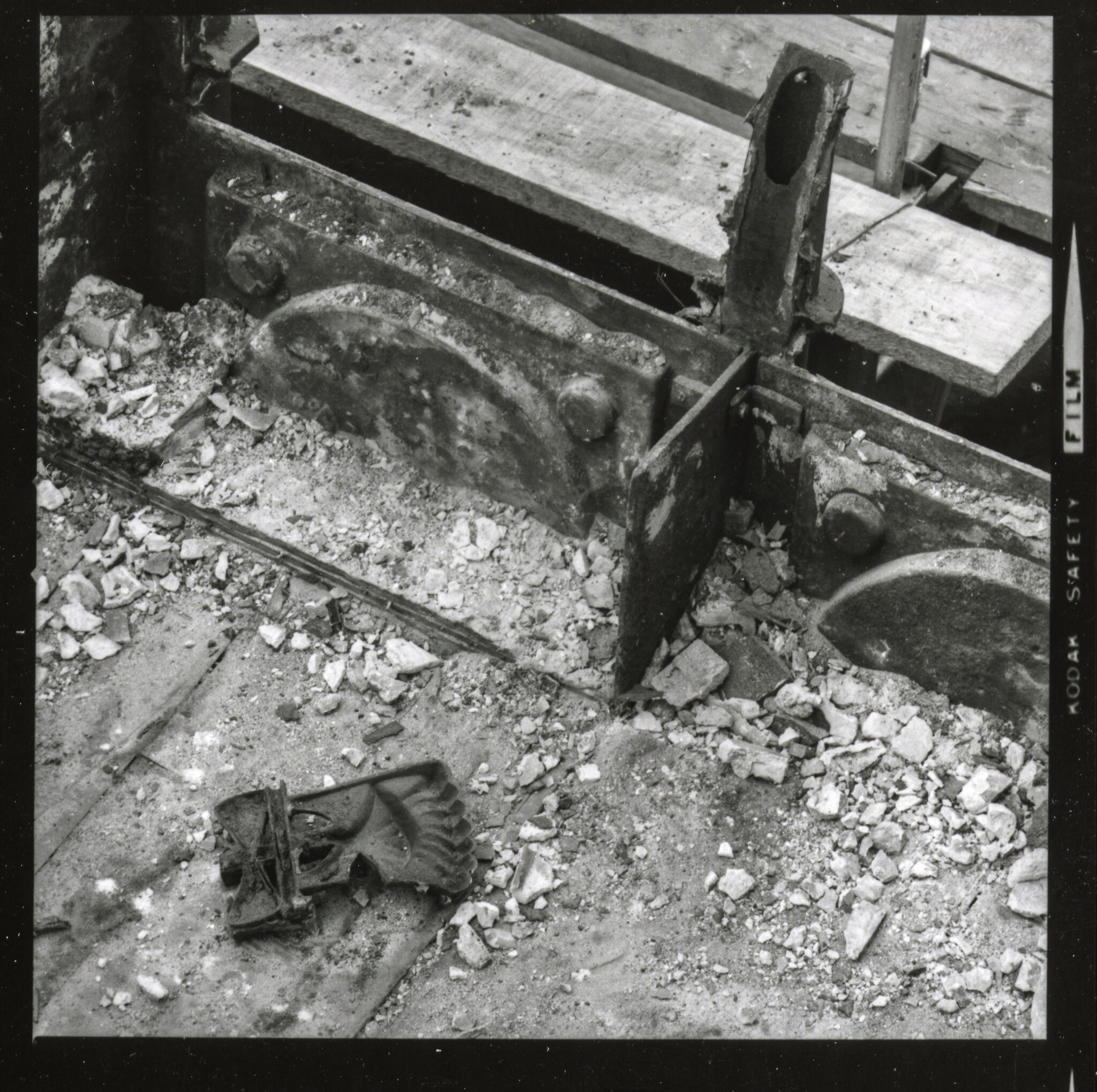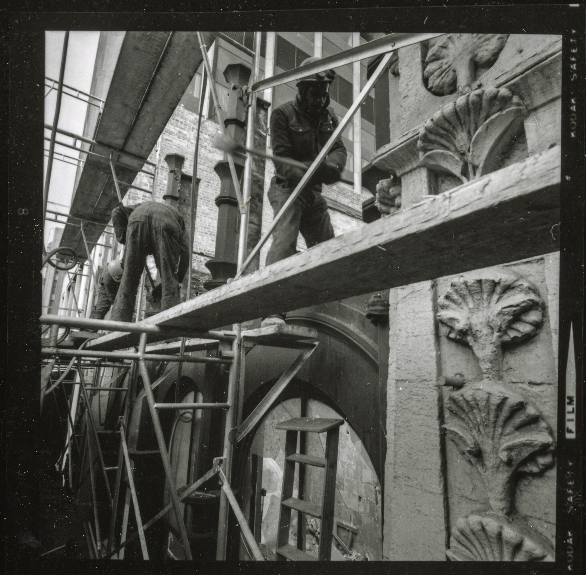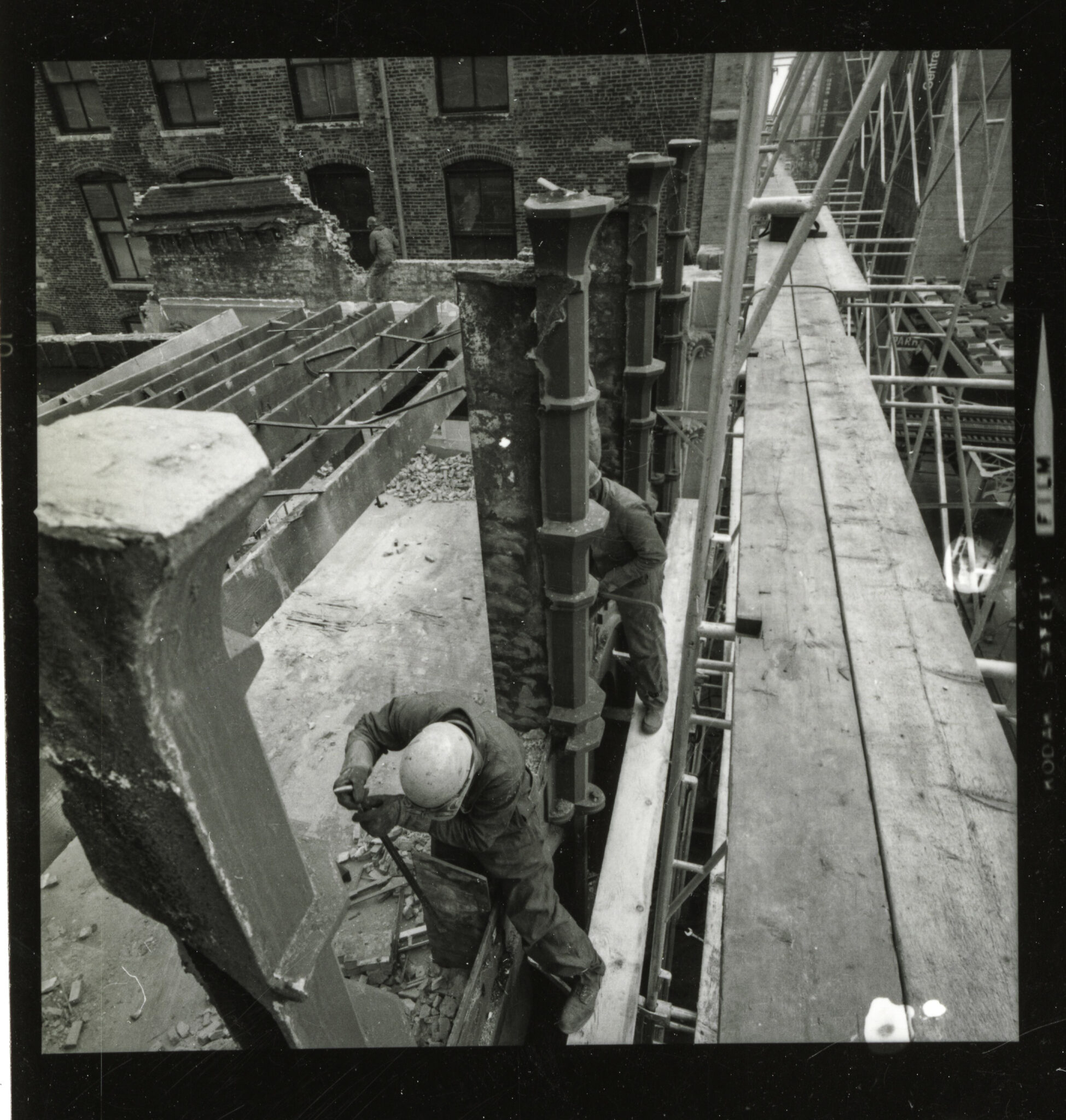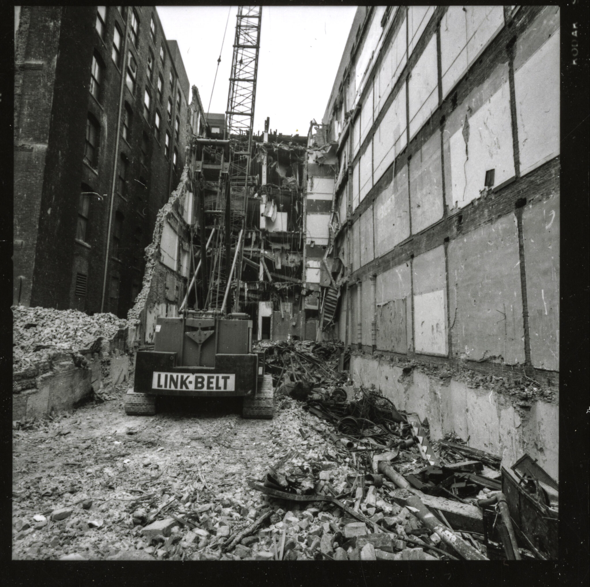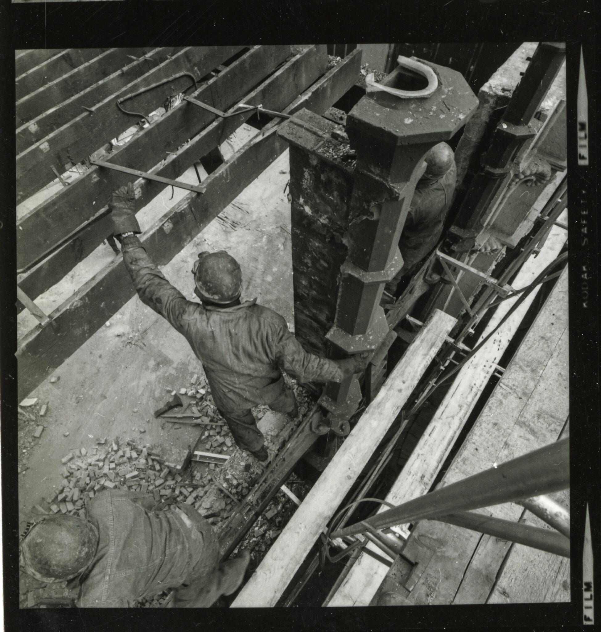with unrestricted building access during demolition, nickel systematically documented the wreckers dismantle the limestone and cast iron cornice, including the removal of four panels he arranged to have saved for the art institute, edwardsville, and other institutions. the eight remaining iron panels and cornice sections were scrapped.