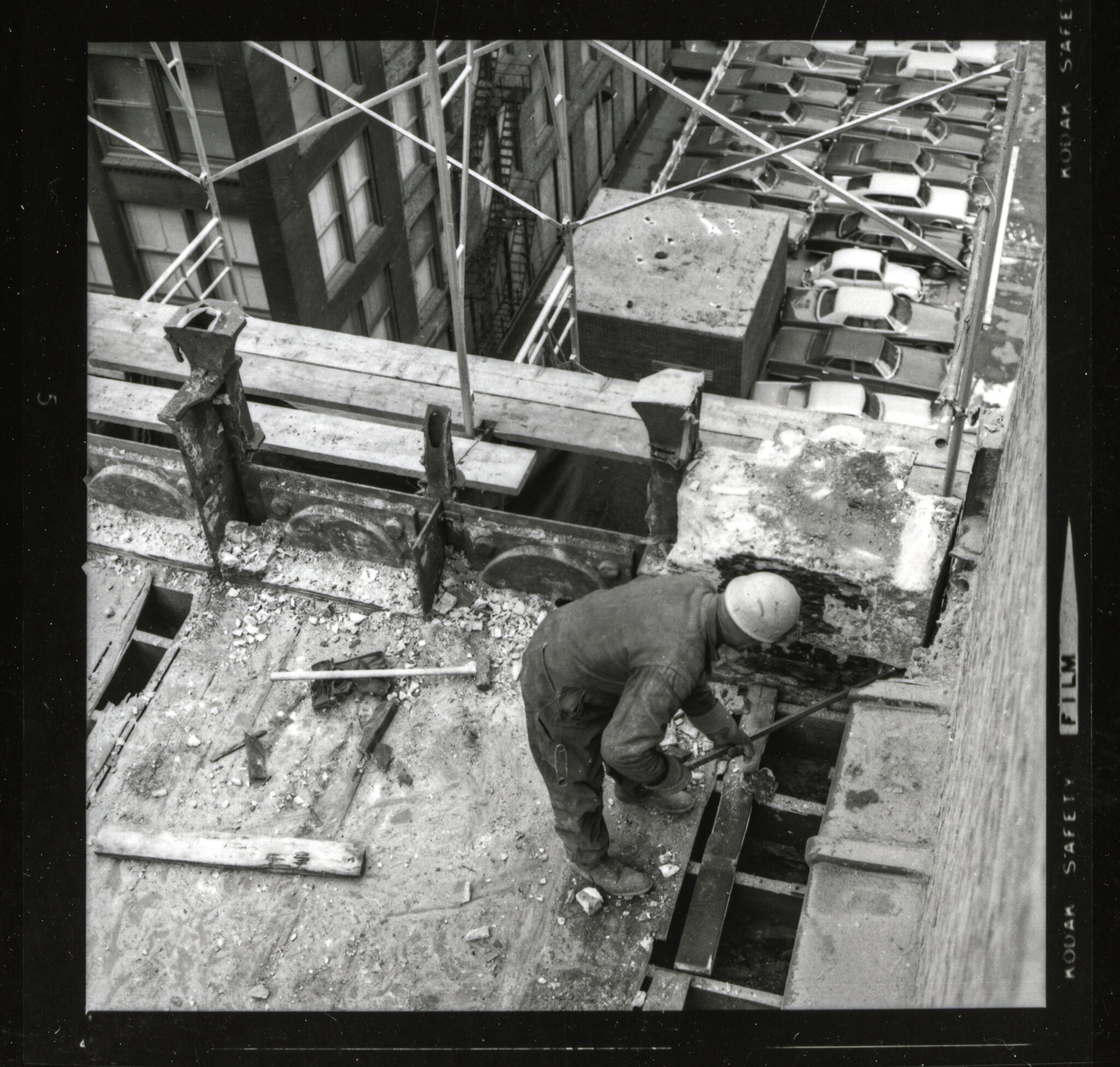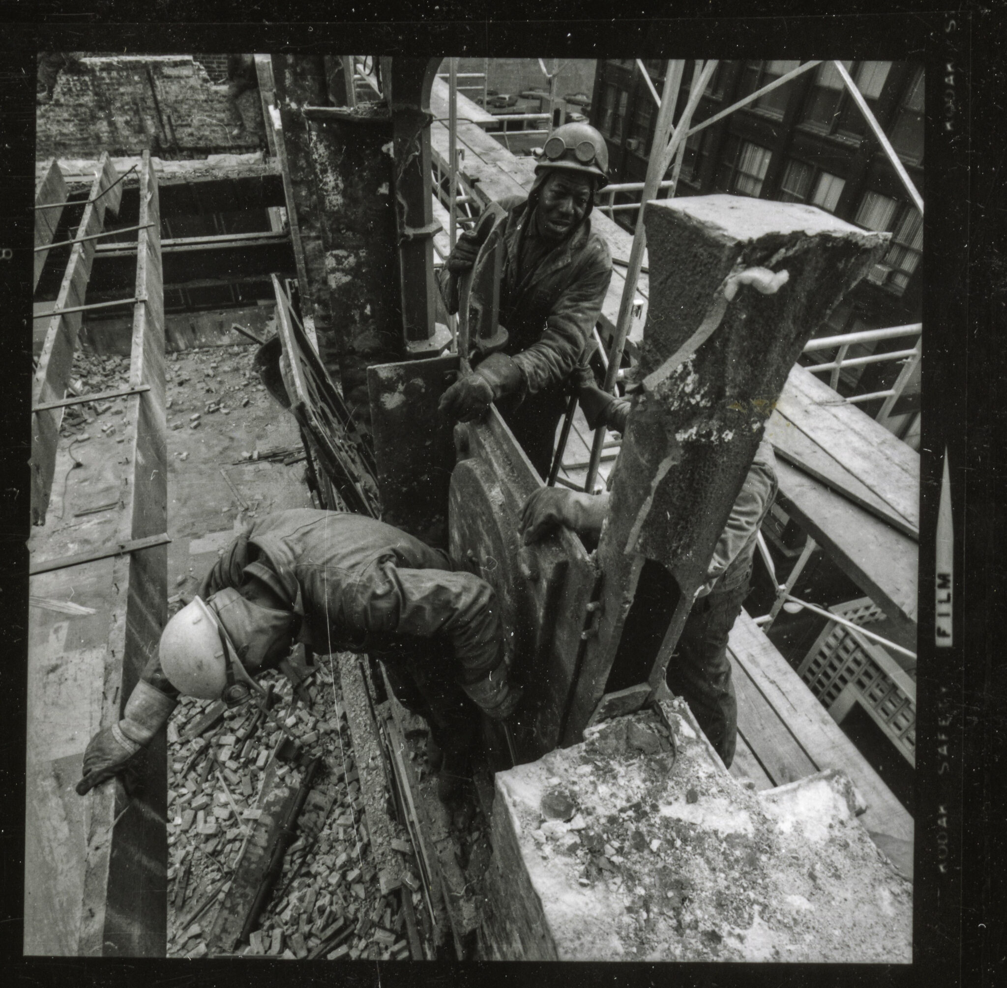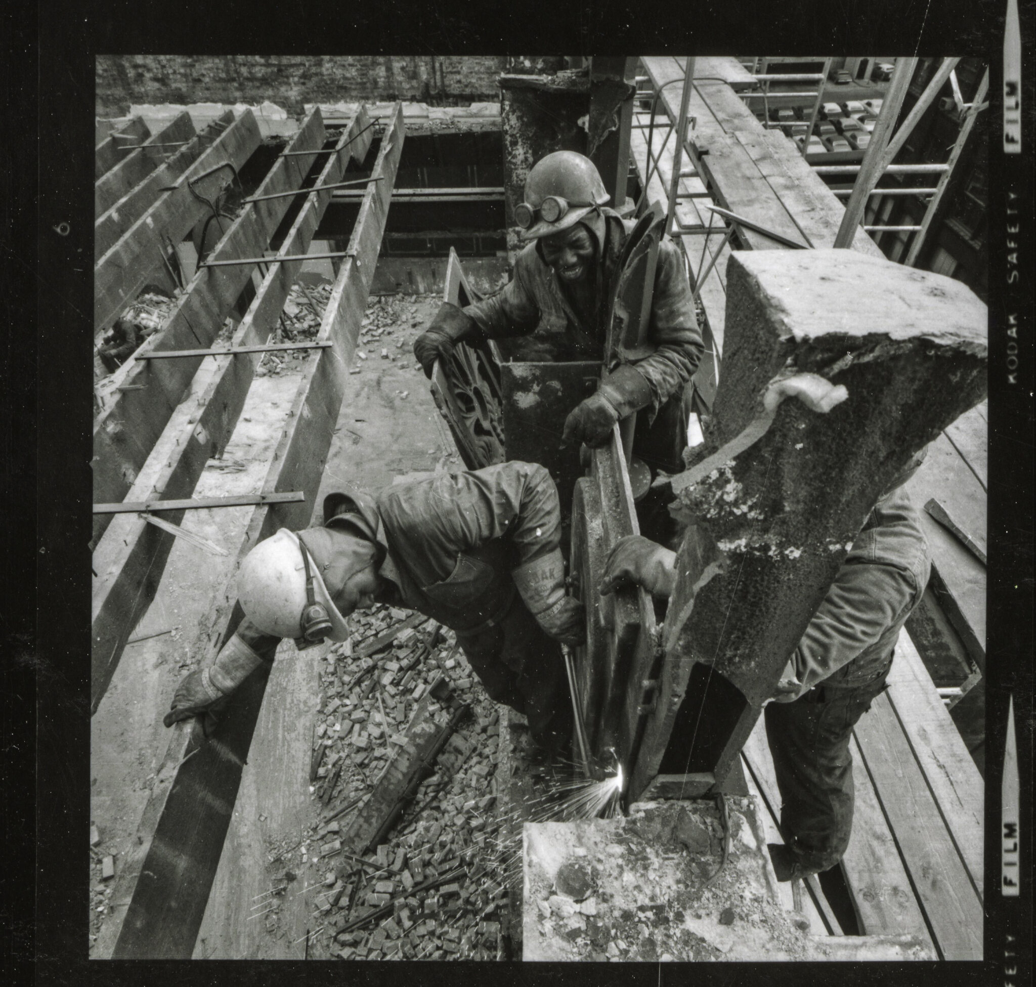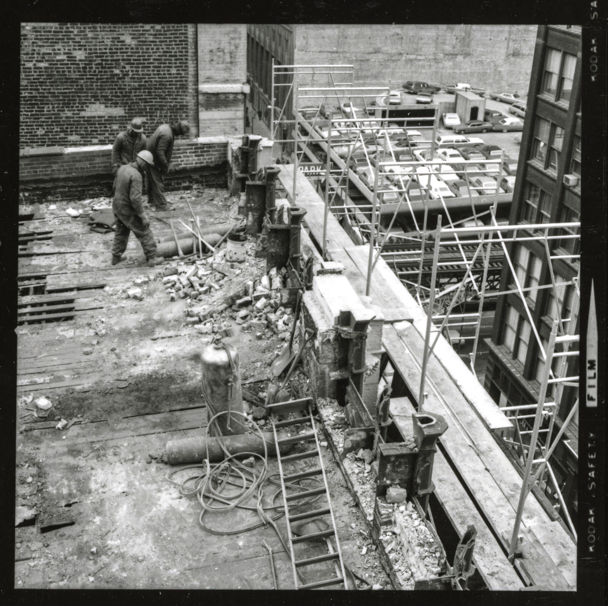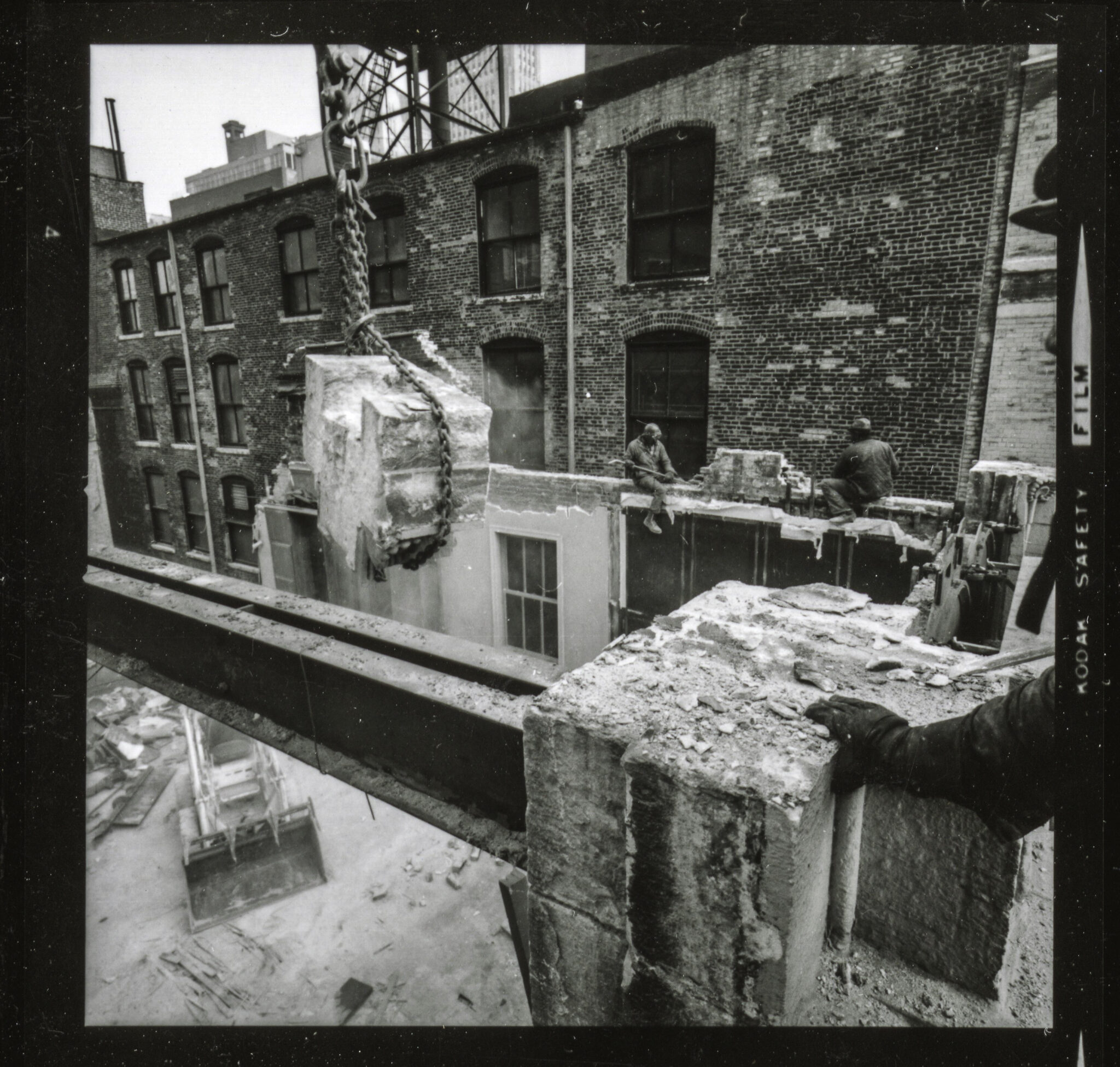 richard nickel images – selected from multiple contact sheets – showing the extraction of louis h. sullivan-designed cast iron spandrel panels from the 5-story rothschild building (1881) during its demolition in 1972.