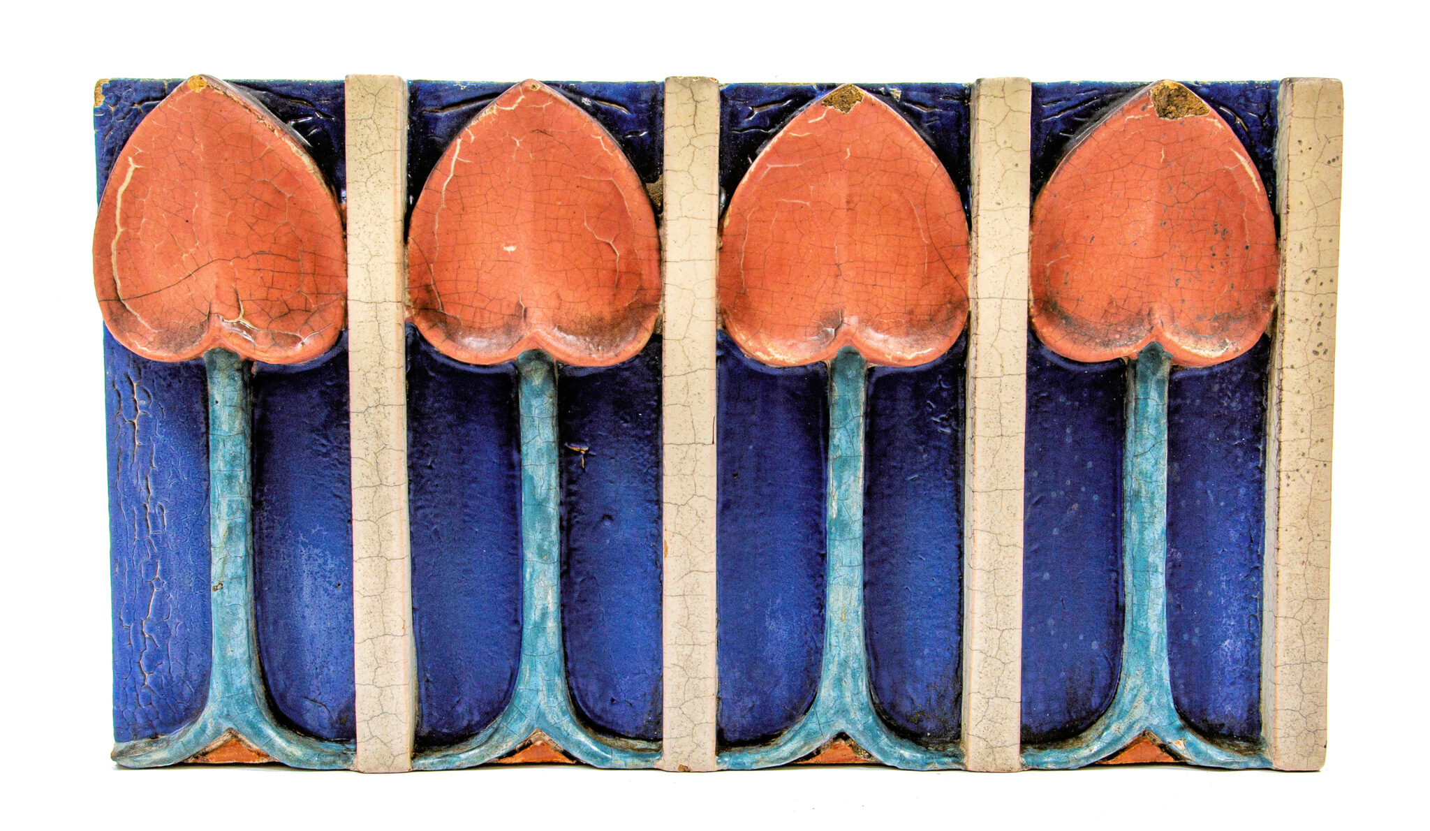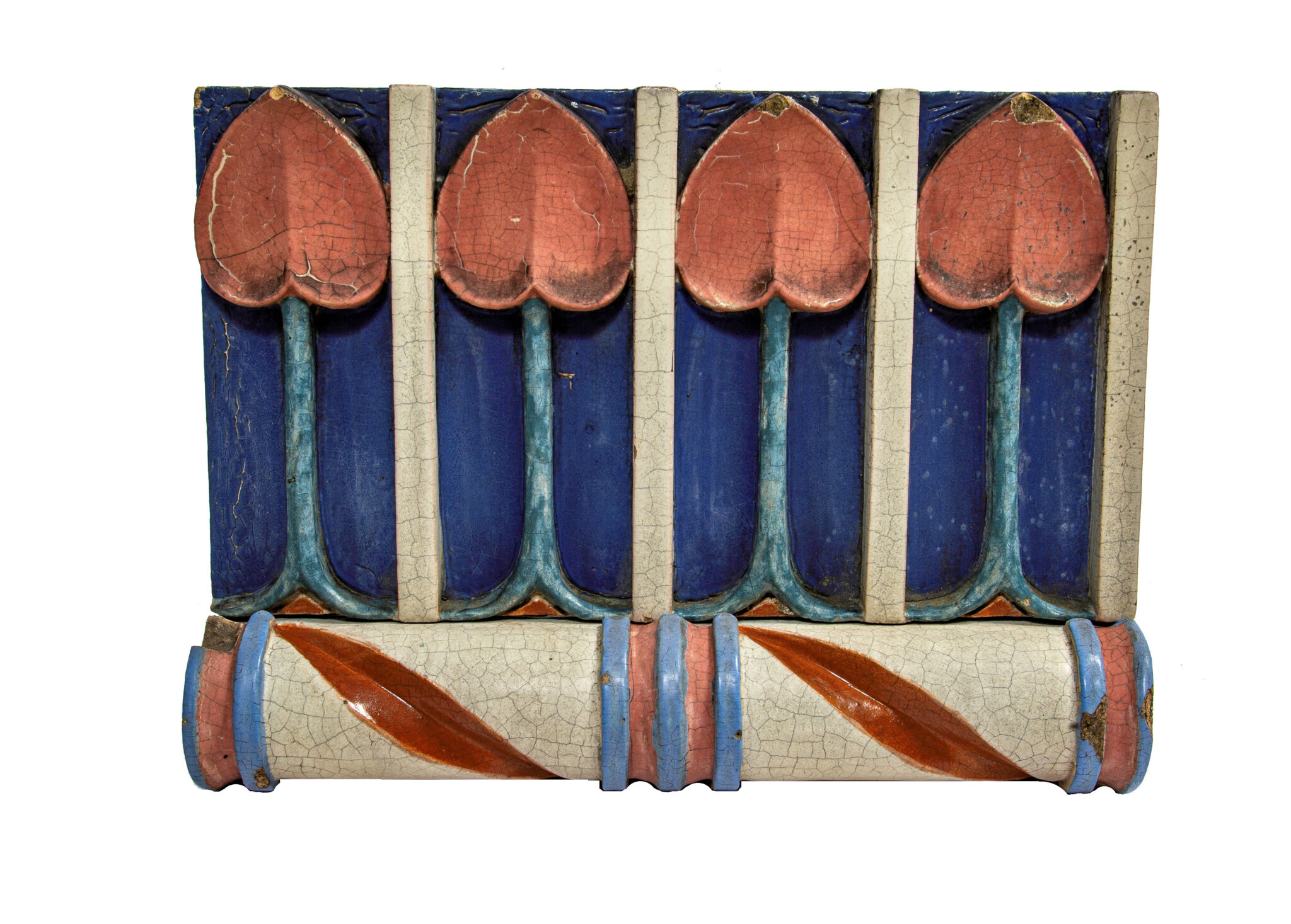 the fritz albert-designed terra cotta ornament exhibits brightly colored glazed egyptian revival-style elements in pastel pink, blue and a burnt orange.