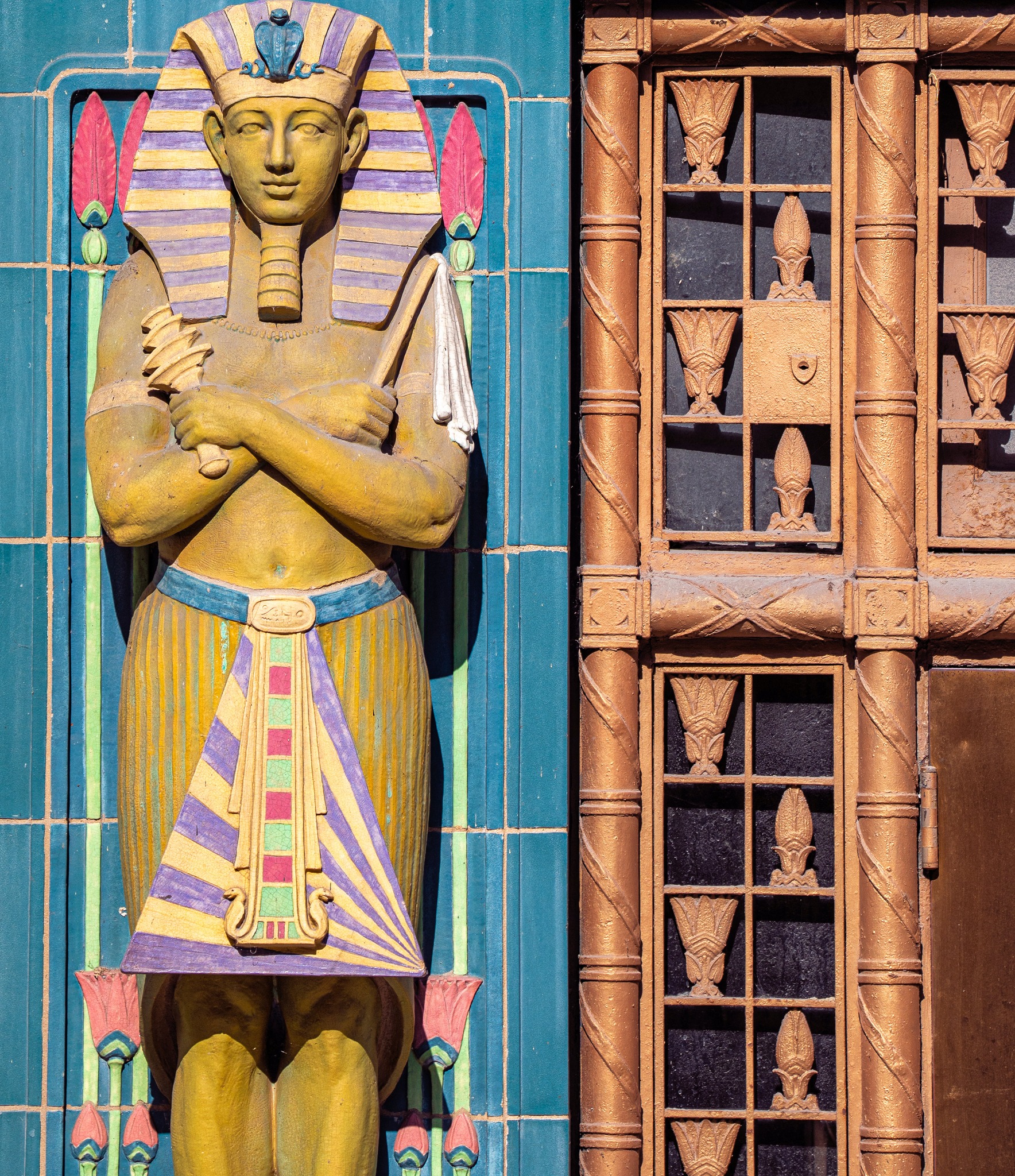 art deco was greatly influenced by this current too, and in particular, over 100 theaters were built and decorated to be egyptian revival. the reebie storage and moving building is unique in having incorporated explicit egyptian elements that were not only picturesque but attempting historical accuracy (it is thus dubbed academic-style egyptian revival) based on two ancient temples, dendera and edfu, the reebie building included ornamentation on the exterior, with columns that replicated a composite of those two structures. symbolism on the interior plaster and decor and on the facade allude to egyptian themes, as well as to the building’s use.