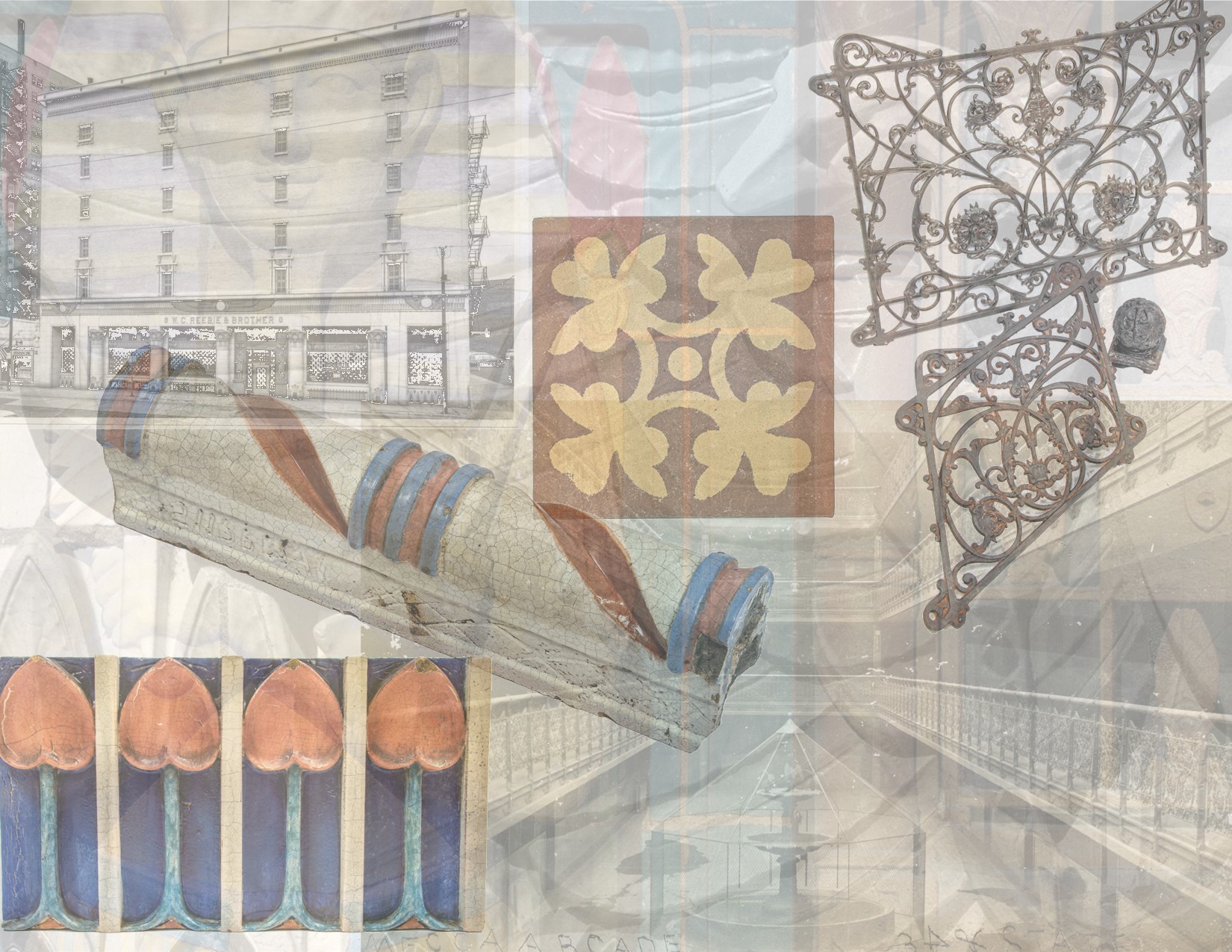 an original custom-designed, black enameled ornamental cast iron interior angled staircase baluster and basement encaustic floor tile – salvaged from edbrooke and burnham’s mecca hotel or flats (1892) during its untimely demolition in 1952 –  joined the bldg. 51 museum last month.