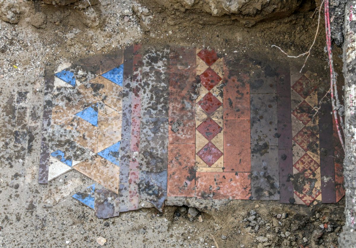 an original custom-designed, black enameled ornamental cast iron interior angled staircase baluster and basement encaustic floor tile – salvaged from edbrooke and burnham’s mecca hotel or flats (1892) during its untimely demolition in 1952 –  joined the bldg. 51 museum last month.