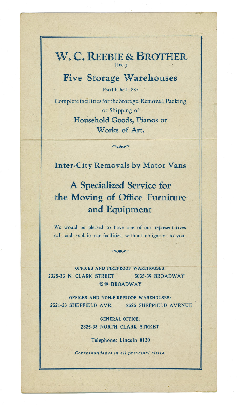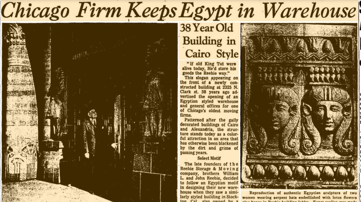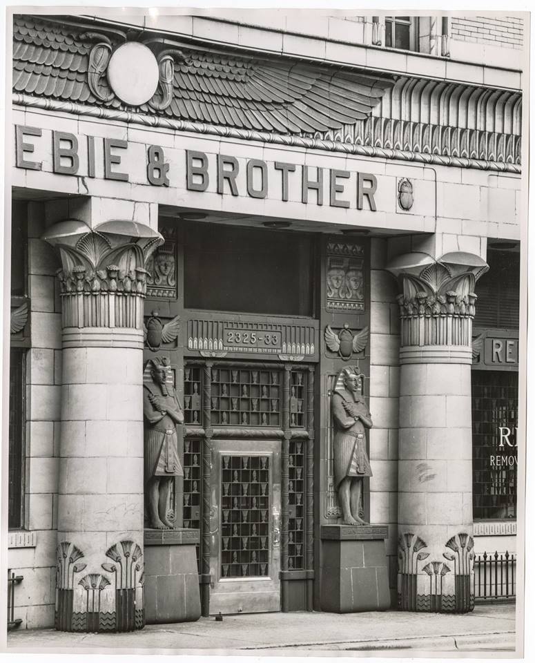 reebie storage and moving was founded in 1880 by william reebie, who was later joined by his brother john. it still operates out of the same building, with a sphinx in their logo. the reebie structure was built in 1922, less than a year after the discovery of tutankhamen’s tomb. in the wake of this and several other archaeological discoveries, there arose a strong wave of interest in egyptology. though egyptian inspired architecture had arrived to america in the early 19th century, it wasn’t until the 1920’s that public fascination permeated arts and crafts fields as well as architecture, with buildings and decorative objects utilizing symbolism of the ancient civilization.