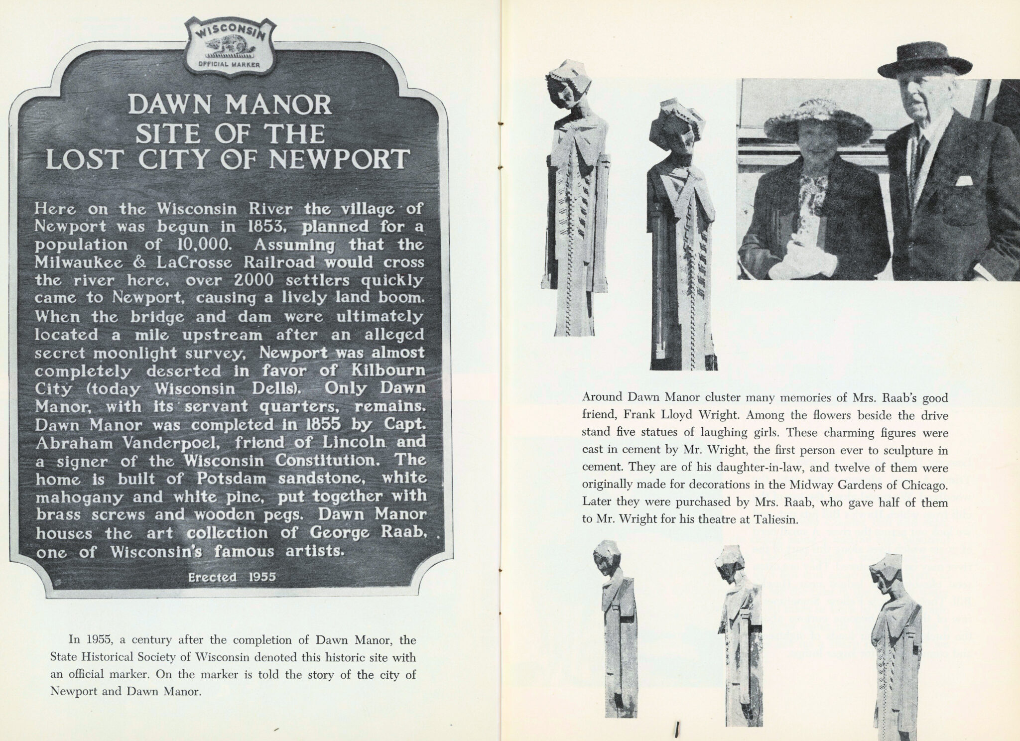 a 1955 duck boat booklet includes pictures of midway gardens sprites and frank lloyd wright together with madame helen raab, who bought dawn manor from newman.