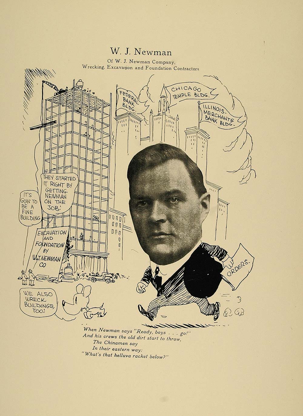 during the late 19th and early 20th century, william j. newman’s excavation and wrecking company demolished several chicago buildings including jenney’s home insurance building (1885-1931), chicago city hall (1885-1905), boyington’s board of trade building (1882-1929) and wright’s midway gardens (1914-1929).