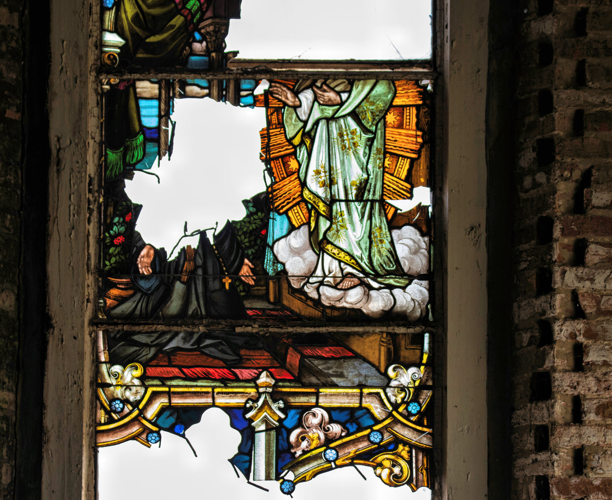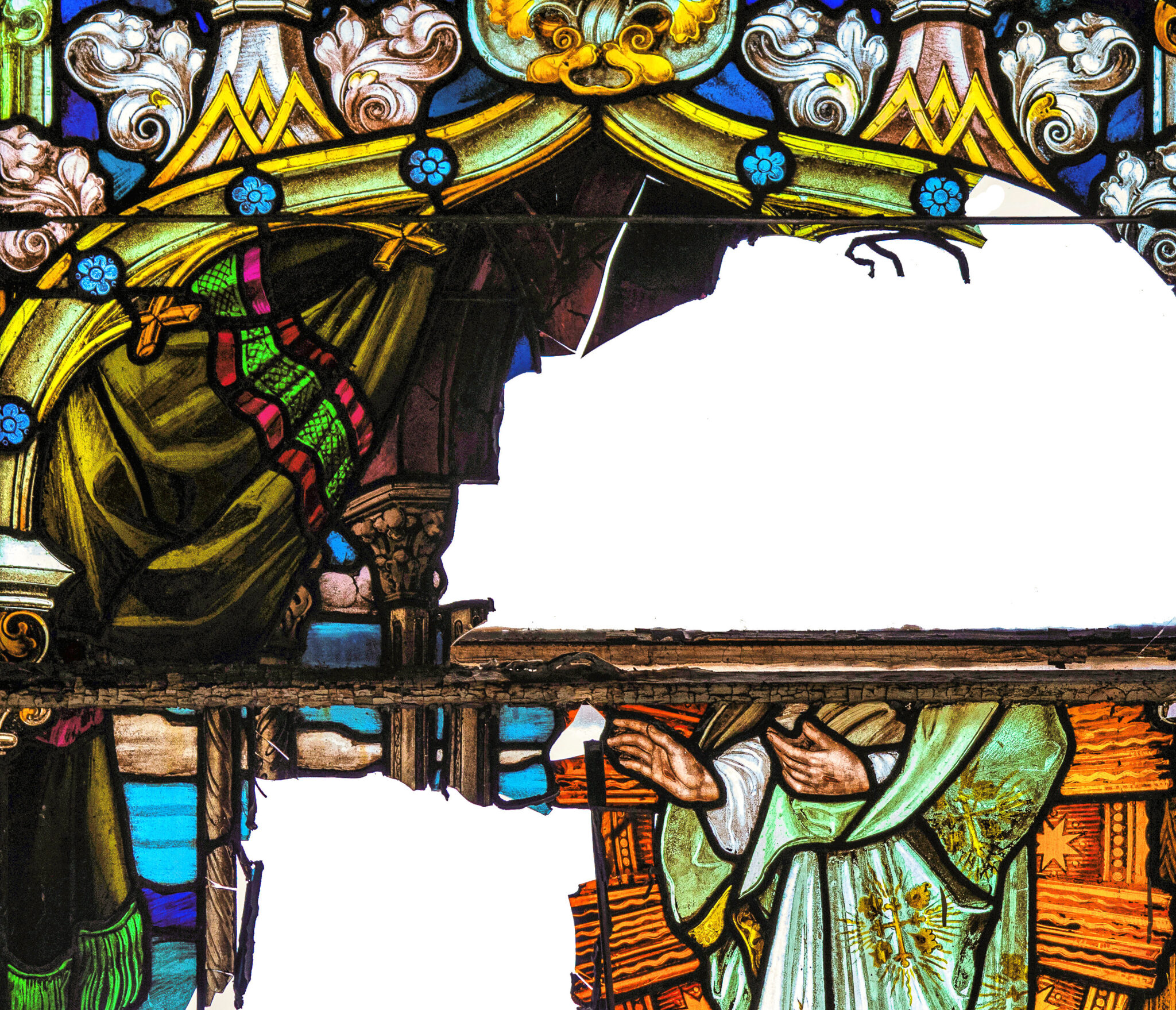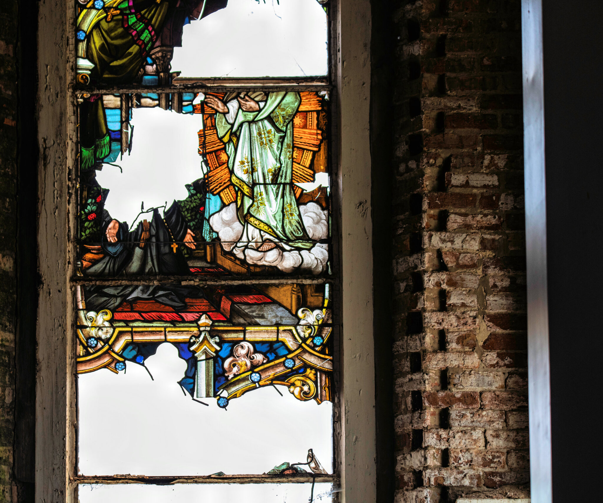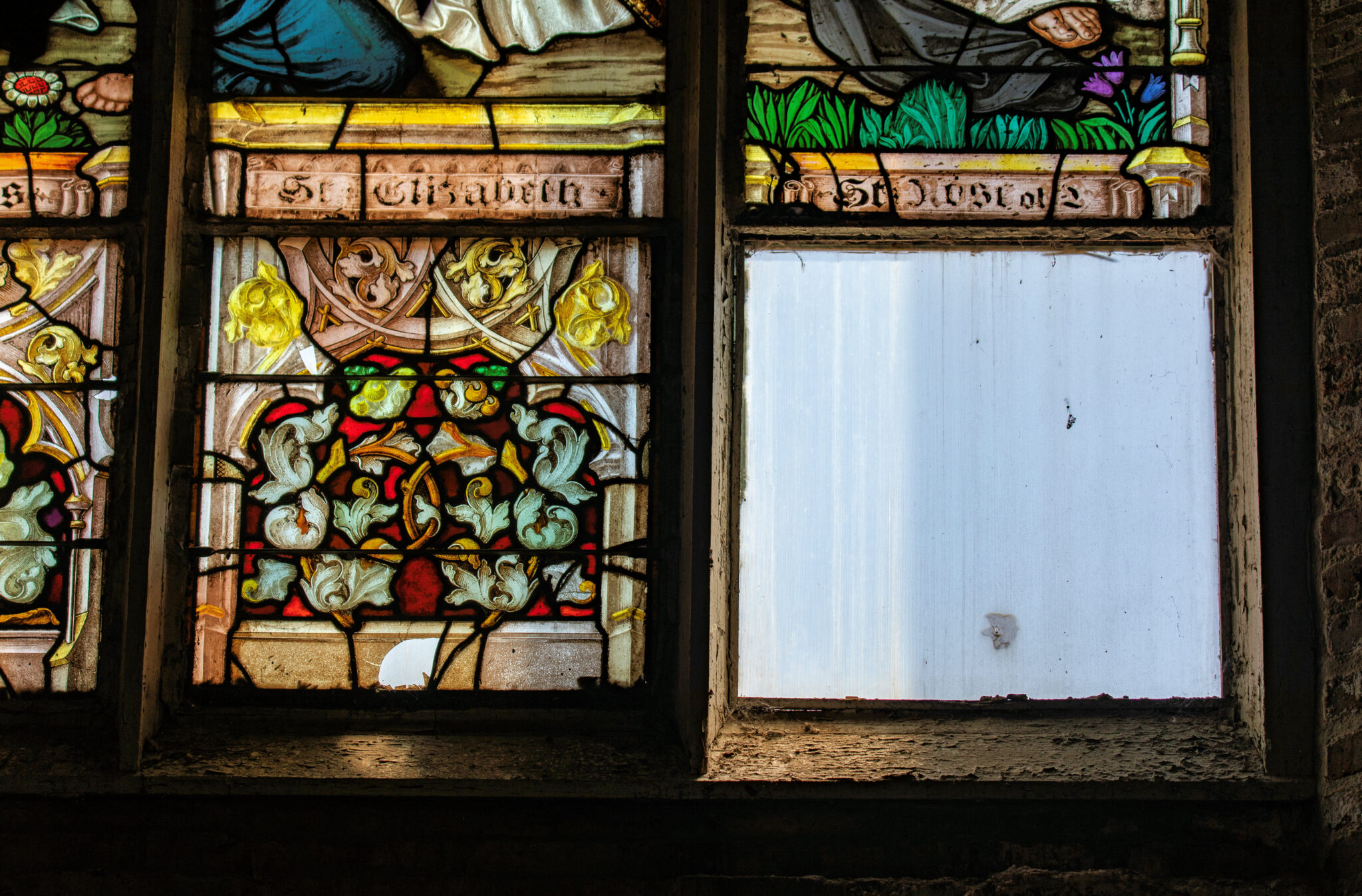 detailed photographic documentation of leaded glass windows within henry j. schlack’s endangered gothic style st. martin of tours german catholic church (1895), located at 5848 south princeton avenue, chicago, il.