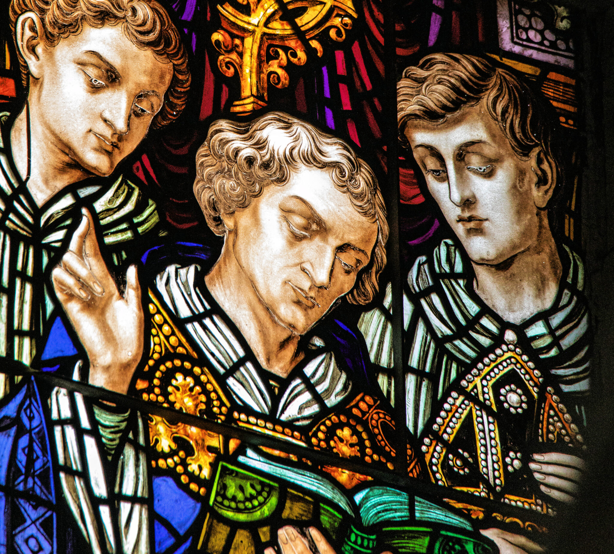 the “munich style” leaded art glass windows were likely executed by zettler studios.