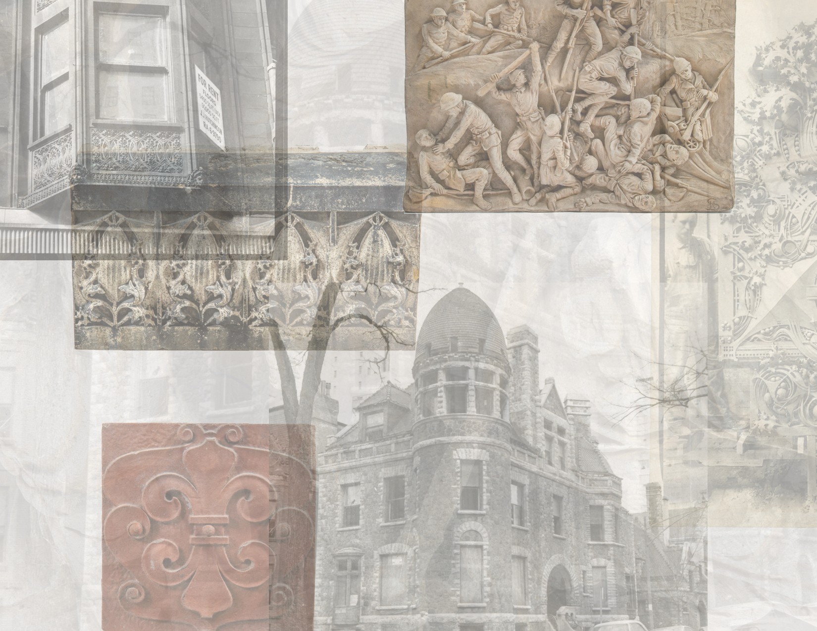 salvaged ornament from wheelock’s western book methodist, burnham and root’s ayer house, and a kristian schneider model join bld. 51 museum collection