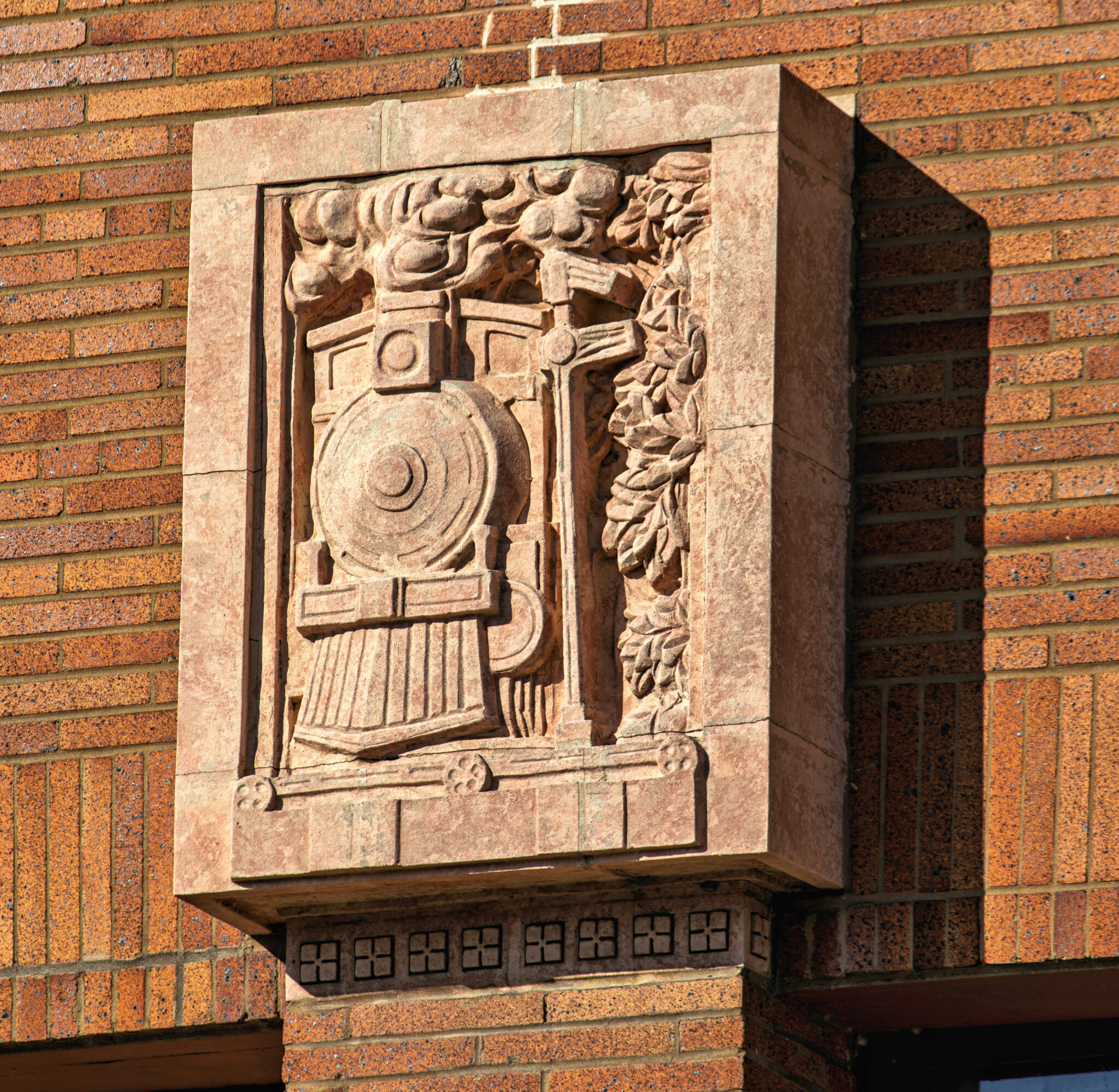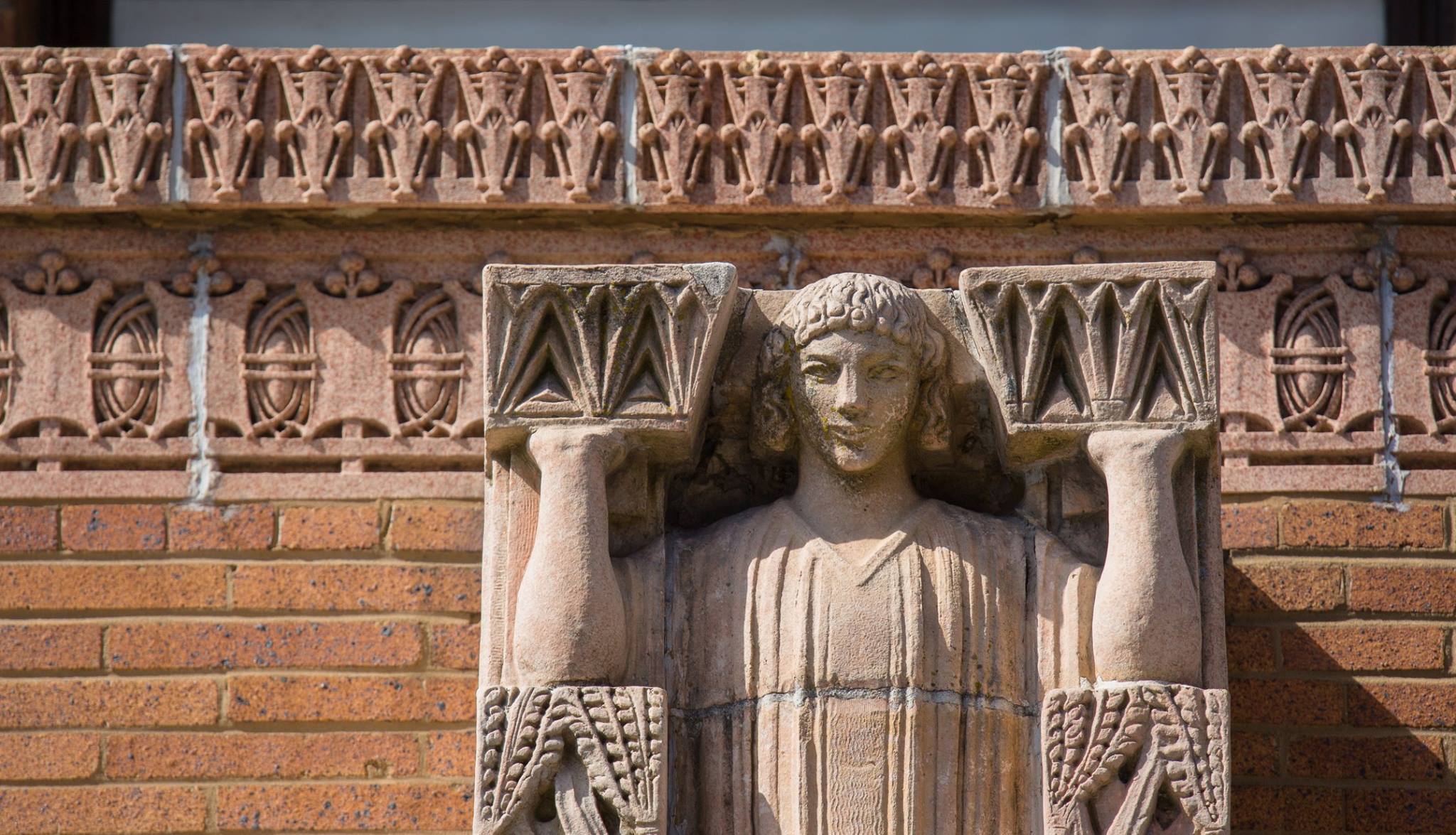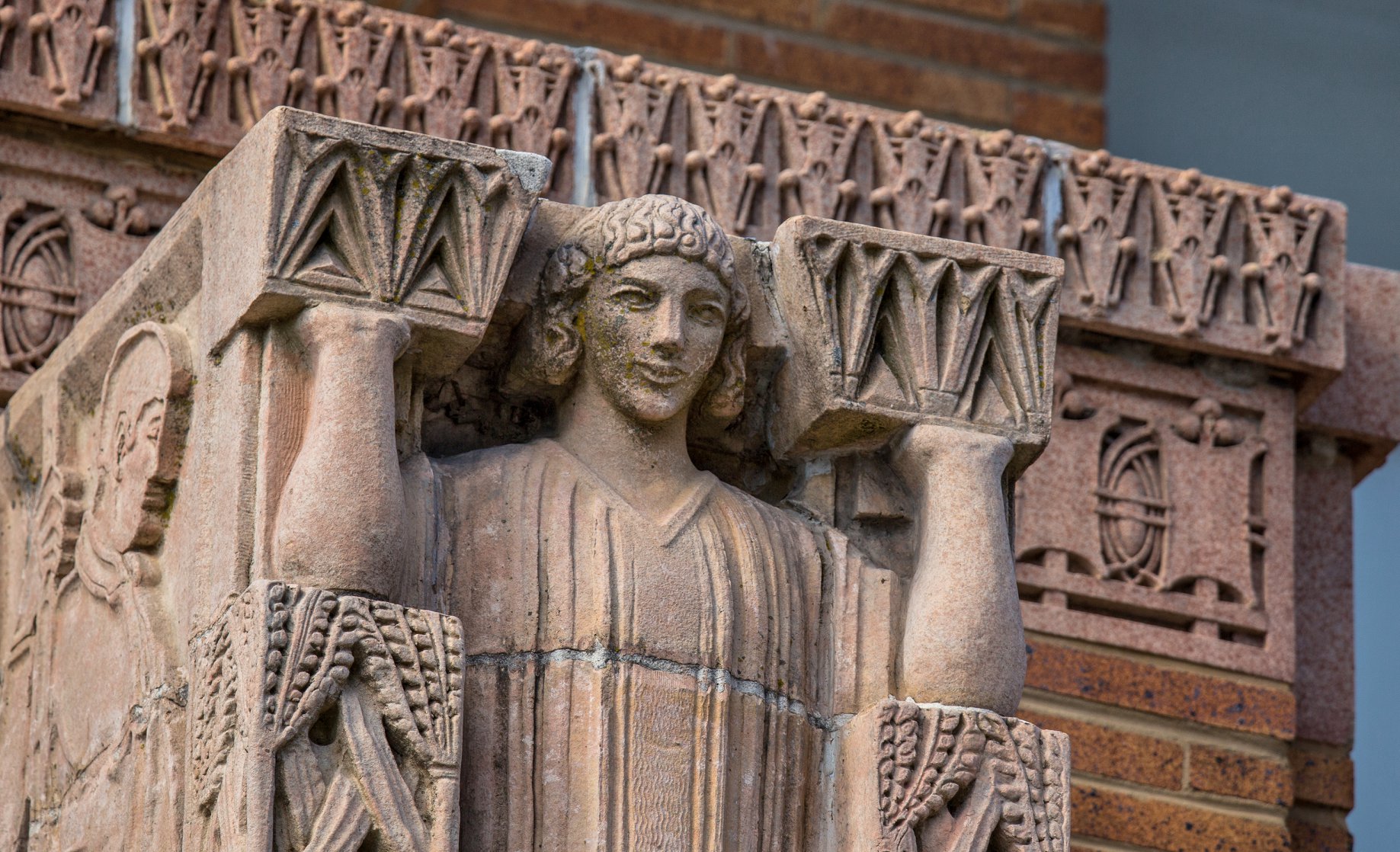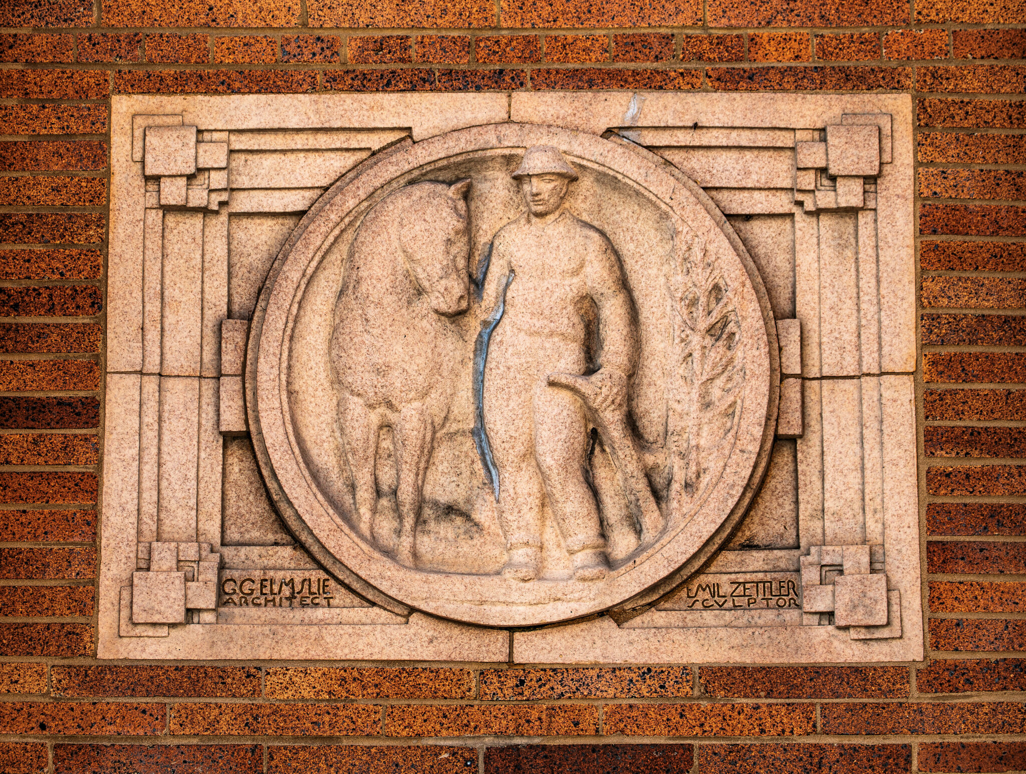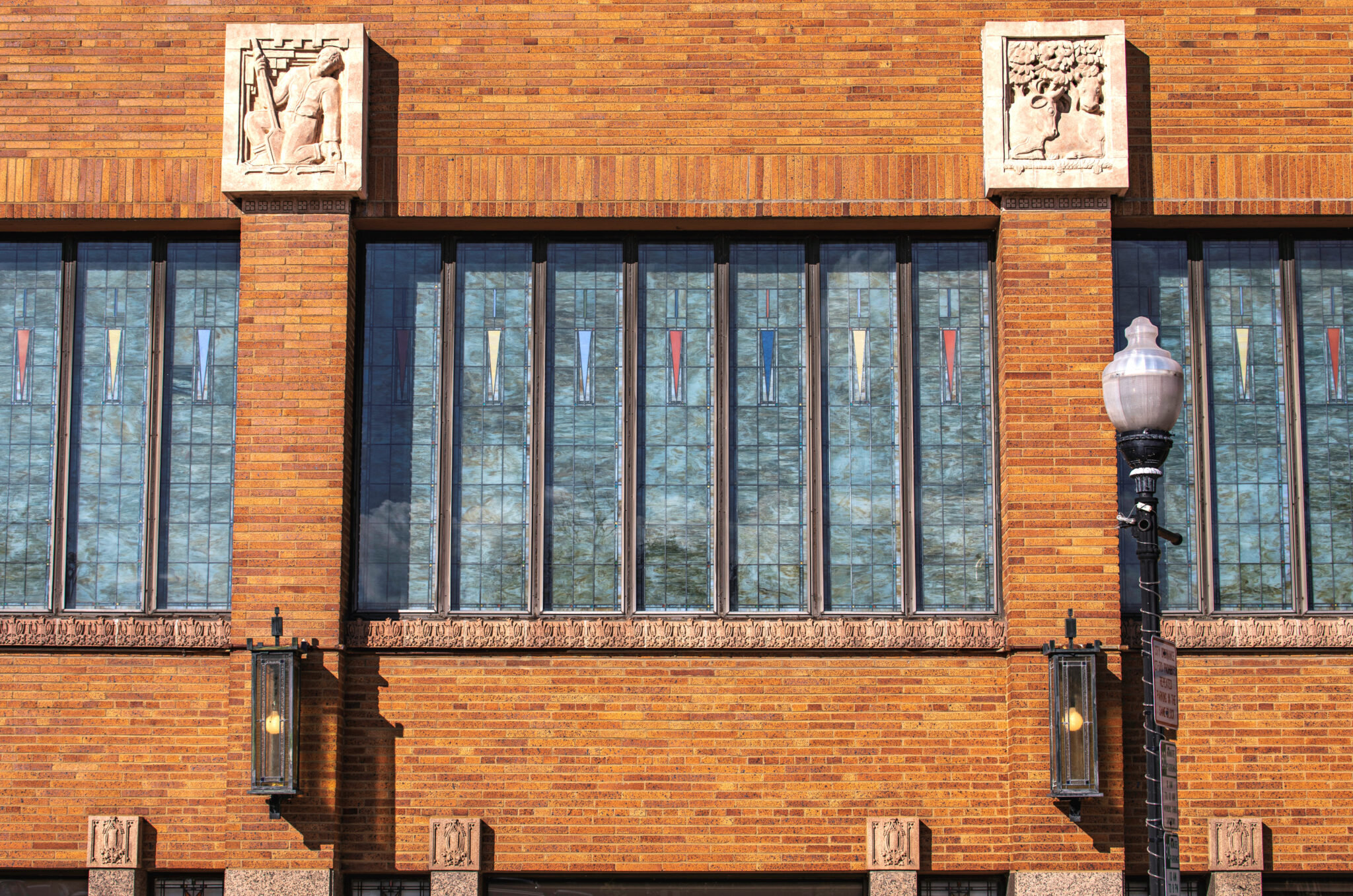 the sculptures were executed emil r. zettler. kristian schneider sculpted the mottled glazed terra cotta, fabricated by the short-lived advance terra cotta company (later purchased by the northwestern terra cotta company).