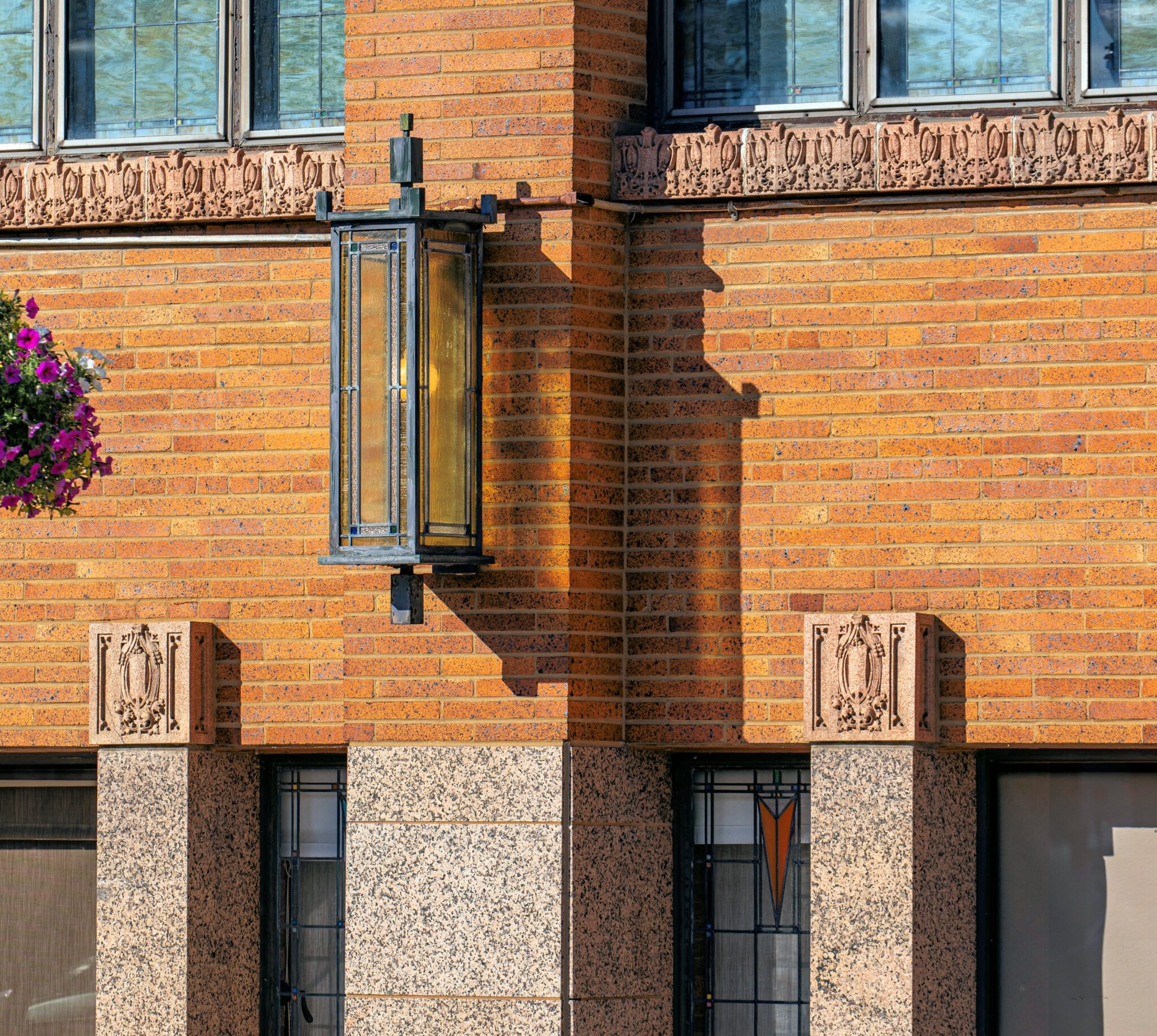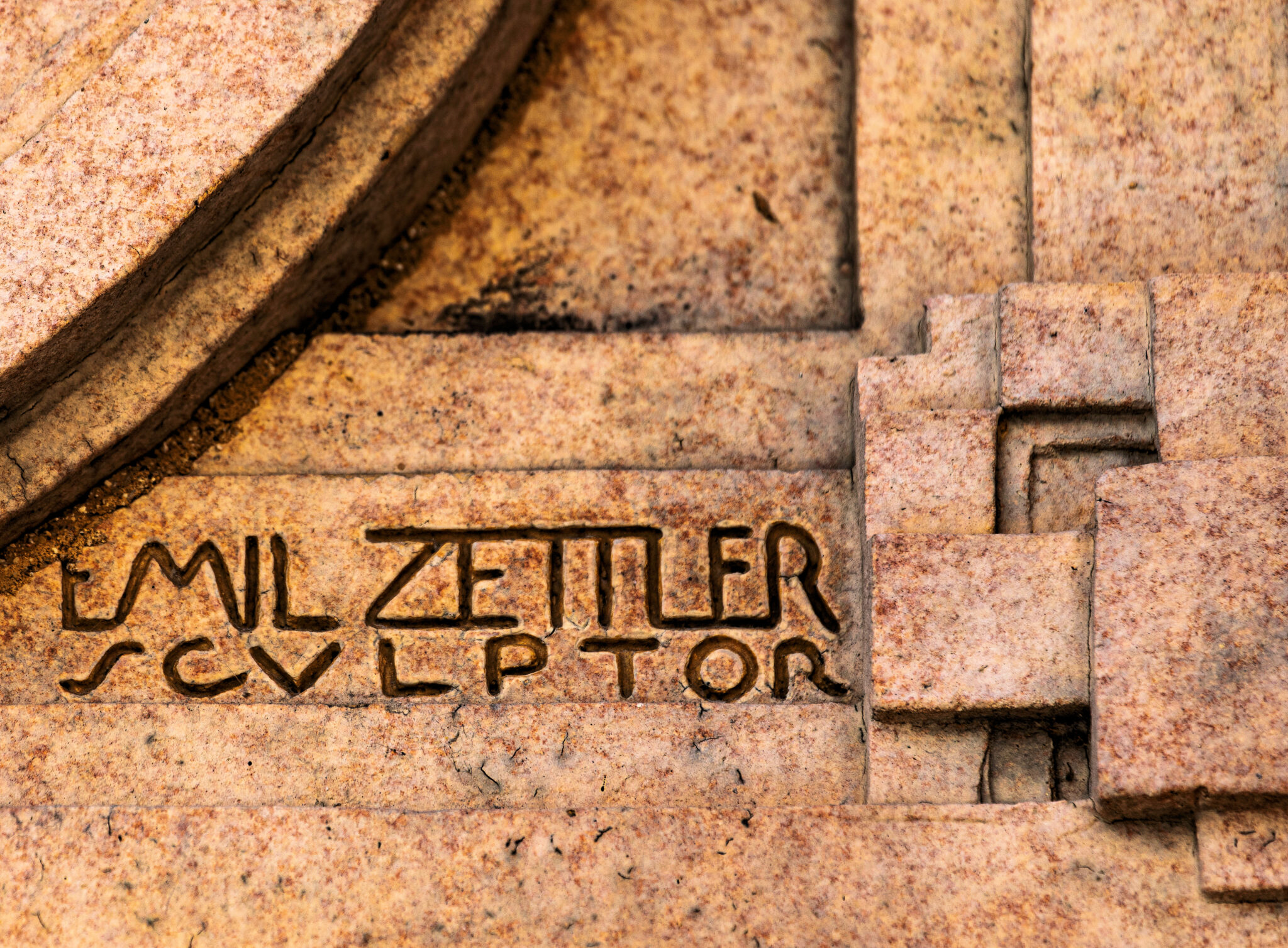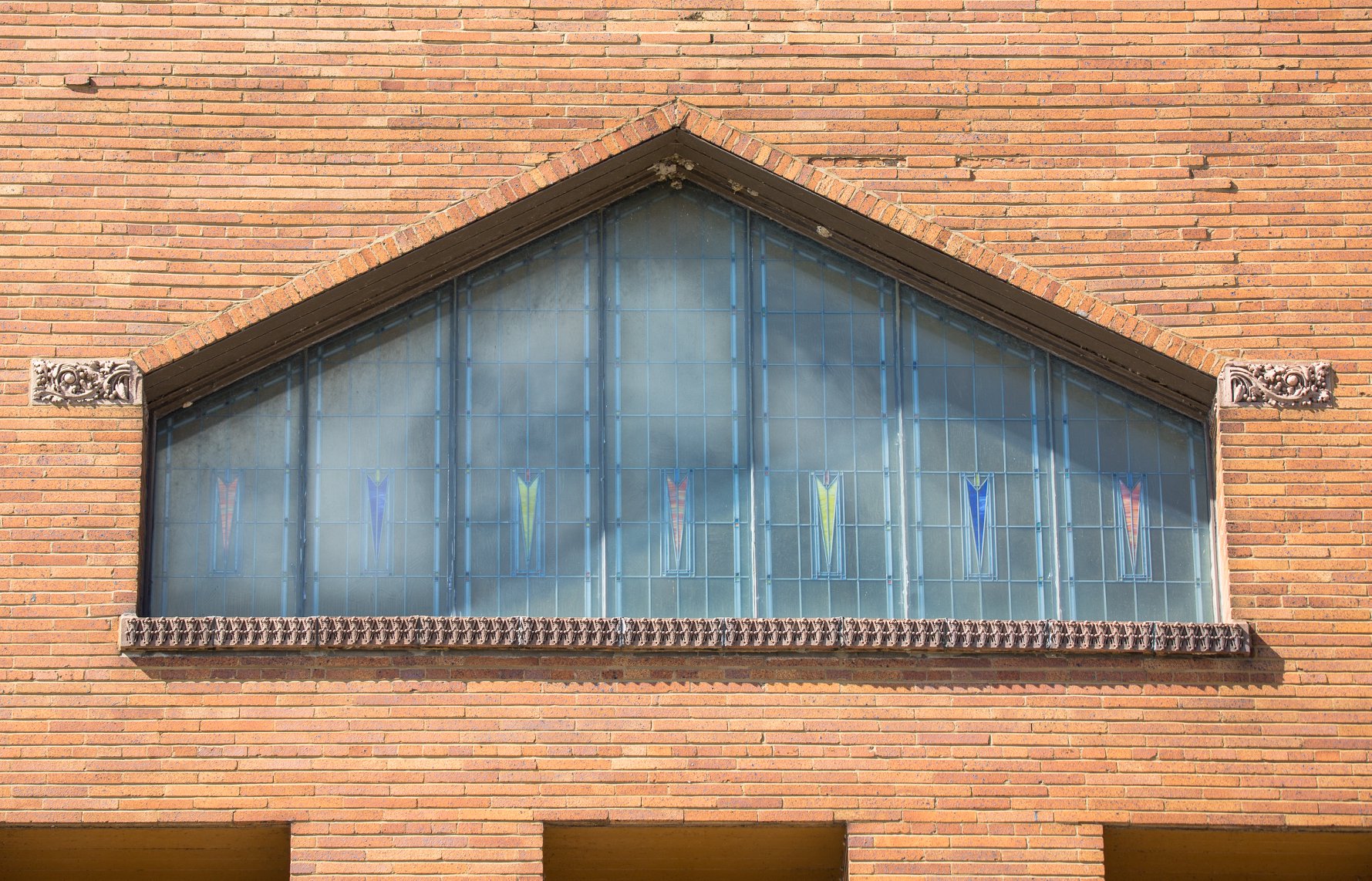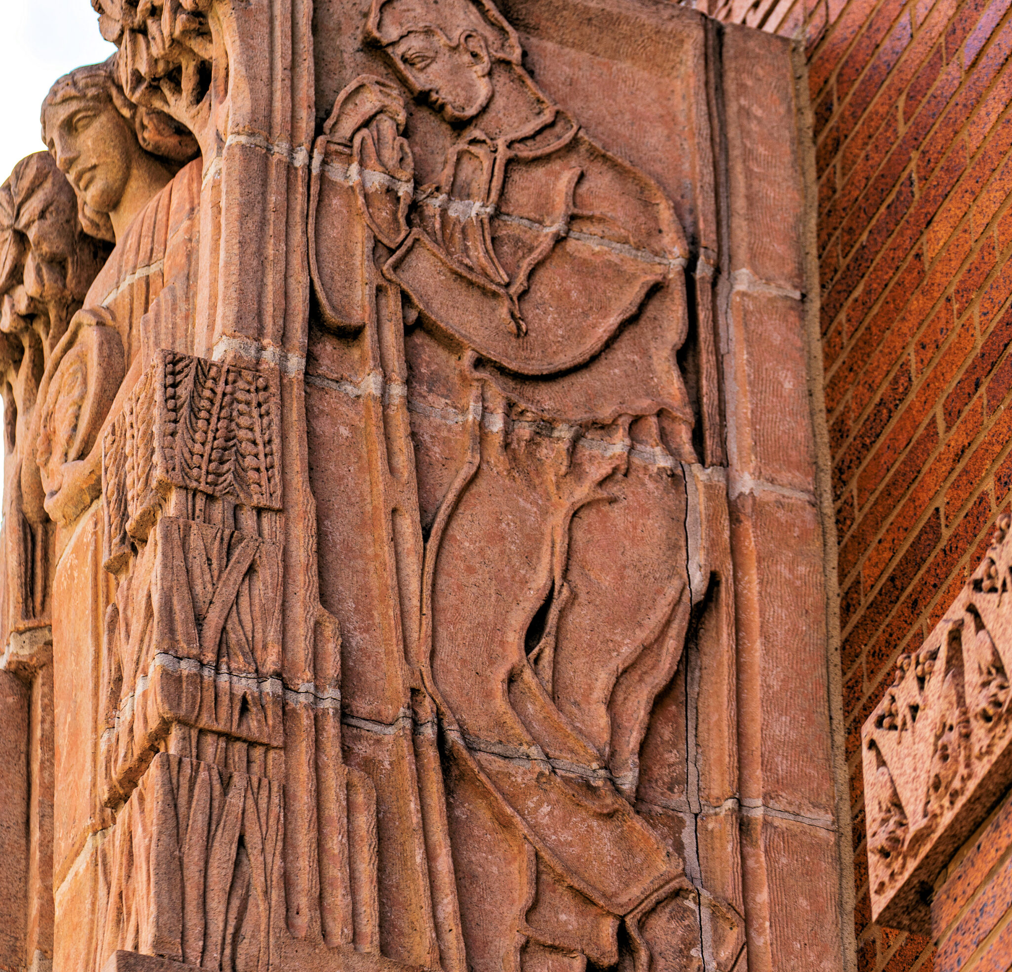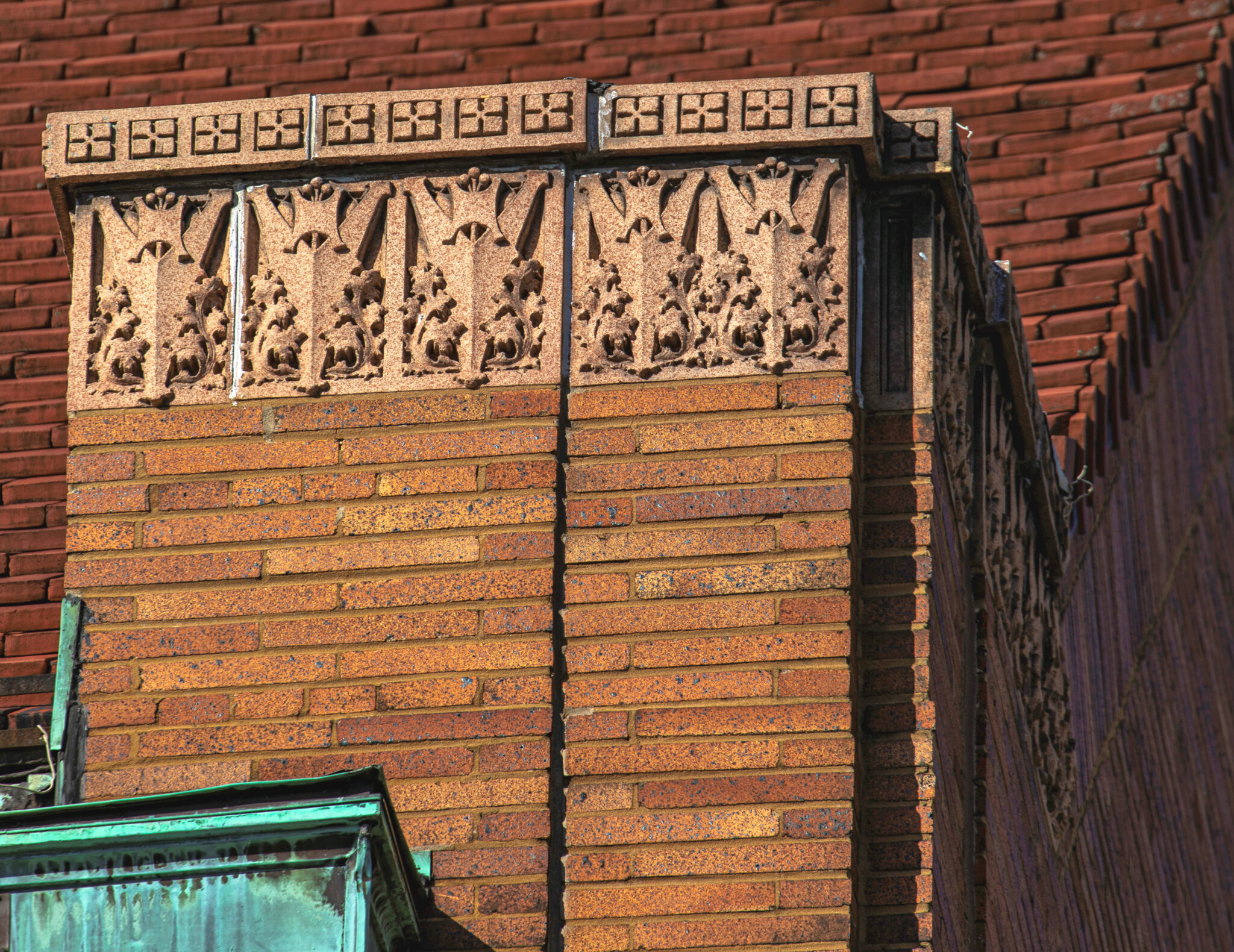 the sculptures were executed emil r. zettler. kristian schneider sculpted the mottled glazed terra cotta, fabricated by the short-lived advance terra cotta company (later purchased by the northwestern terra cotta company).