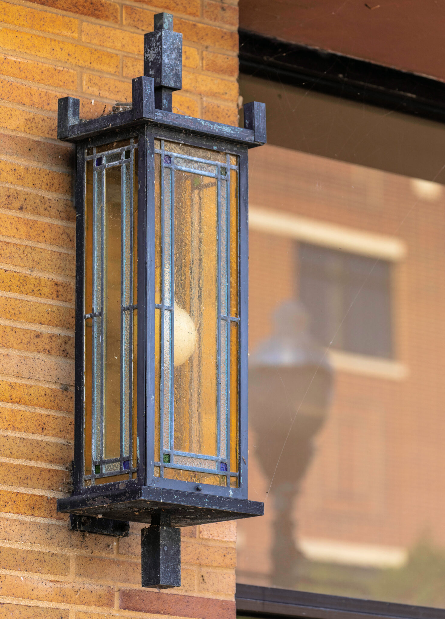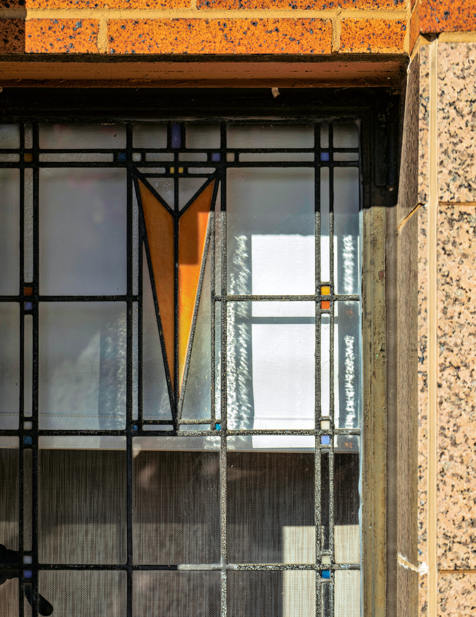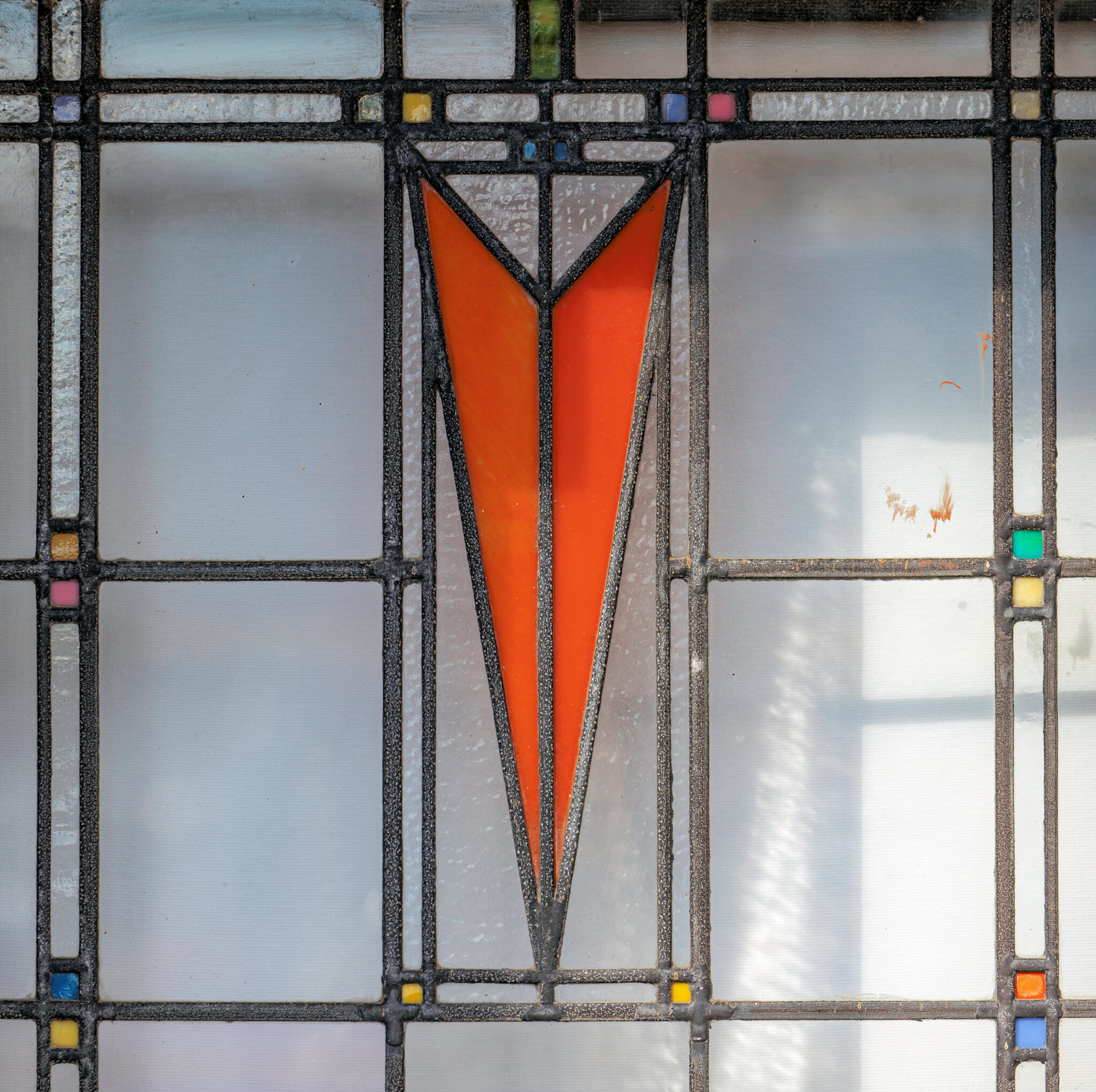 the strongly geometric art glass windows were done by the linden glass company, chiagom il.