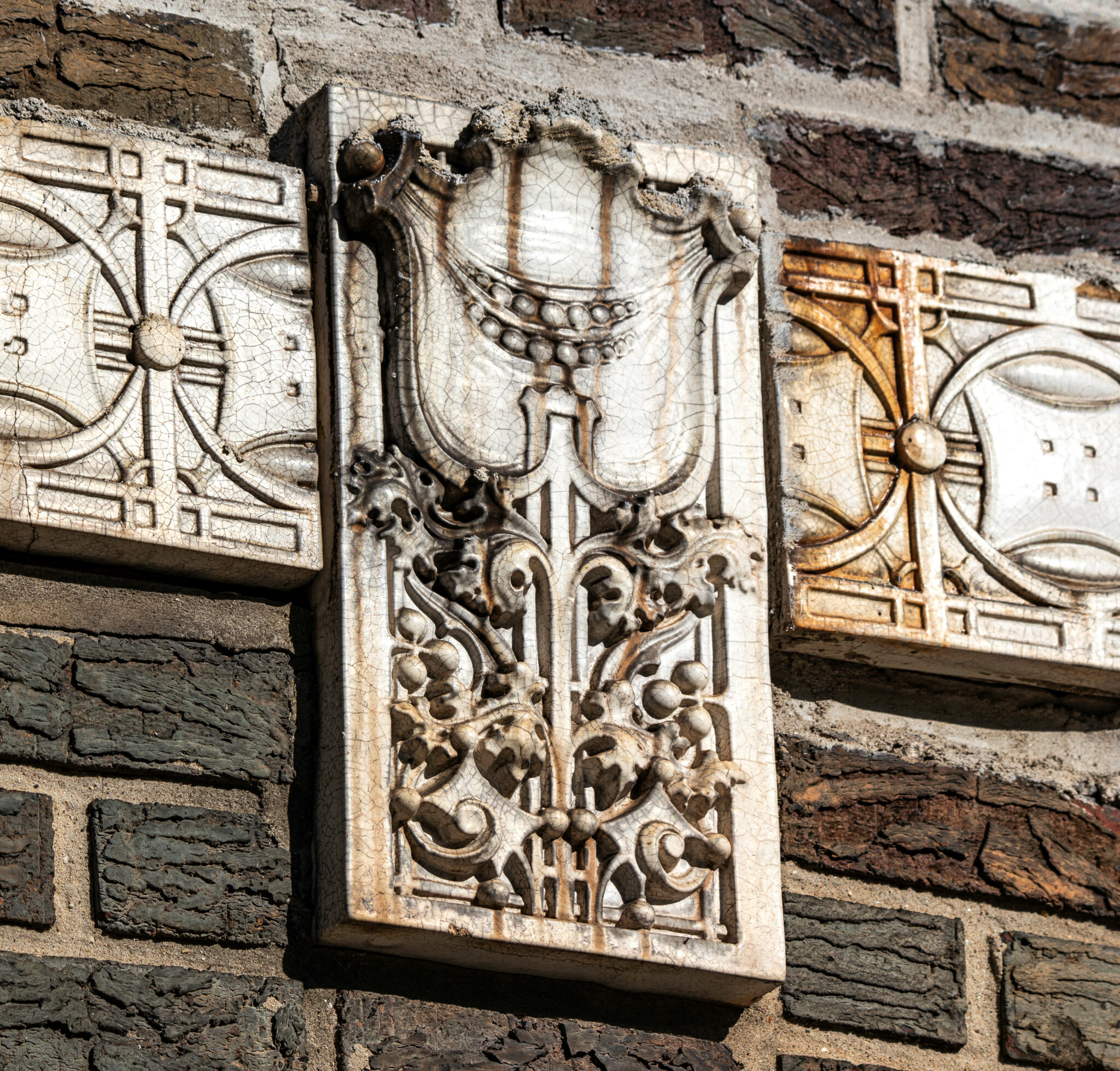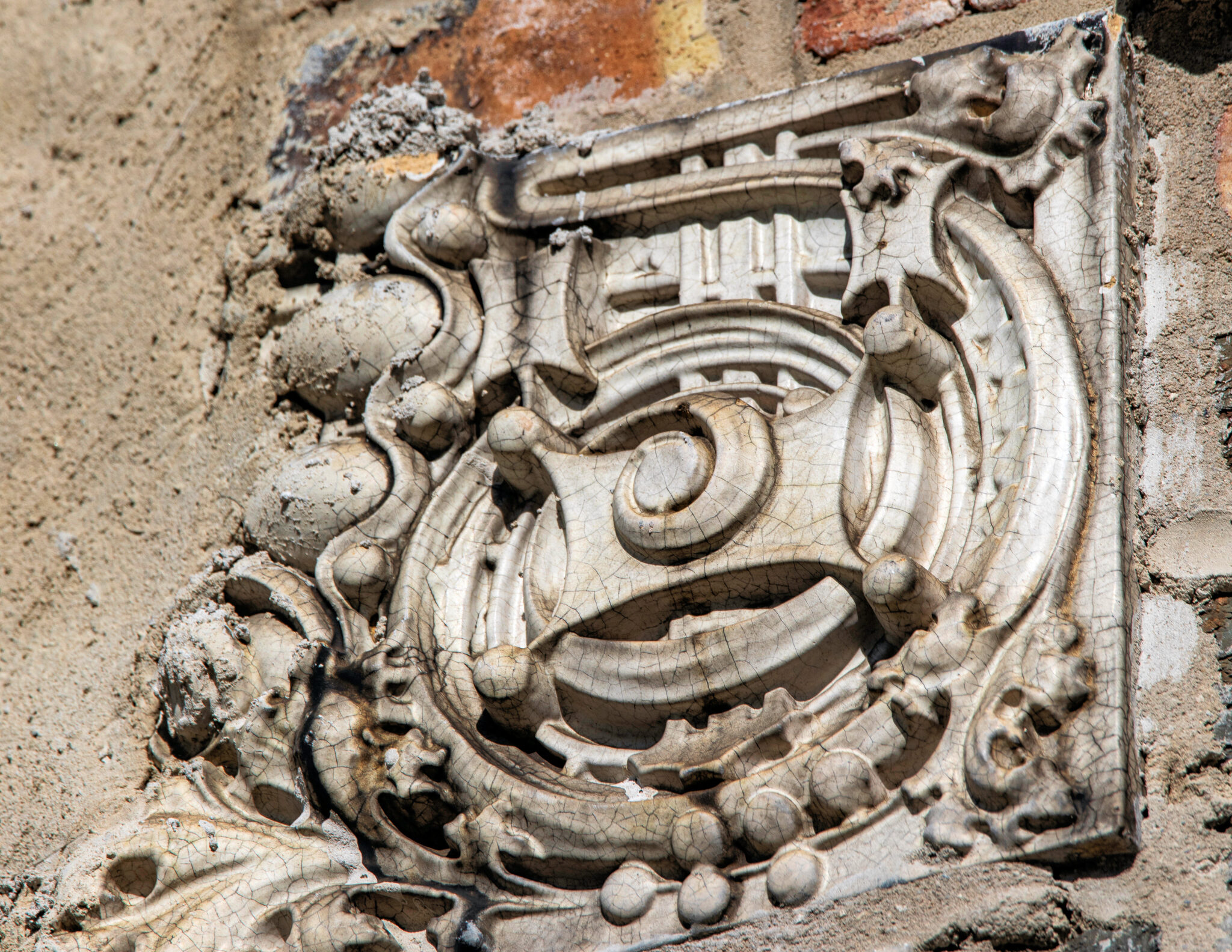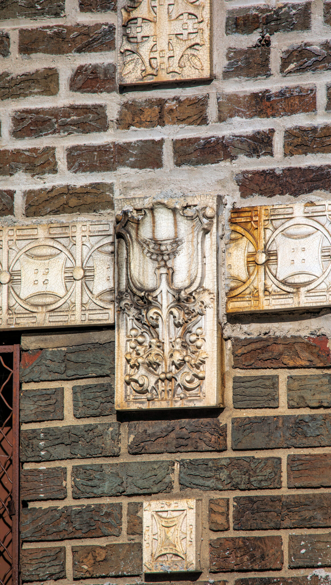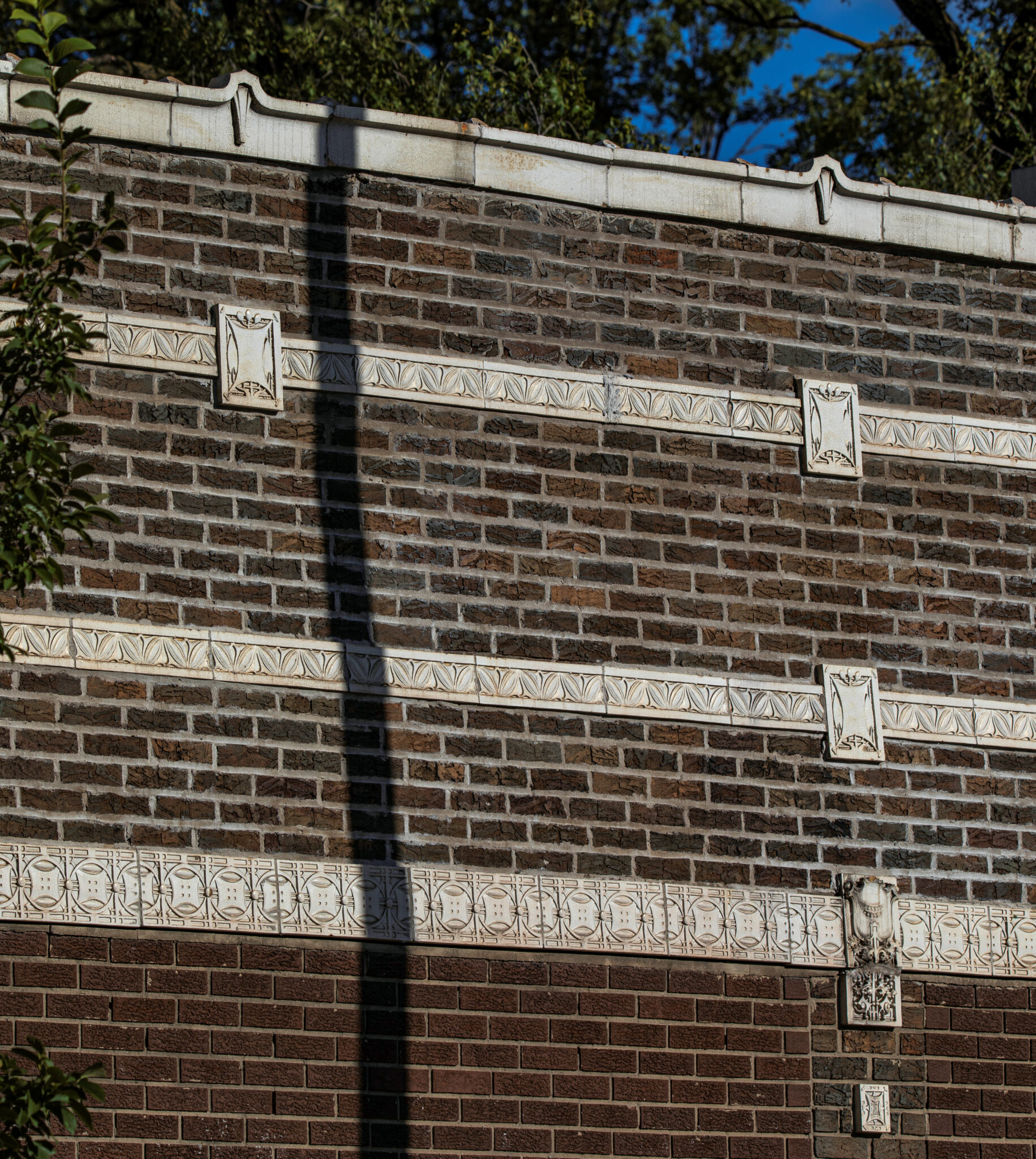 the “stock” pattern white glazed terra cotta ornament was executed by the midland terra cotta company, chiago, il.