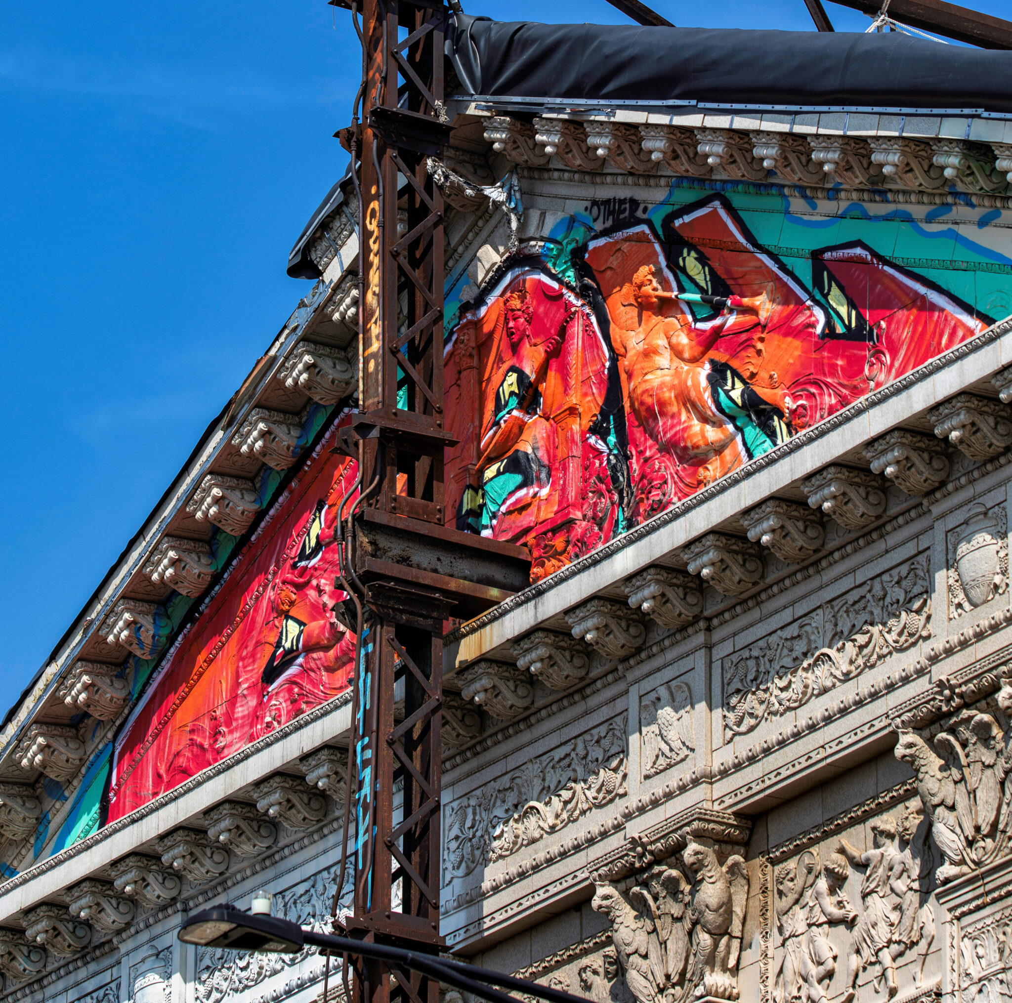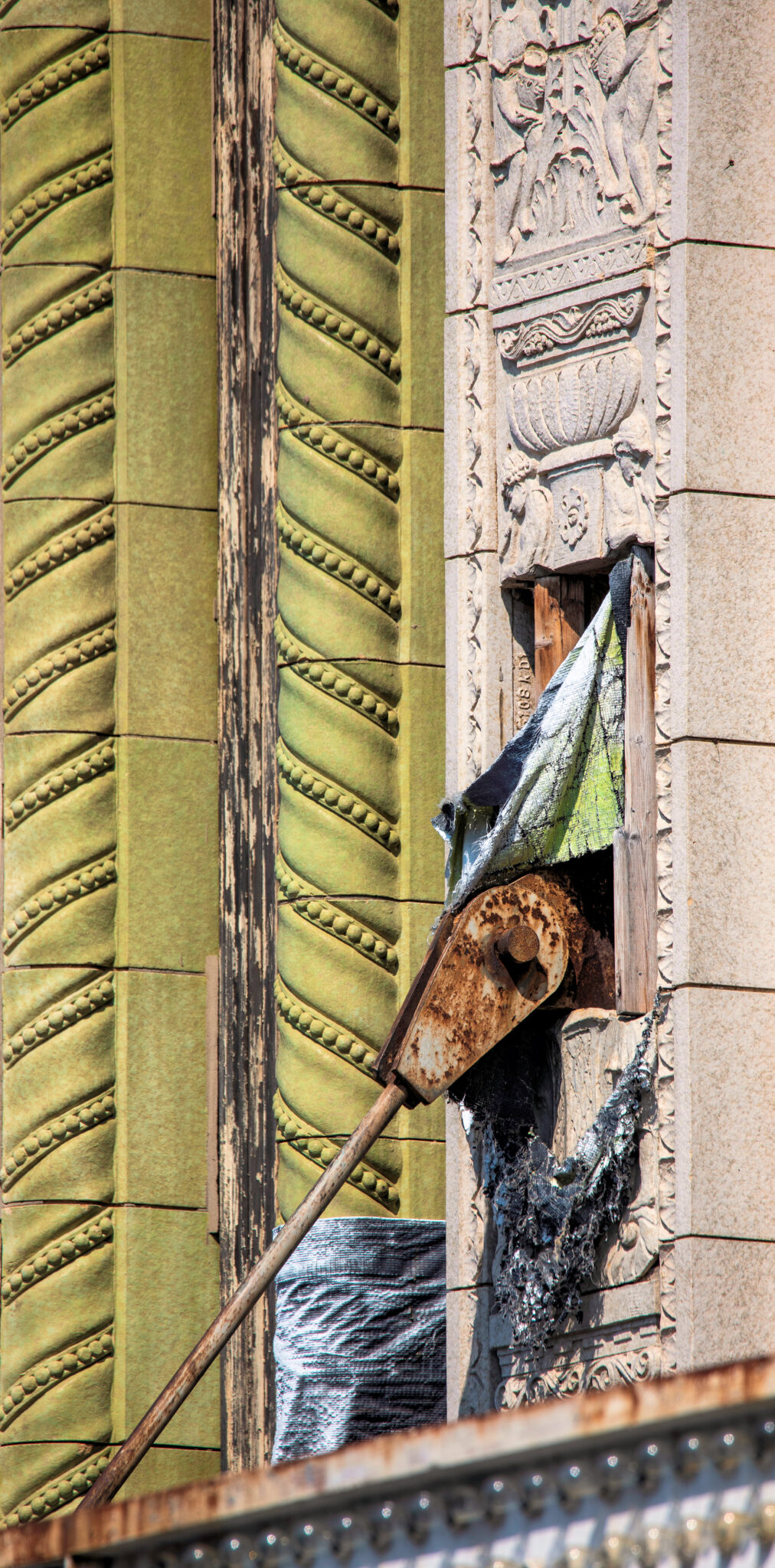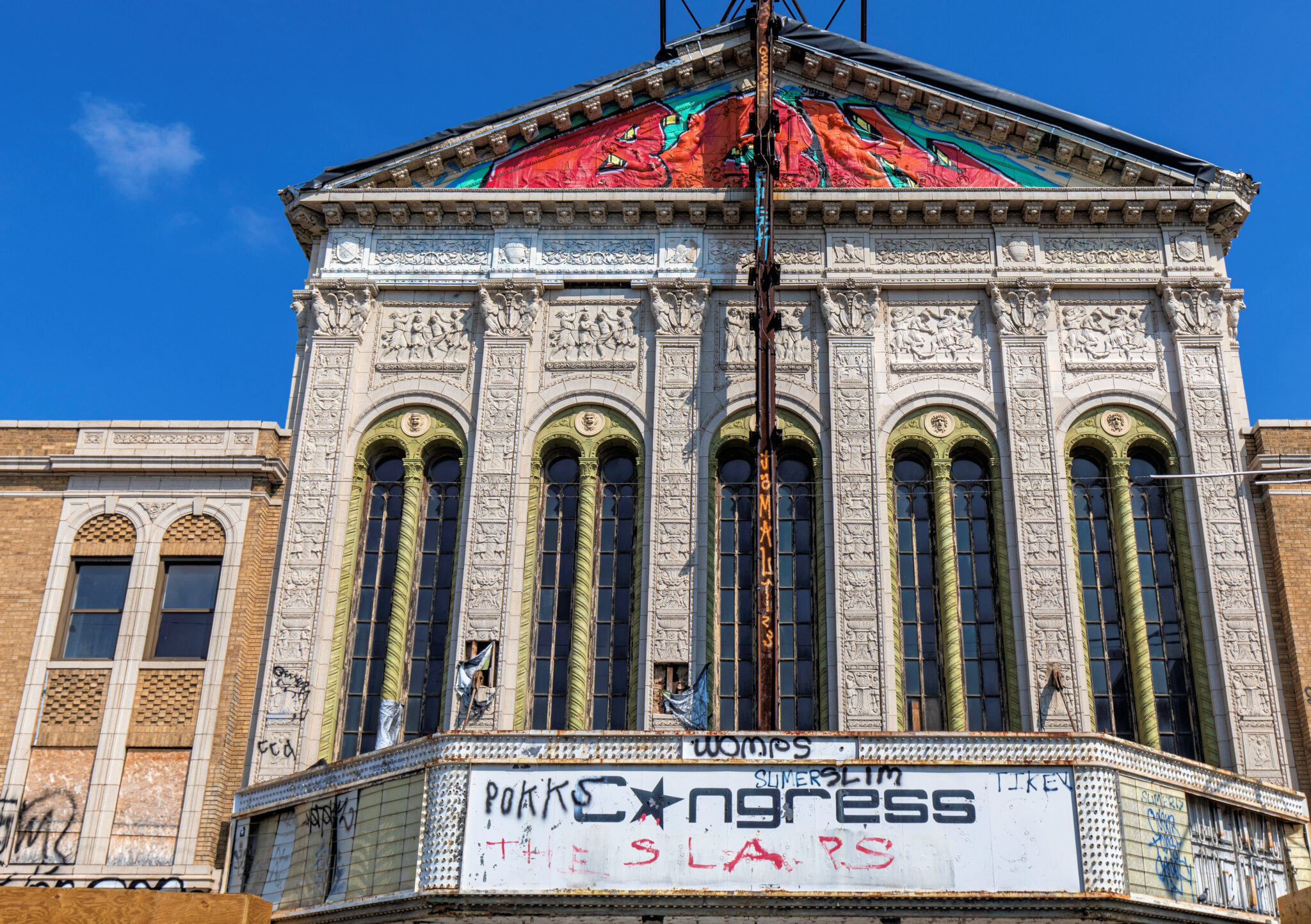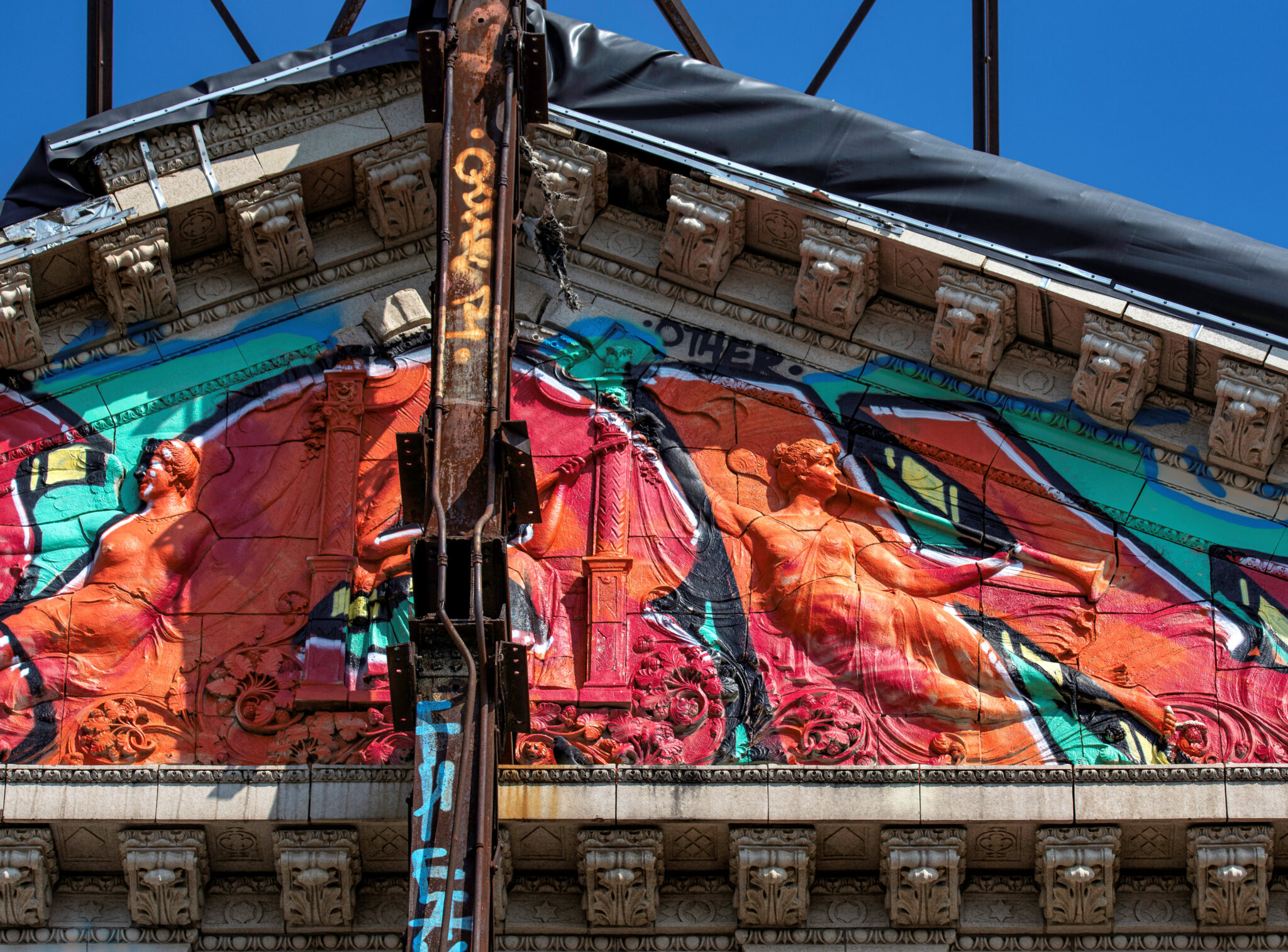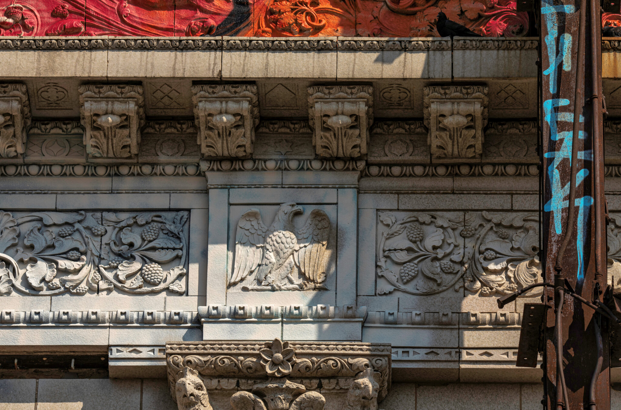 the scaffolding is long gone and the figural terra cotta pediment covered over in lively colors. a few more pieces of the cream-colored terra cotta ornament are missing, but overall, it’s not a disaster. i’ve been told the interior is far worse, which is too bad, given the fact that much of it is original and intact (at least it was when i thoroughly documented it in 2015-17).