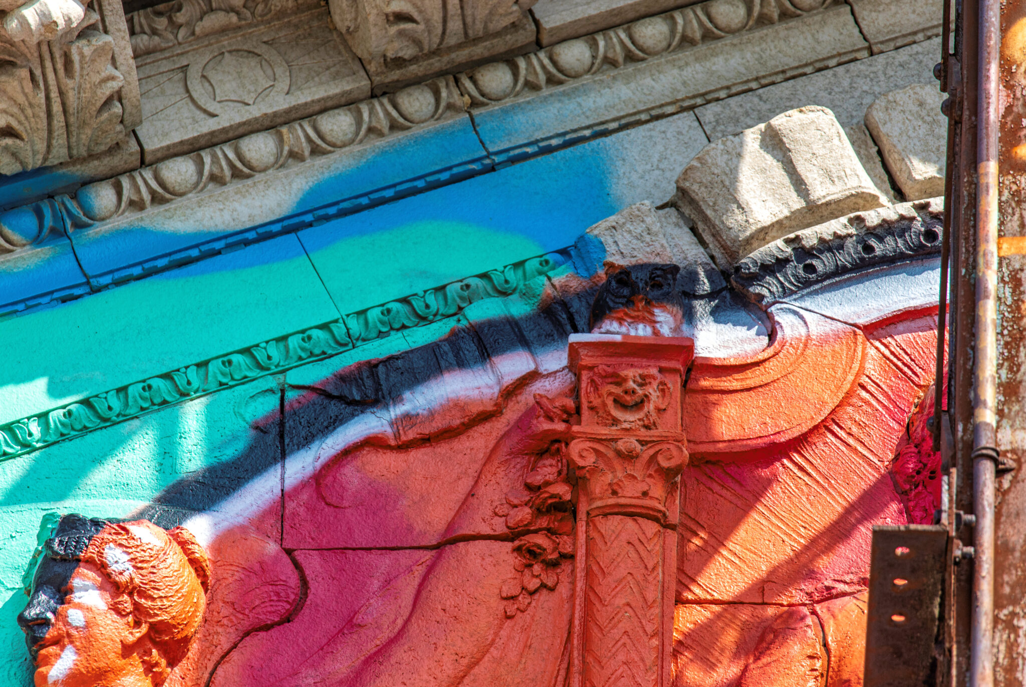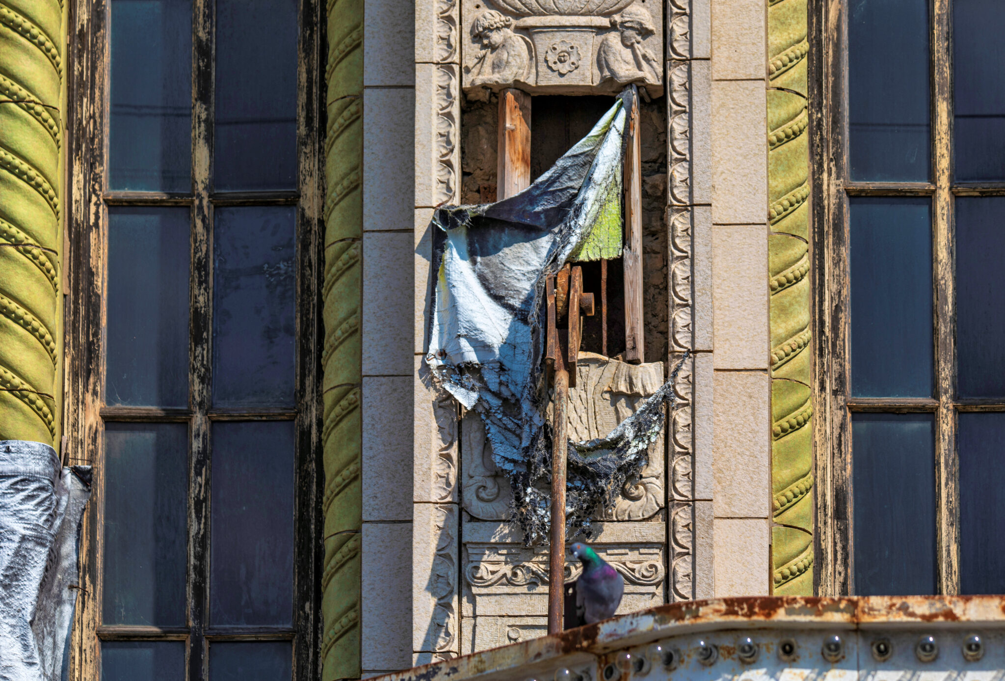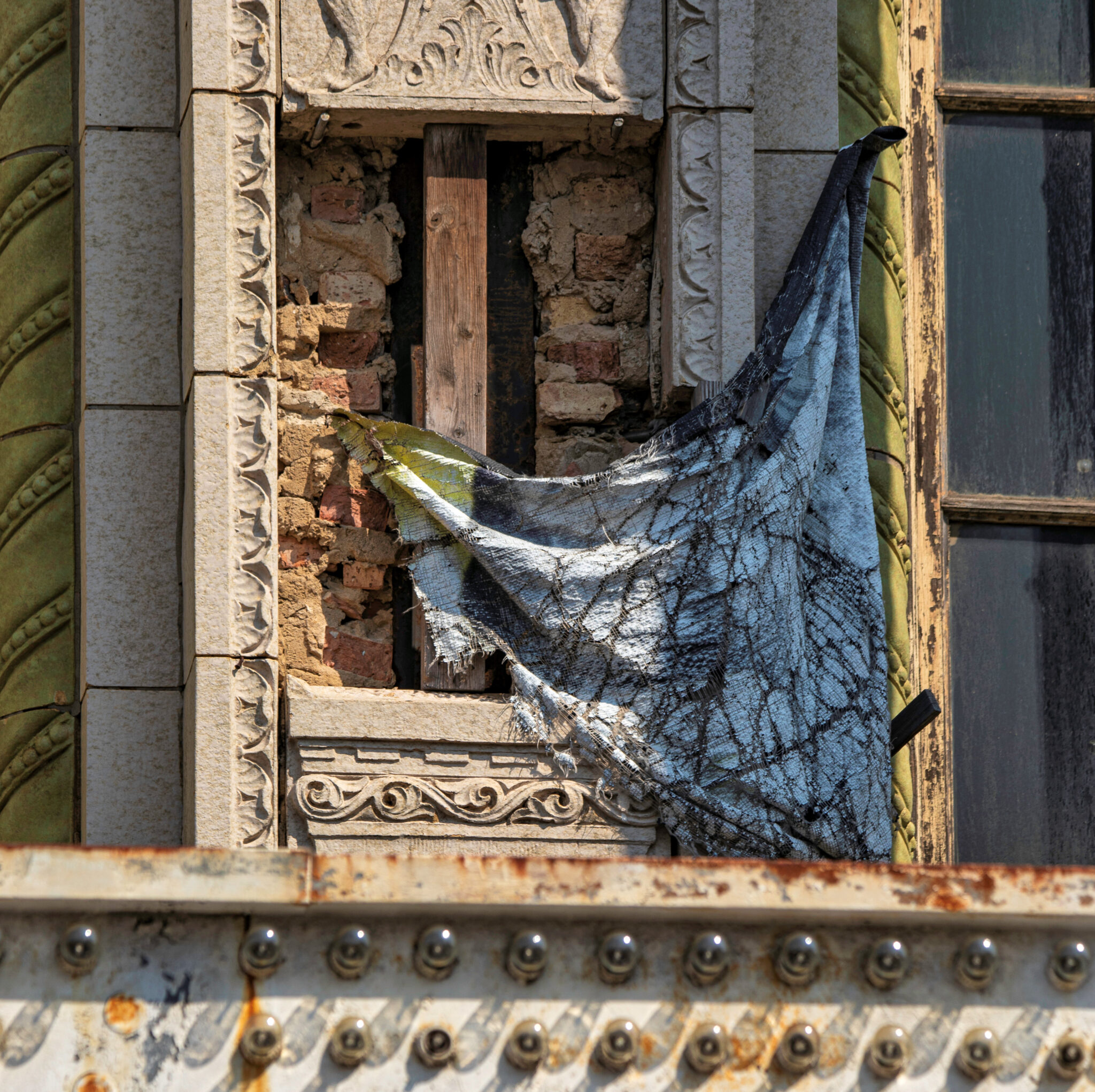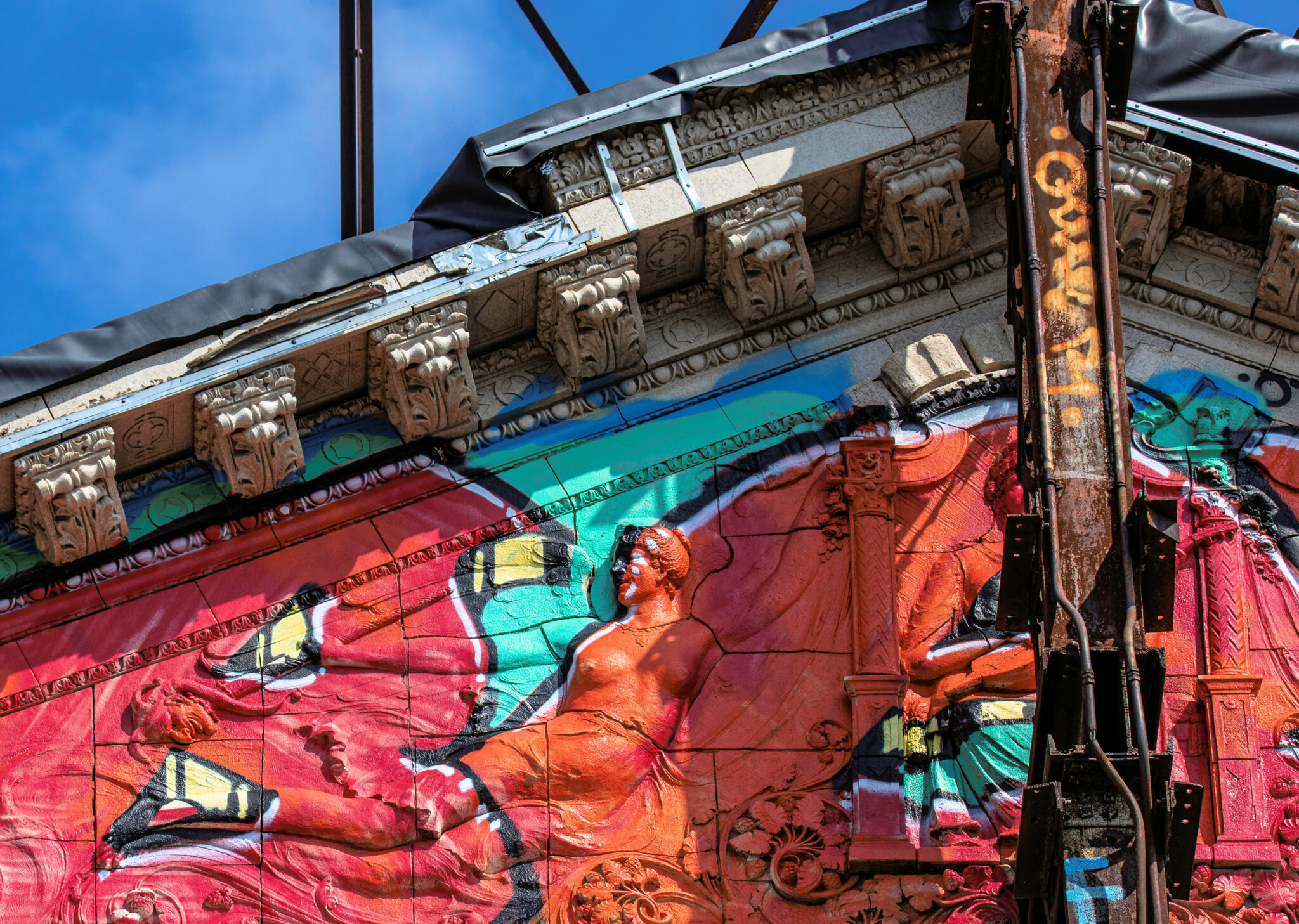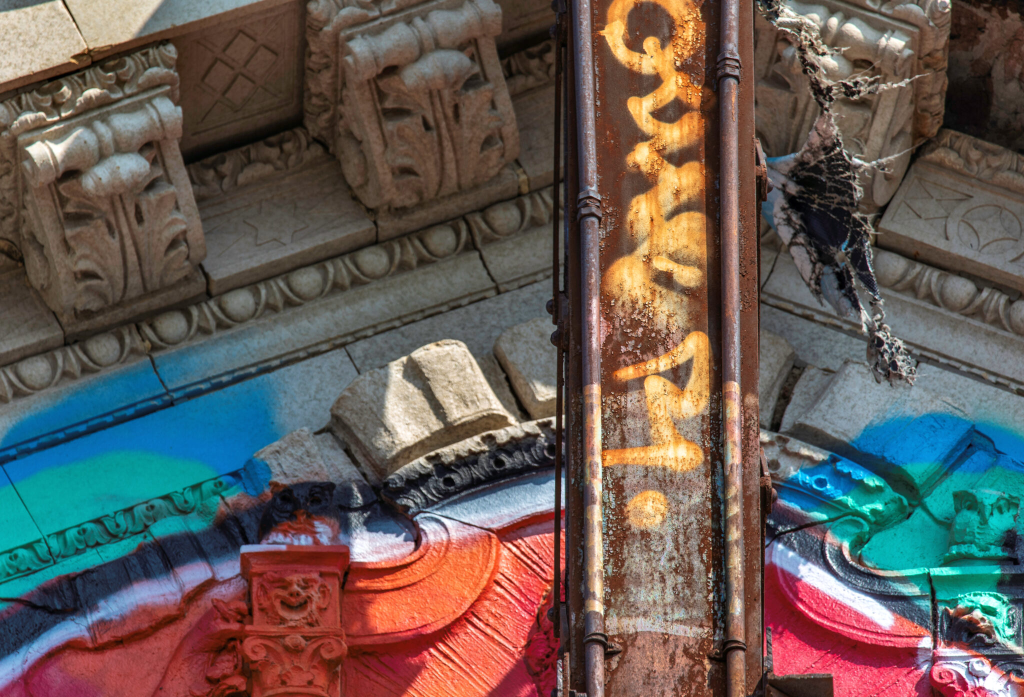 the scaffolding is long gone and the figural terra cotta pediment covered over in lively colors. a few more pieces of the cream-colored terra cotta ornament are missing, but overall, it’s not a disaster. i’ve been told the interior is far worse, which is too bad, given the fact that much of it is original and intact (at least it was when i thoroughly documented it in 2015-17).