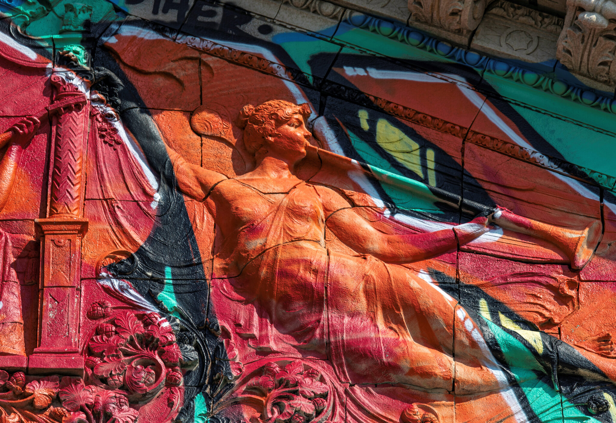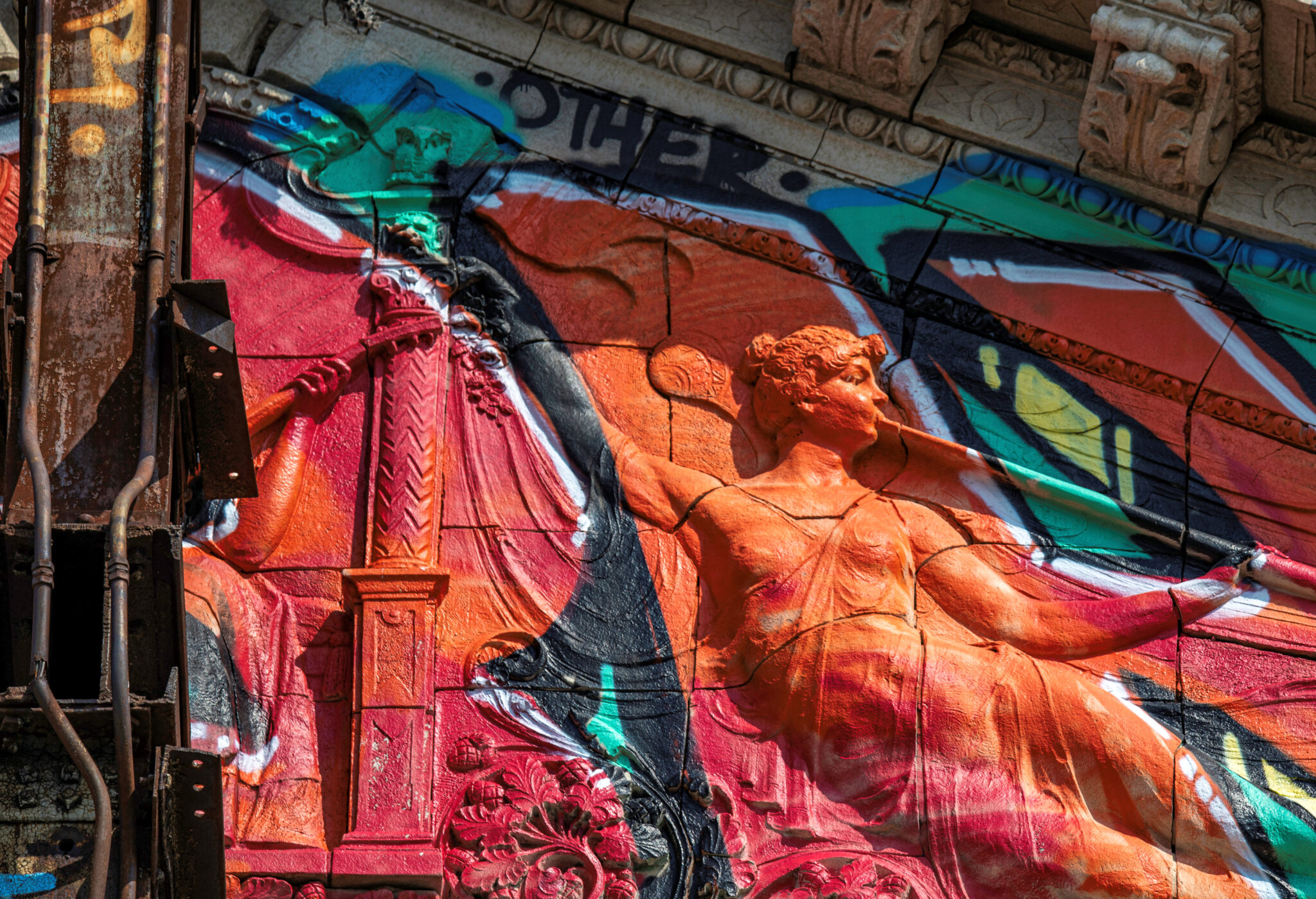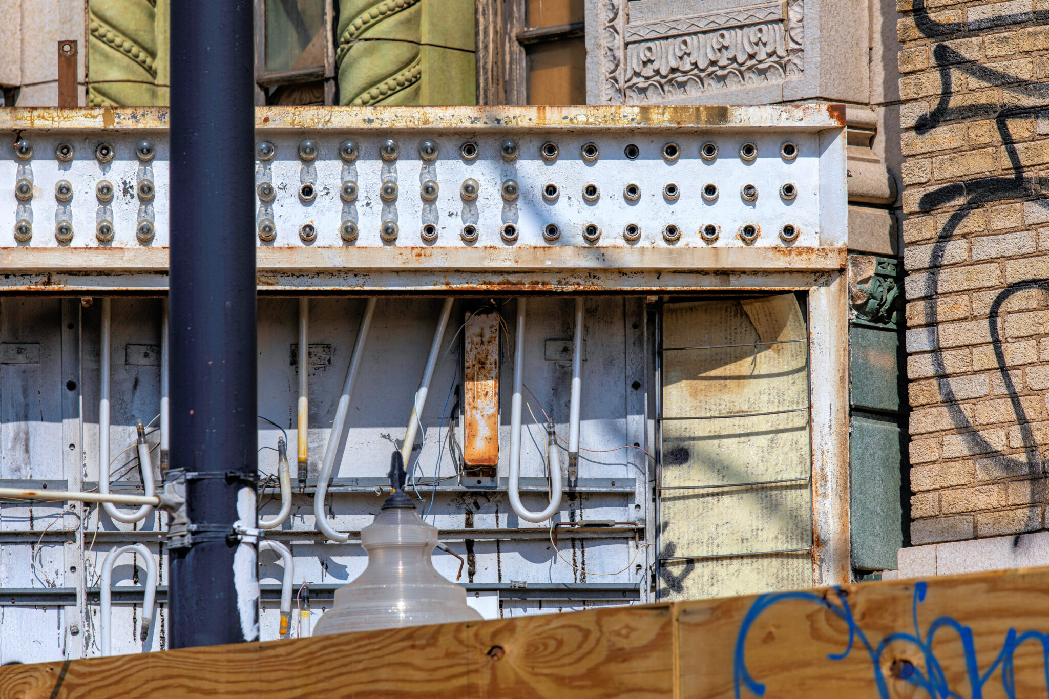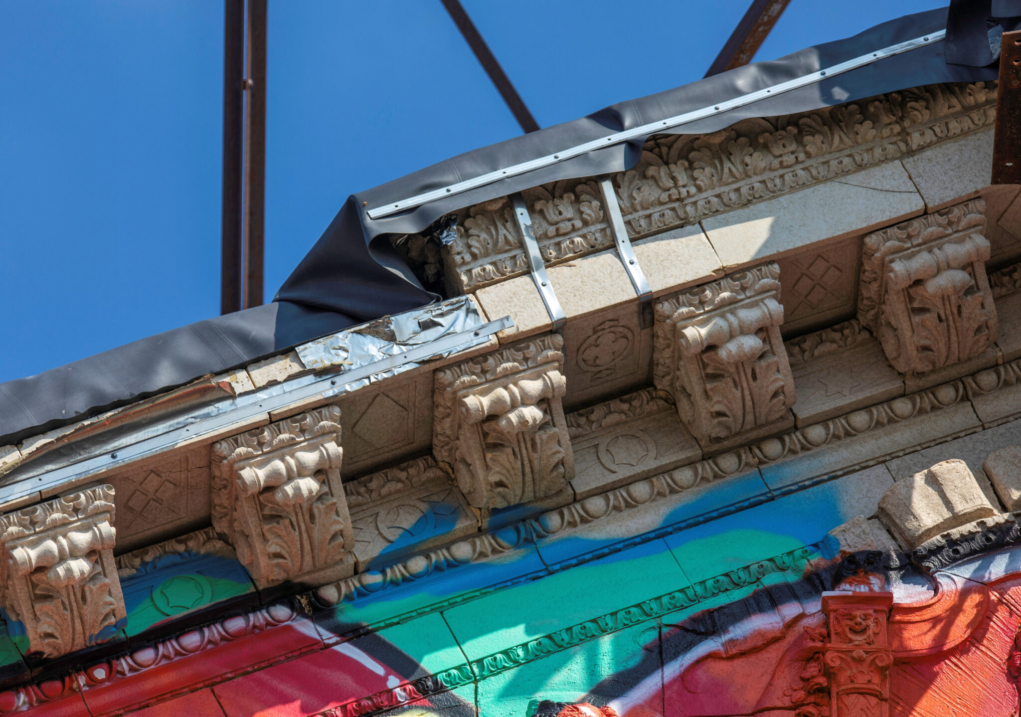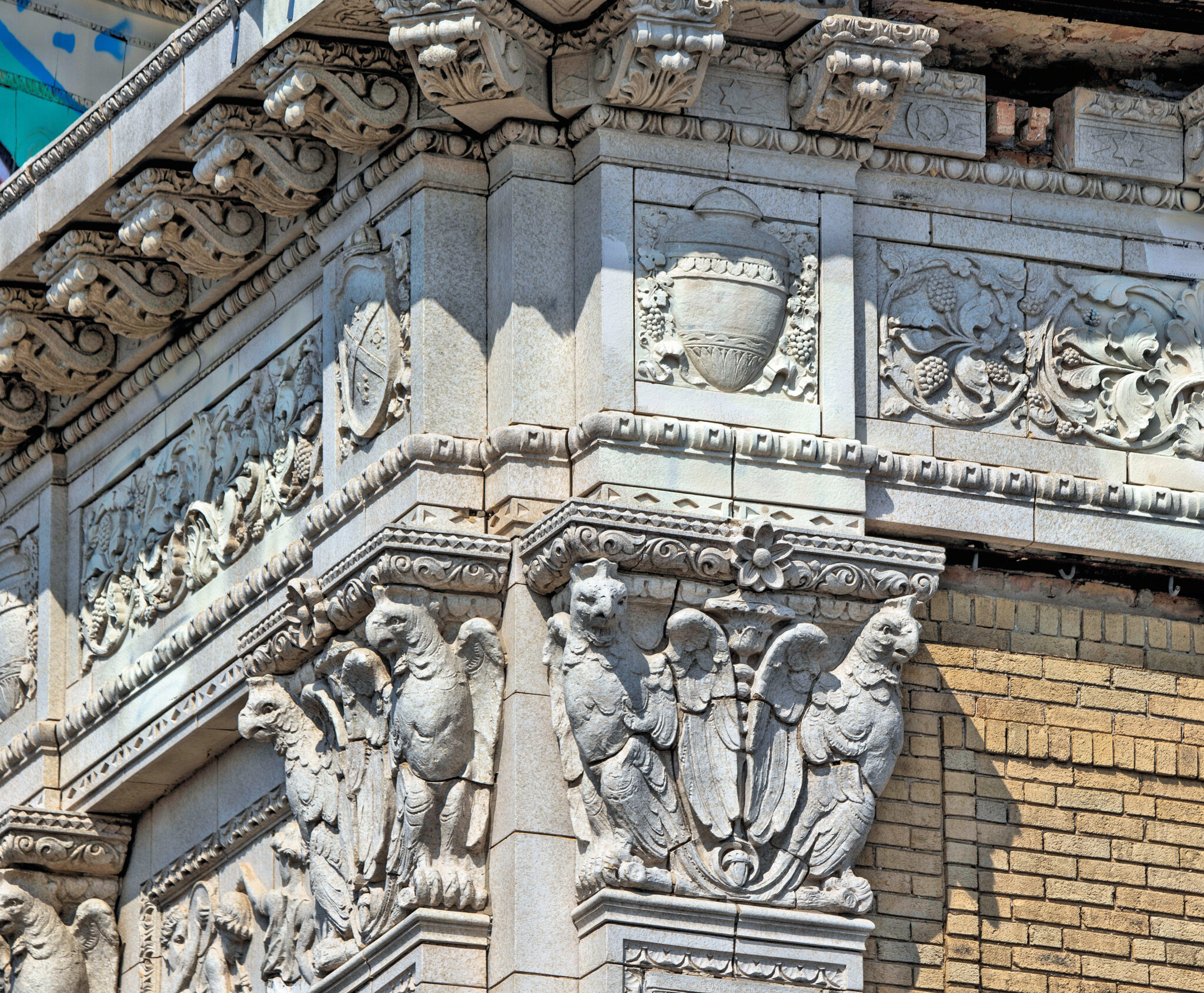 the scaffolding is long gone and the figural terra cotta pediment covered over in lively colors. a few more pieces of the cream-colored terra cotta ornament are missing, but overall, it’s not a disaster. i’ve been told the interior is far worse, which is too bad, given the fact that much of it is original and intact (at least it was when i thoroughly documented it in 2015-17).