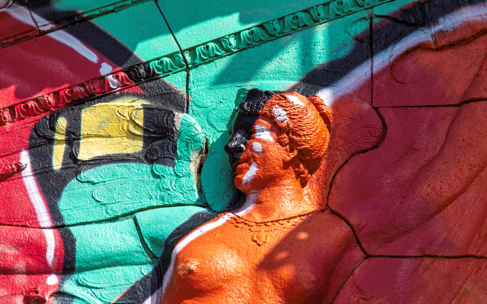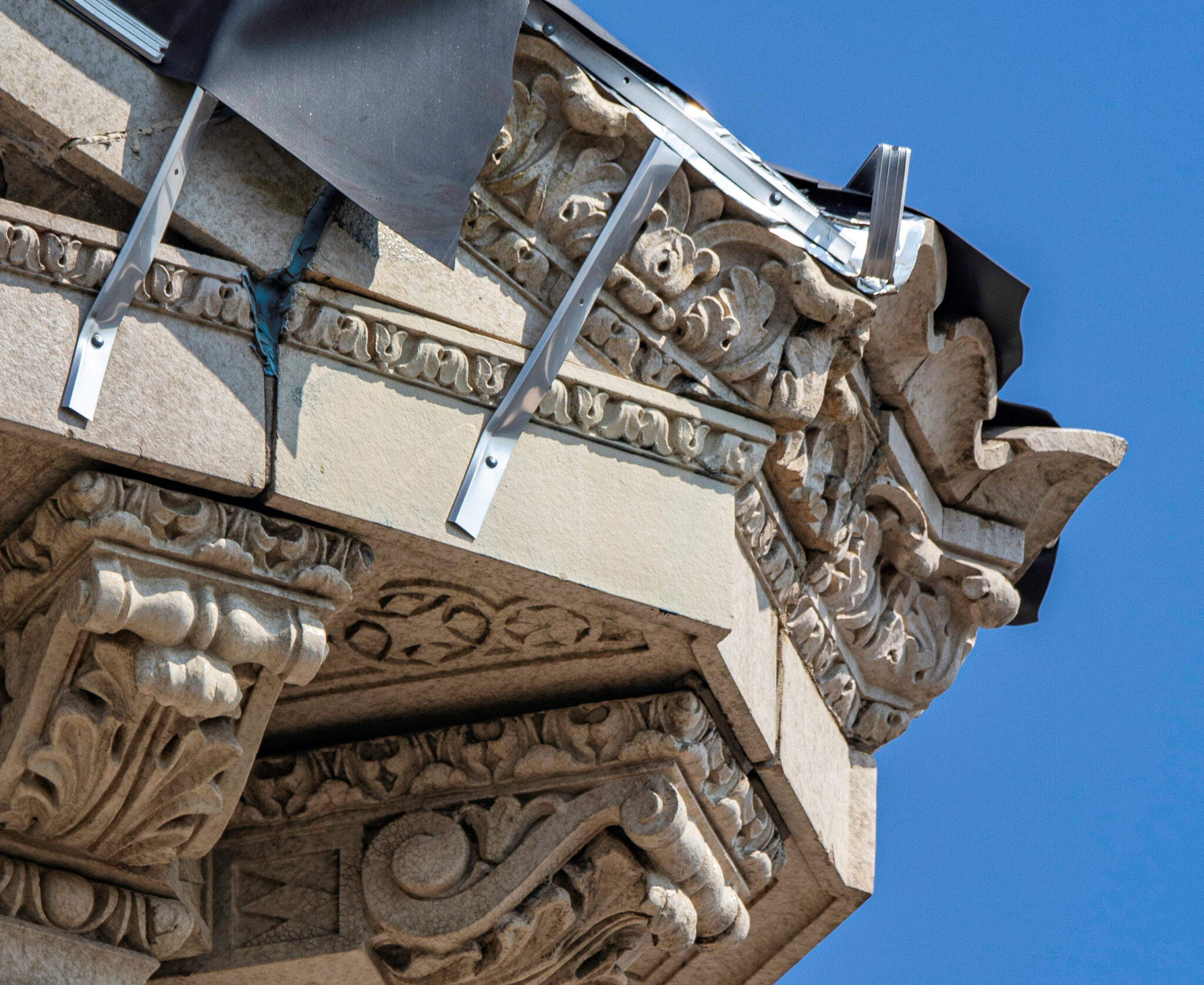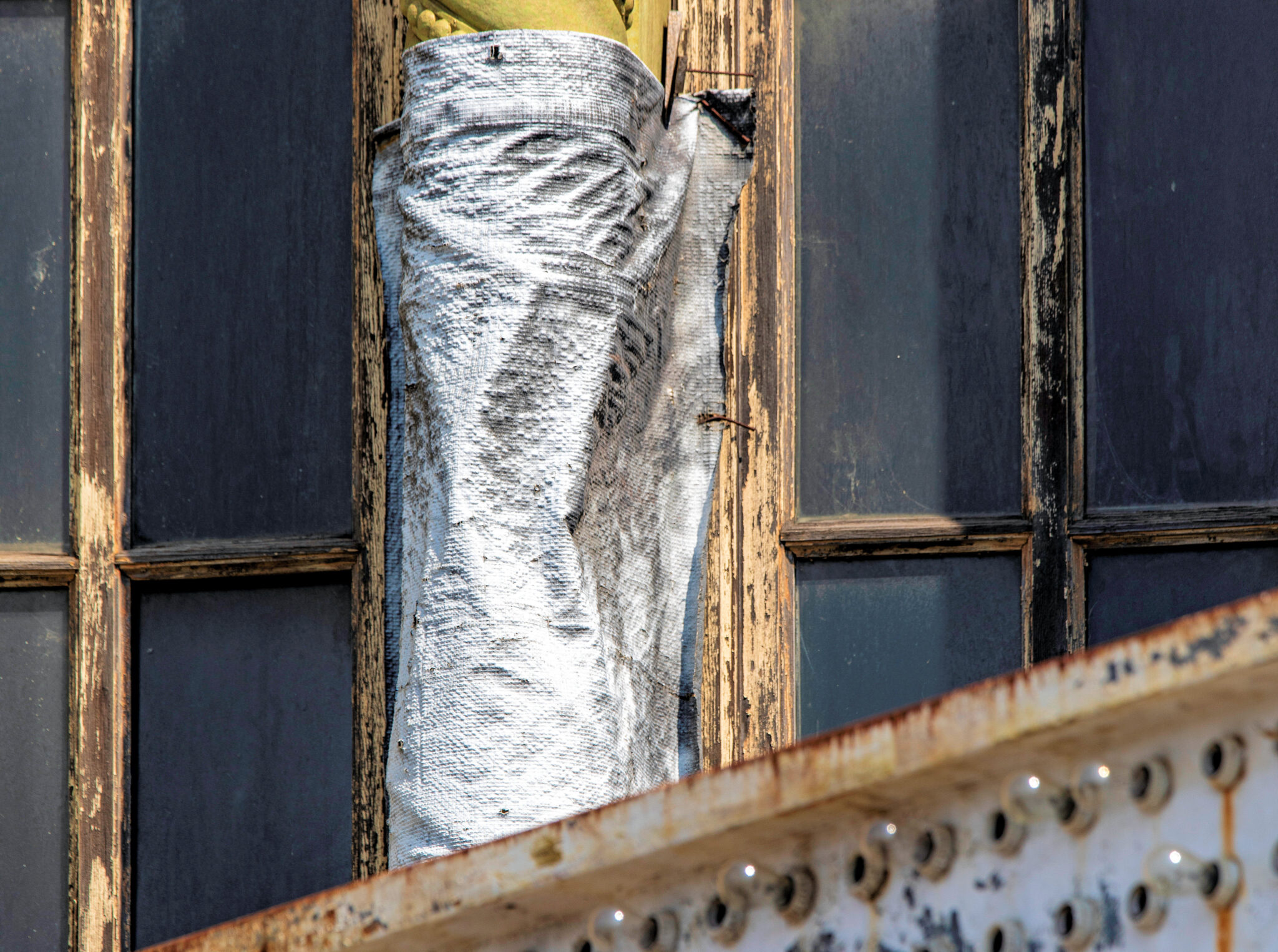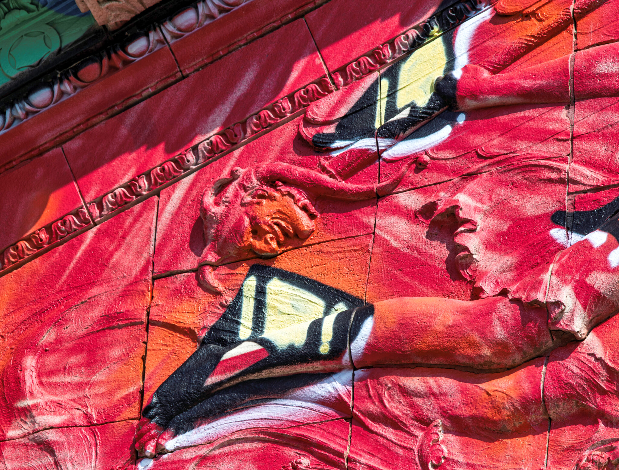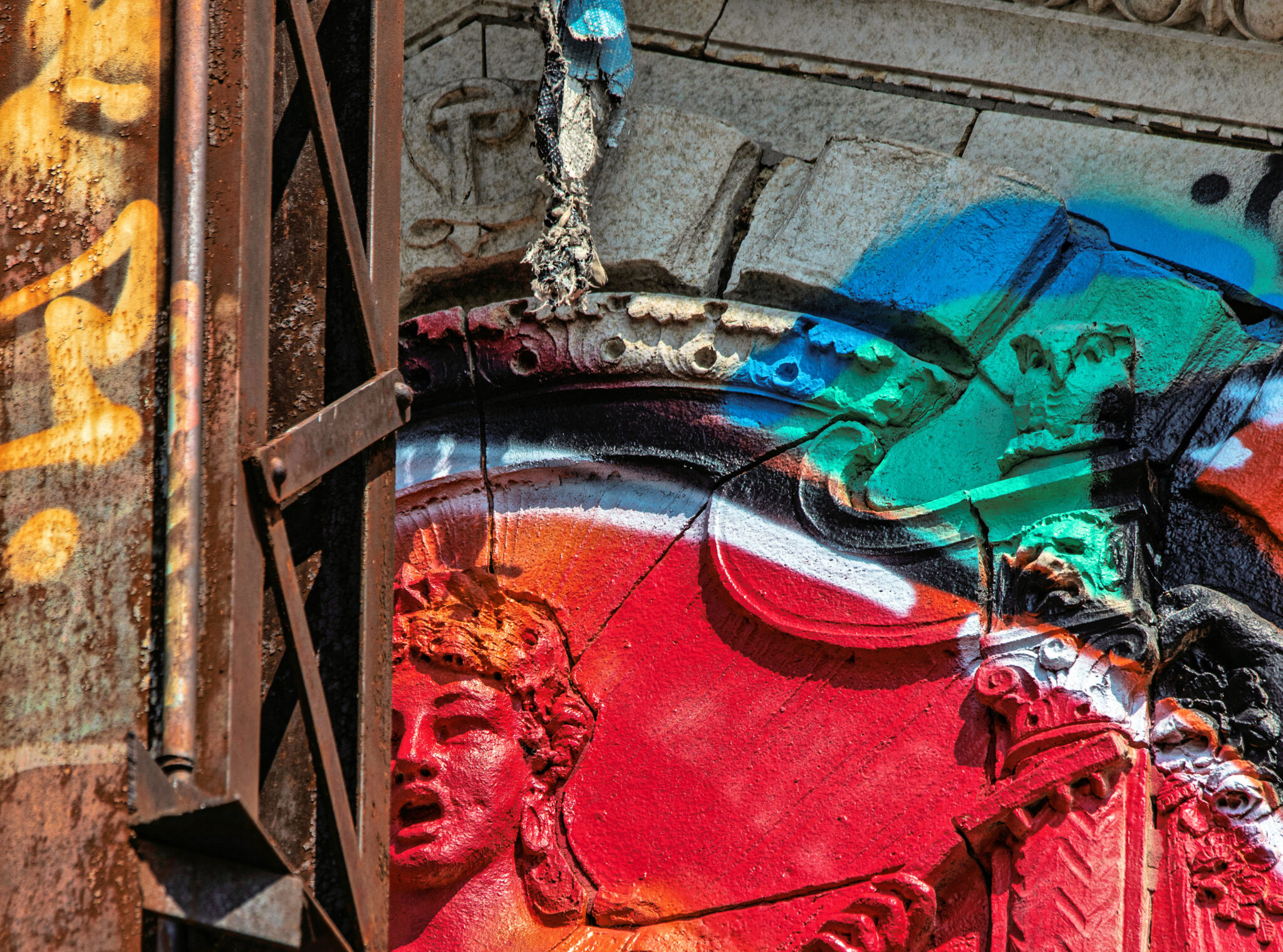 the scaffolding is long gone and the figural terra cotta pediment covered over in lively colors. a few more pieces of the cream-colored terra cotta ornament are missing, but overall, it’s not a disaster. i’ve been told the interior is far worse, which is too bad, given the fact that much of it is original and intact (at least it was when i thoroughly documented it in 2015-17).