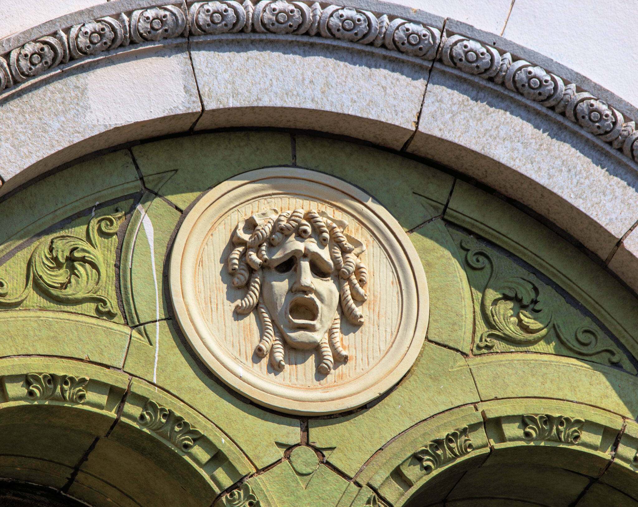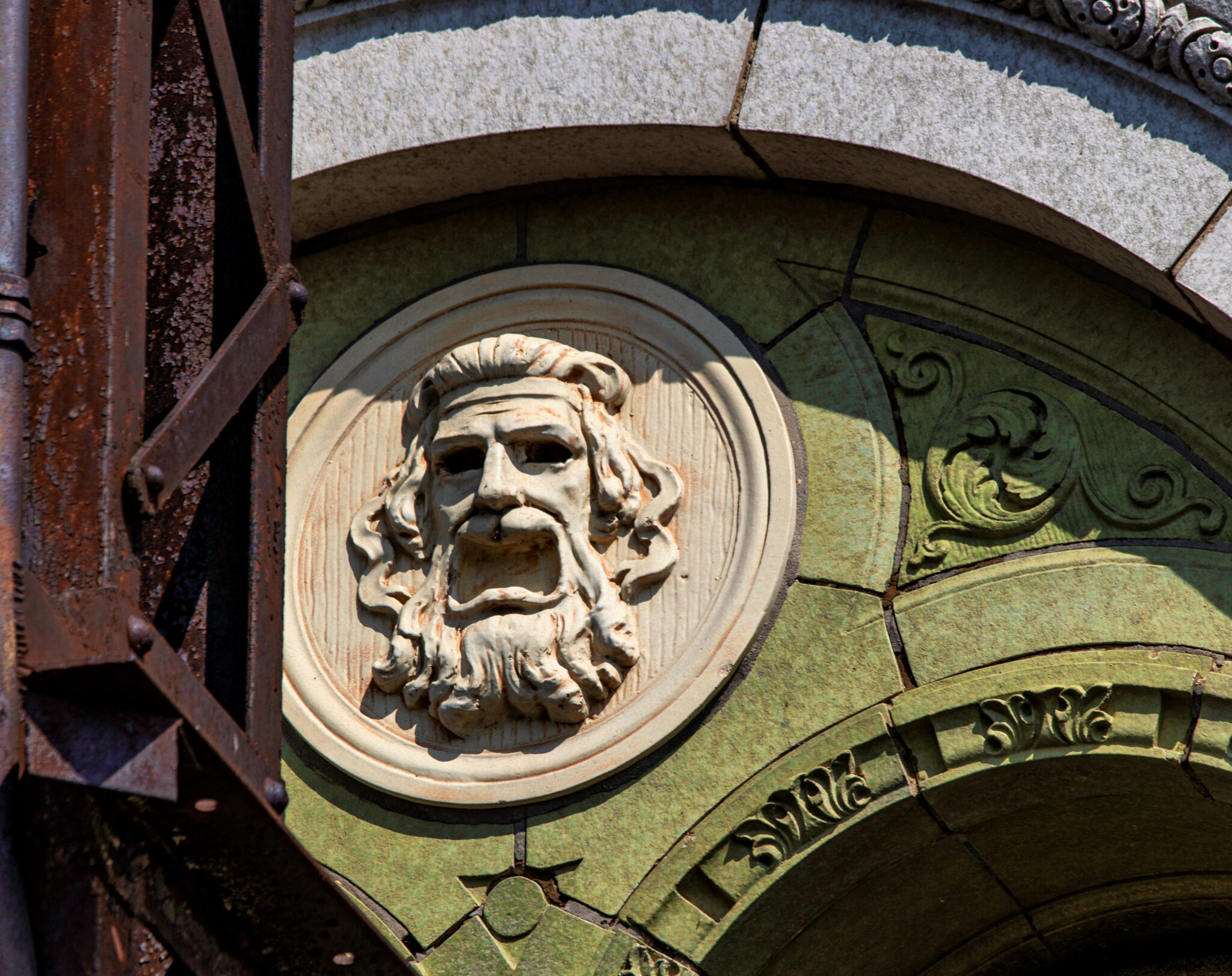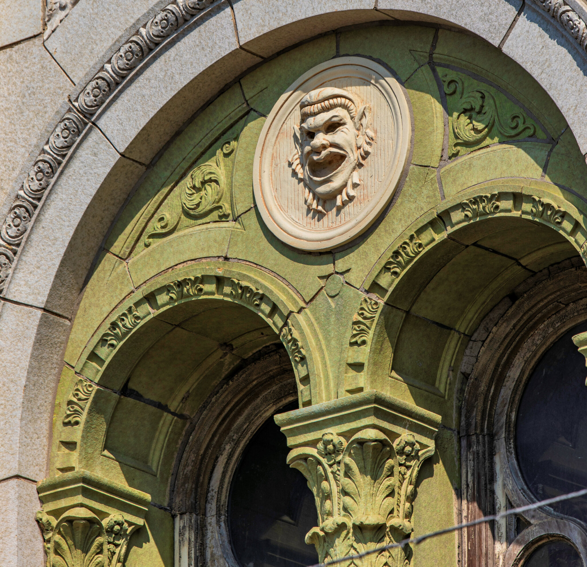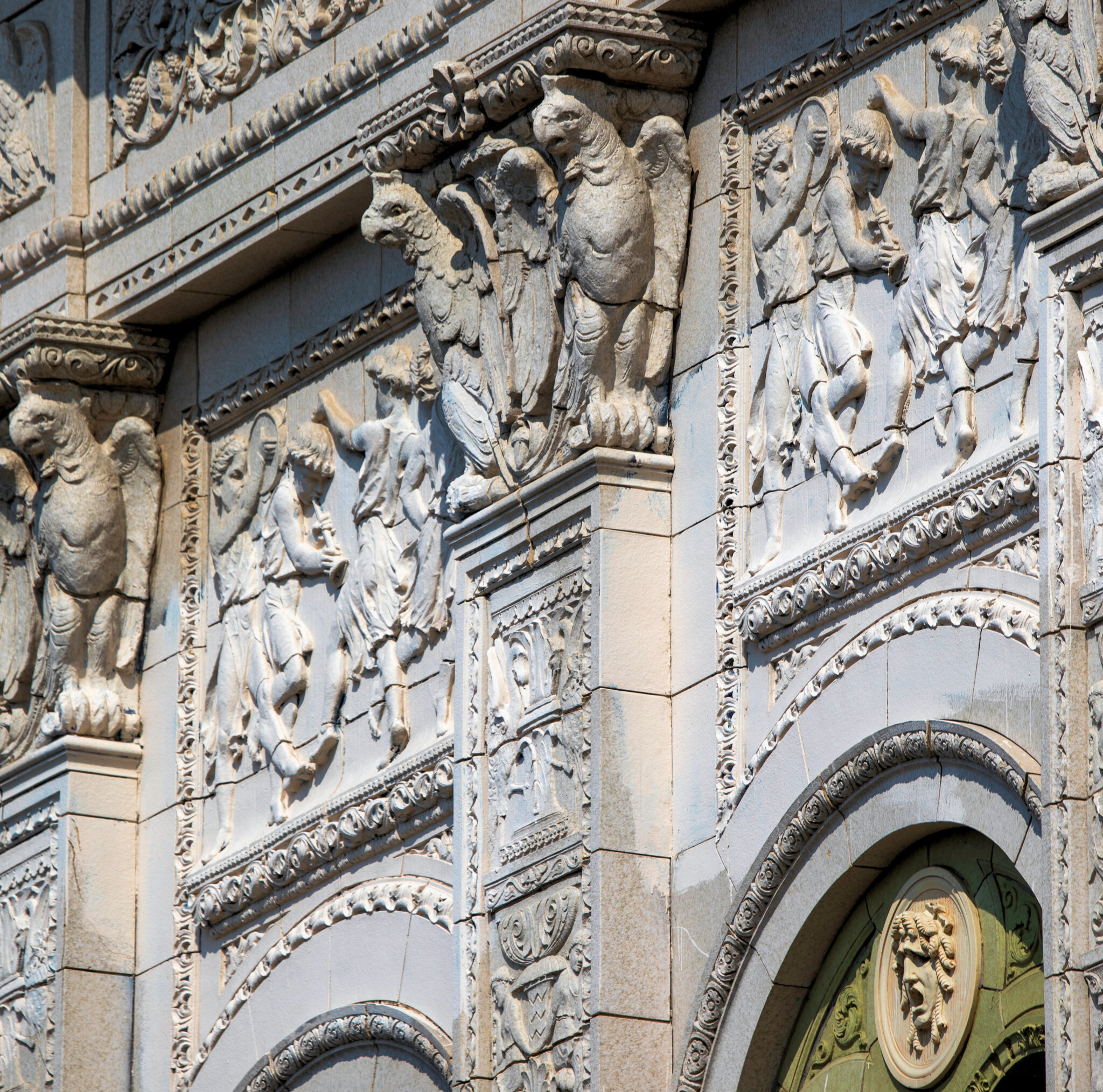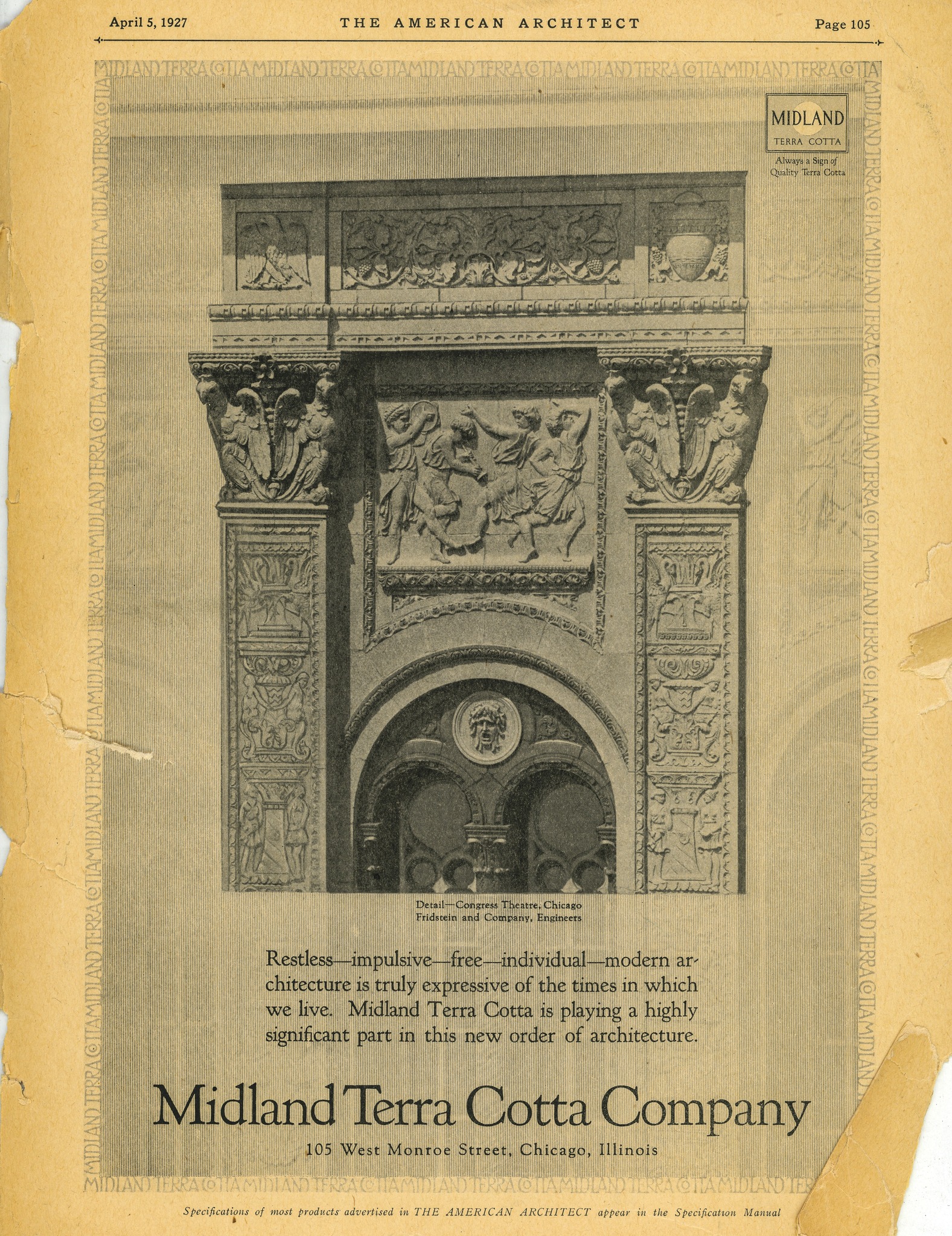 the speckled cream and light green terra cotta was executed by the midland terra cotta company (see period advertisement housed in my archive).