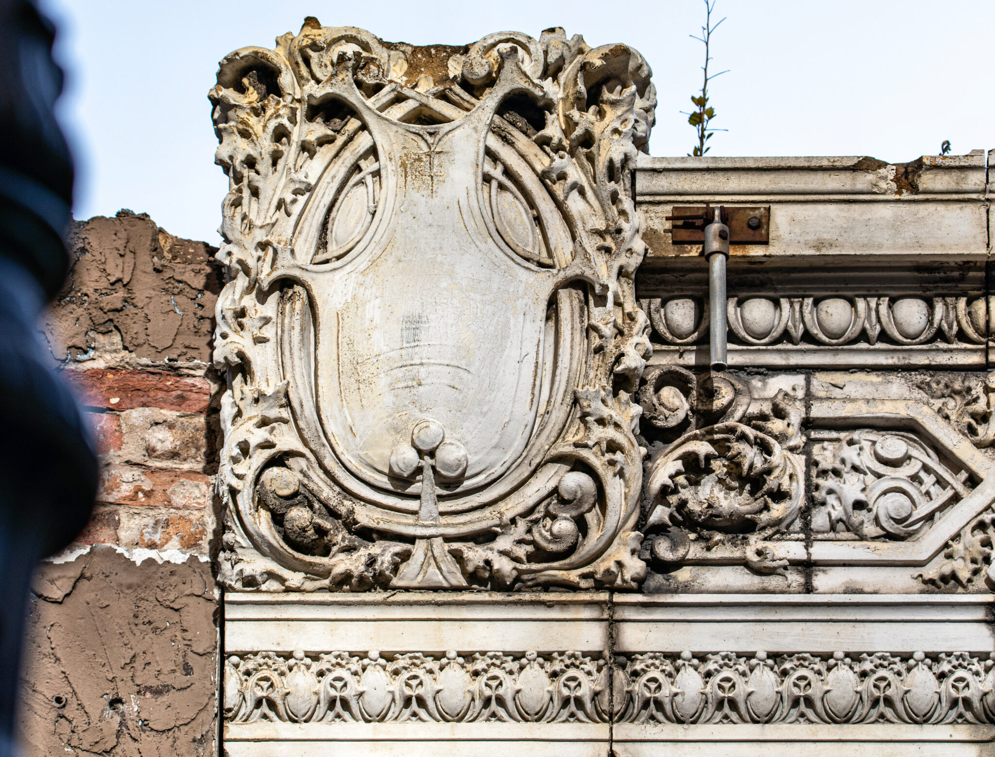 the building’s storefront survived demolition with the original first floor ornamental terra cotta cornice with flanking cartouches completely intact.