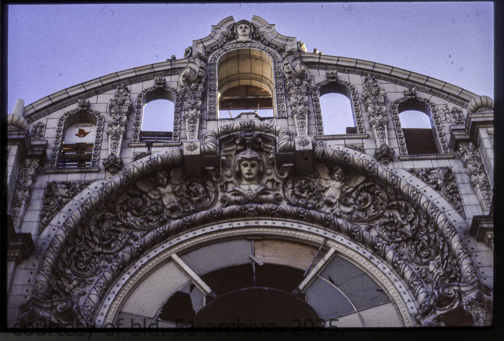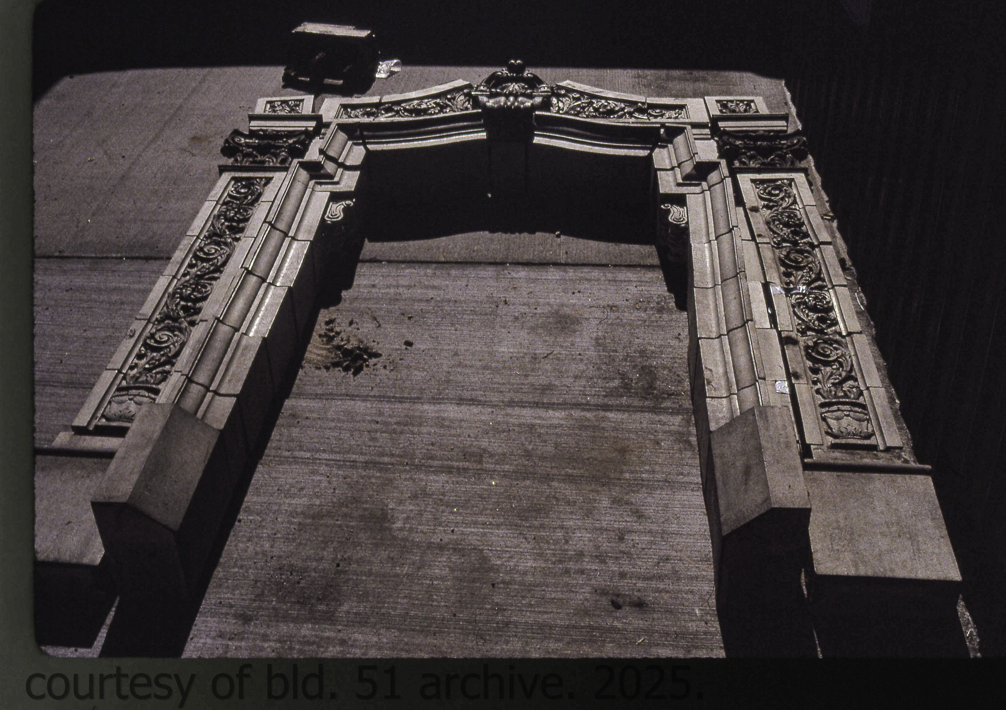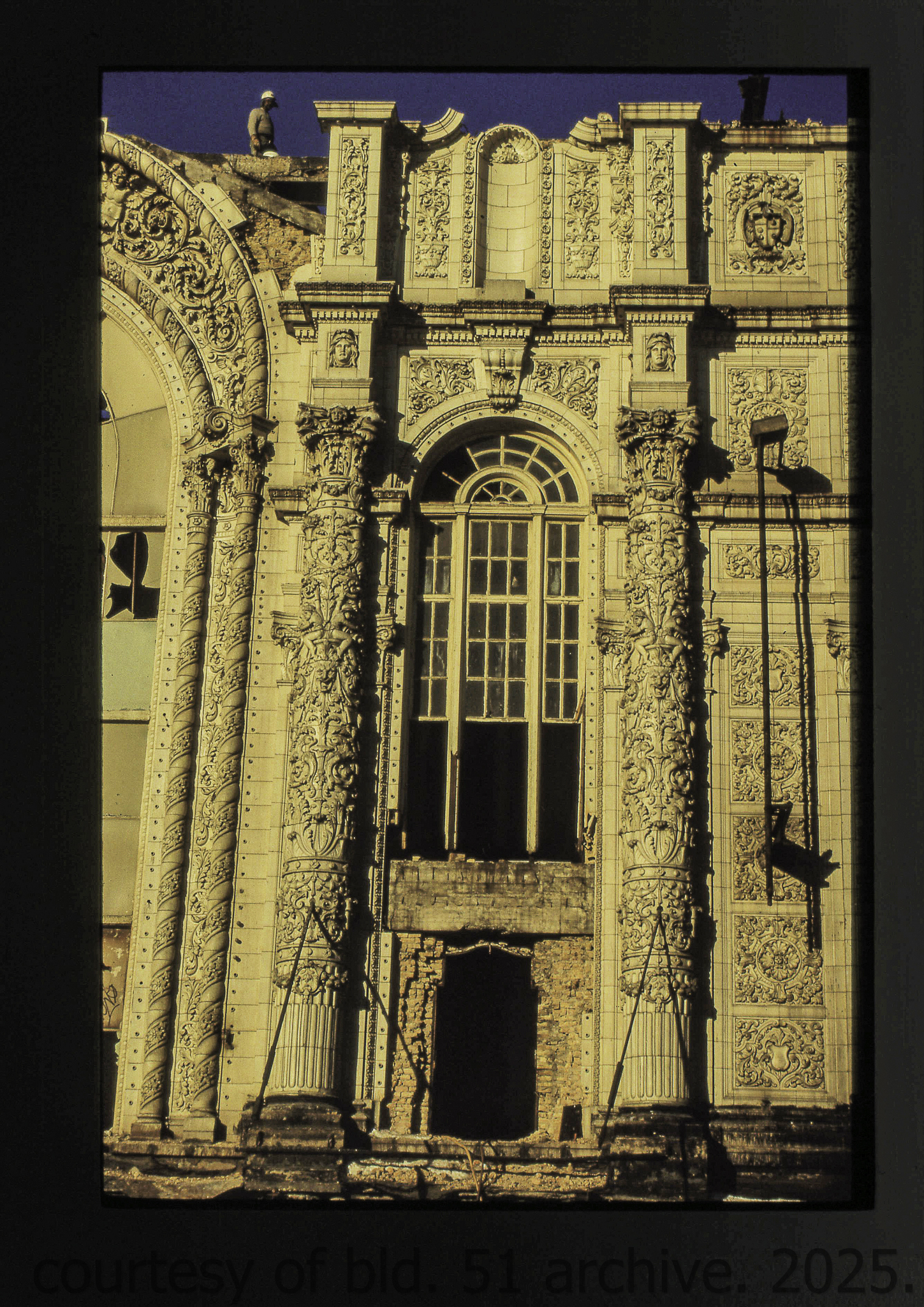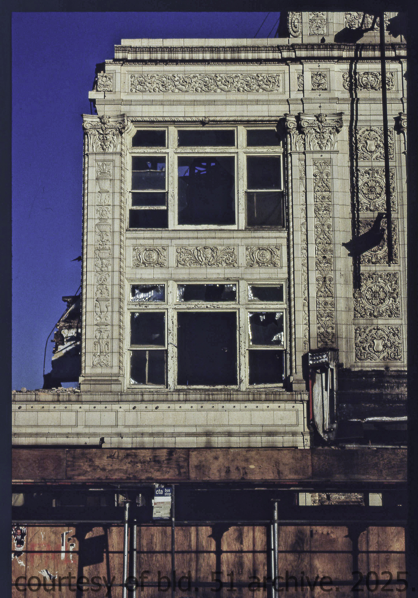 the cream-colored terra cotta facade was salvaged by dave felling of felling contracting, st. louis, mo. during its demolition in 1990 by the g.m. wrecking company, chicago, il.