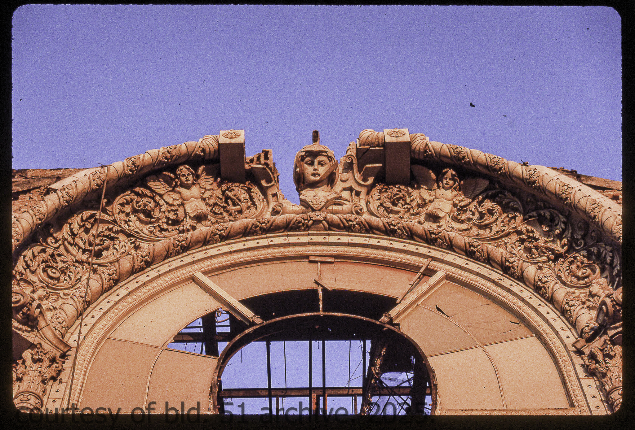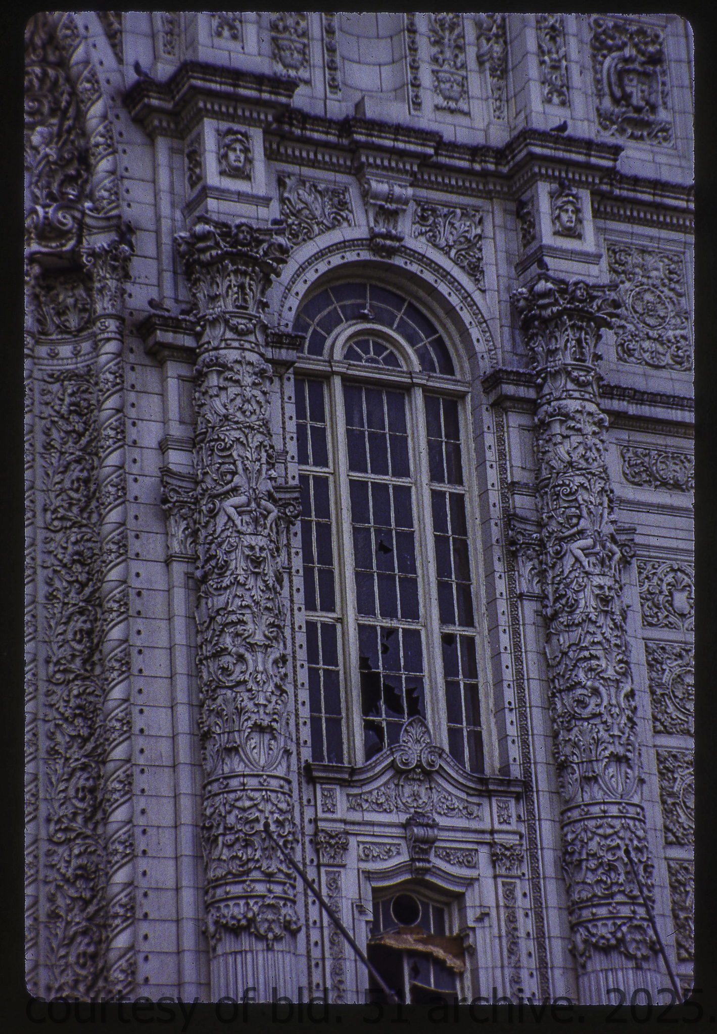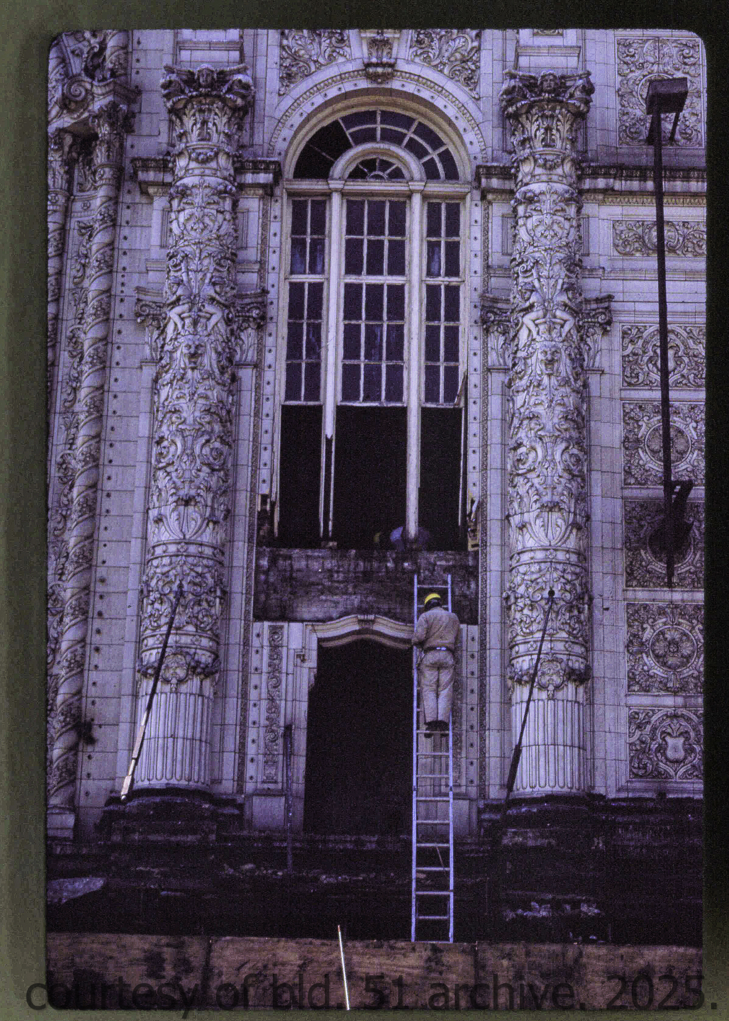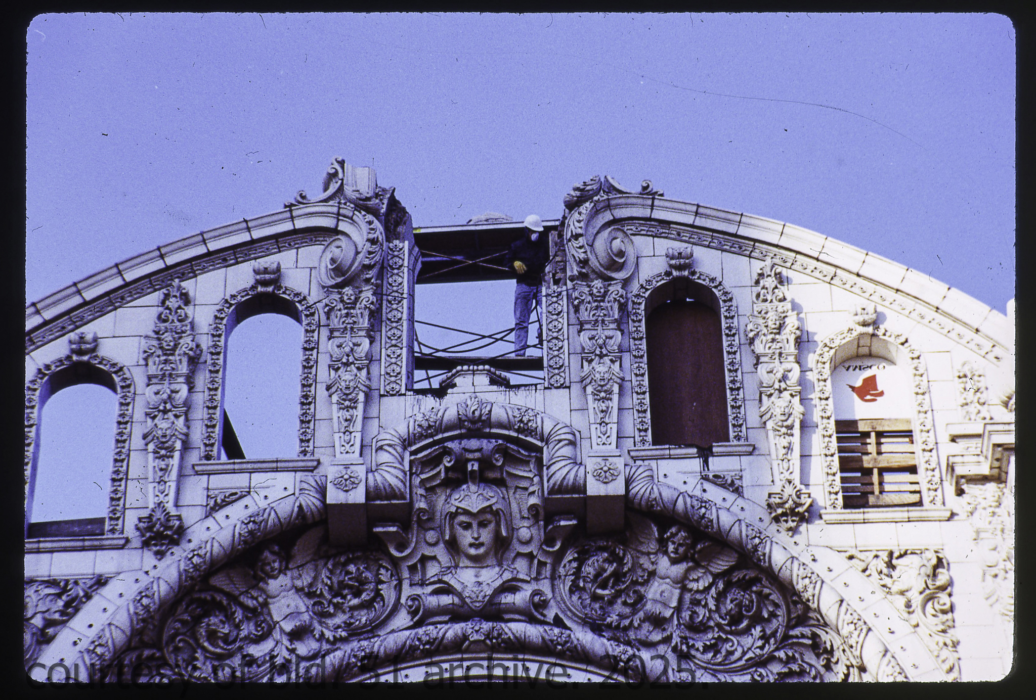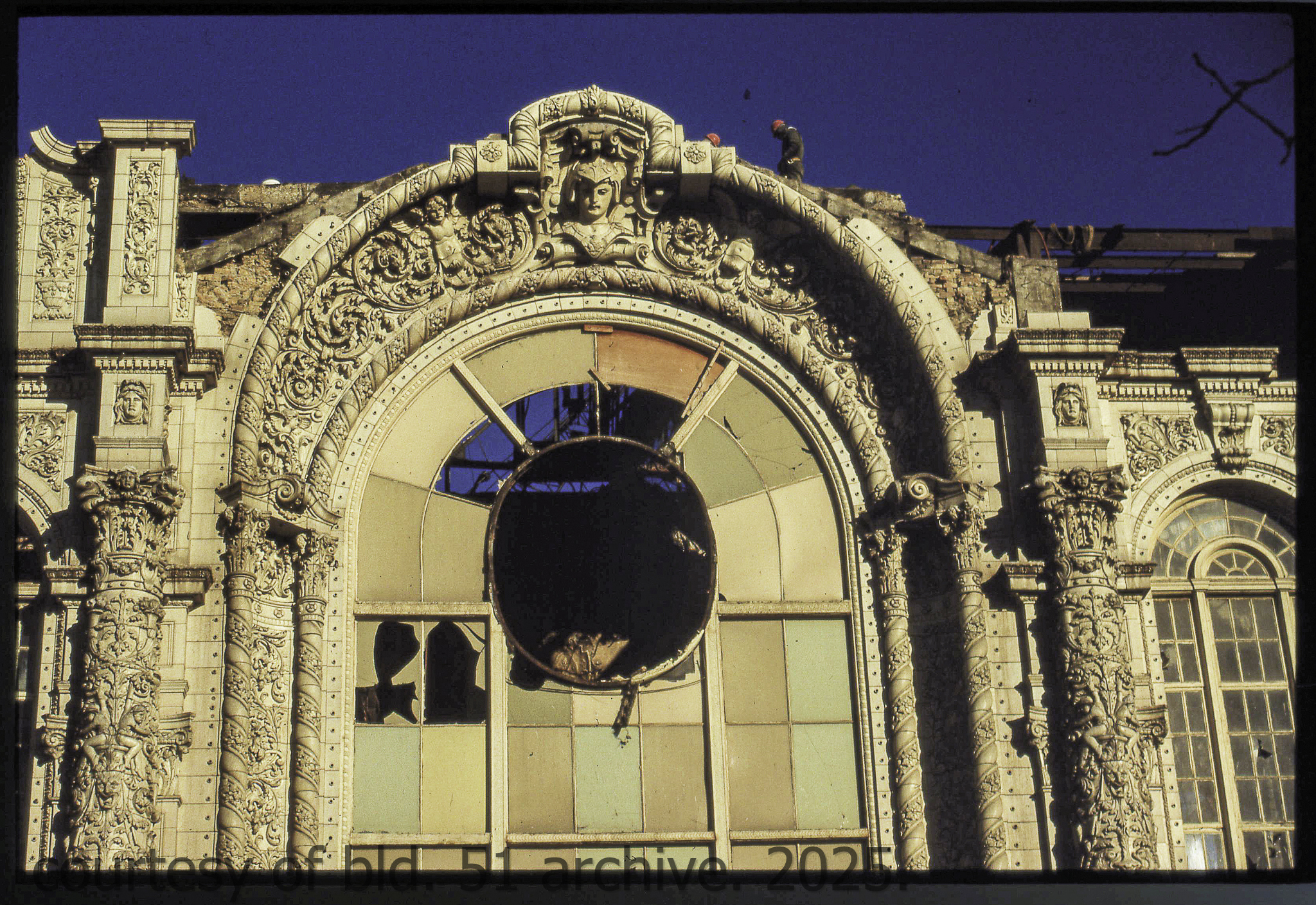 the cream-colored terra cotta facade was salvaged by dave felling of felling contracting, st. louis, mo. during its demolition in 1990 by the g.m. wrecking company, chicago, il.