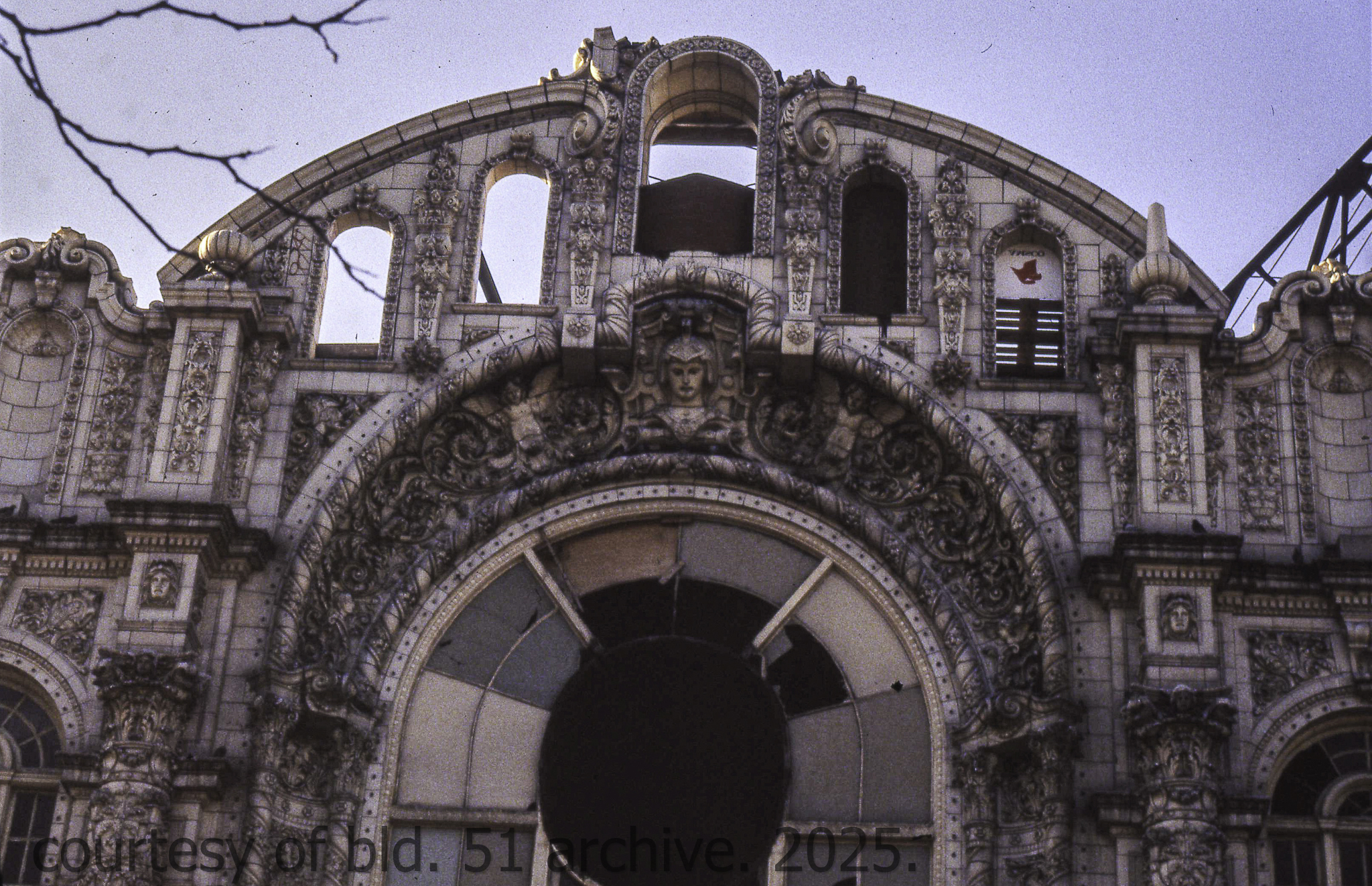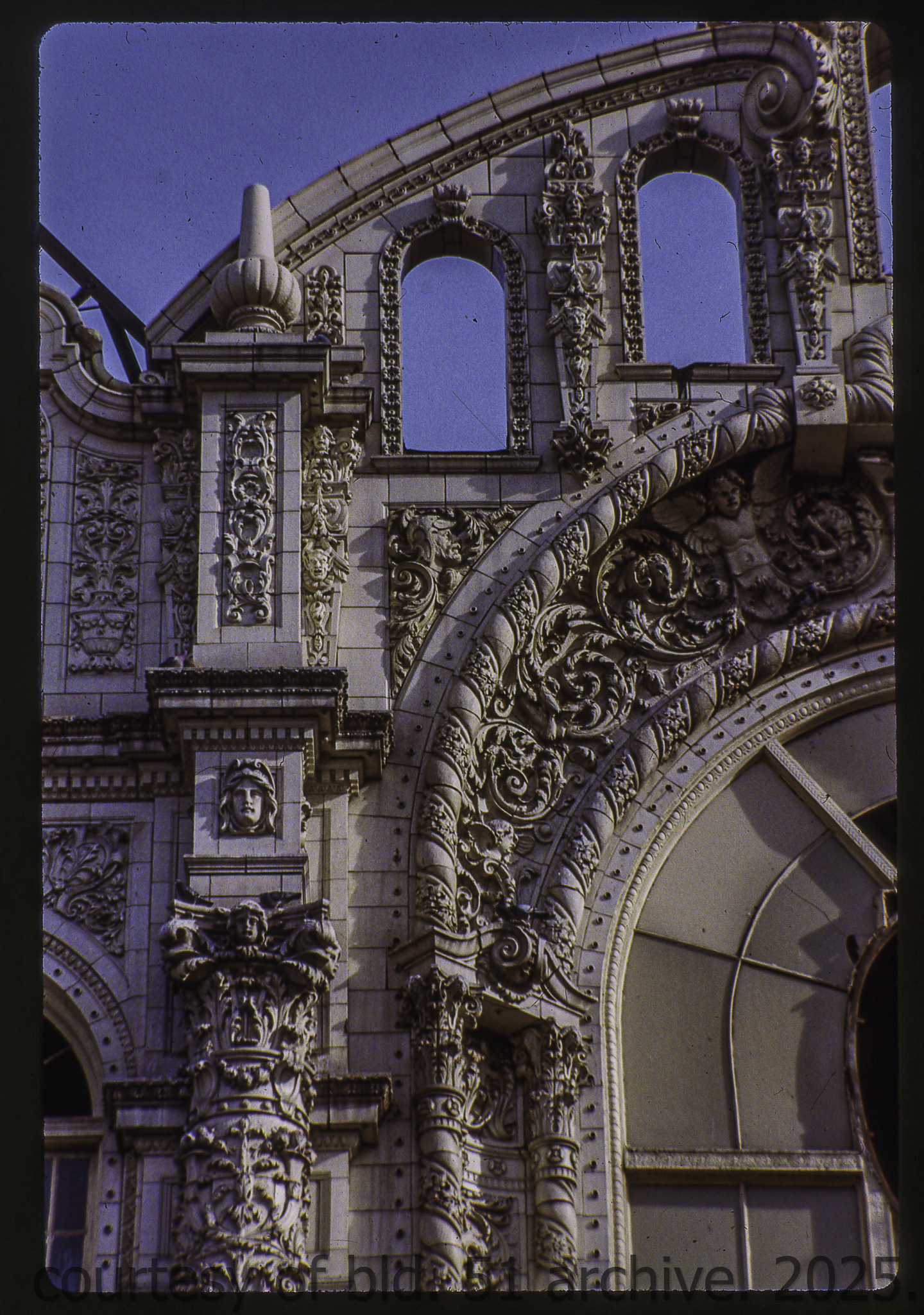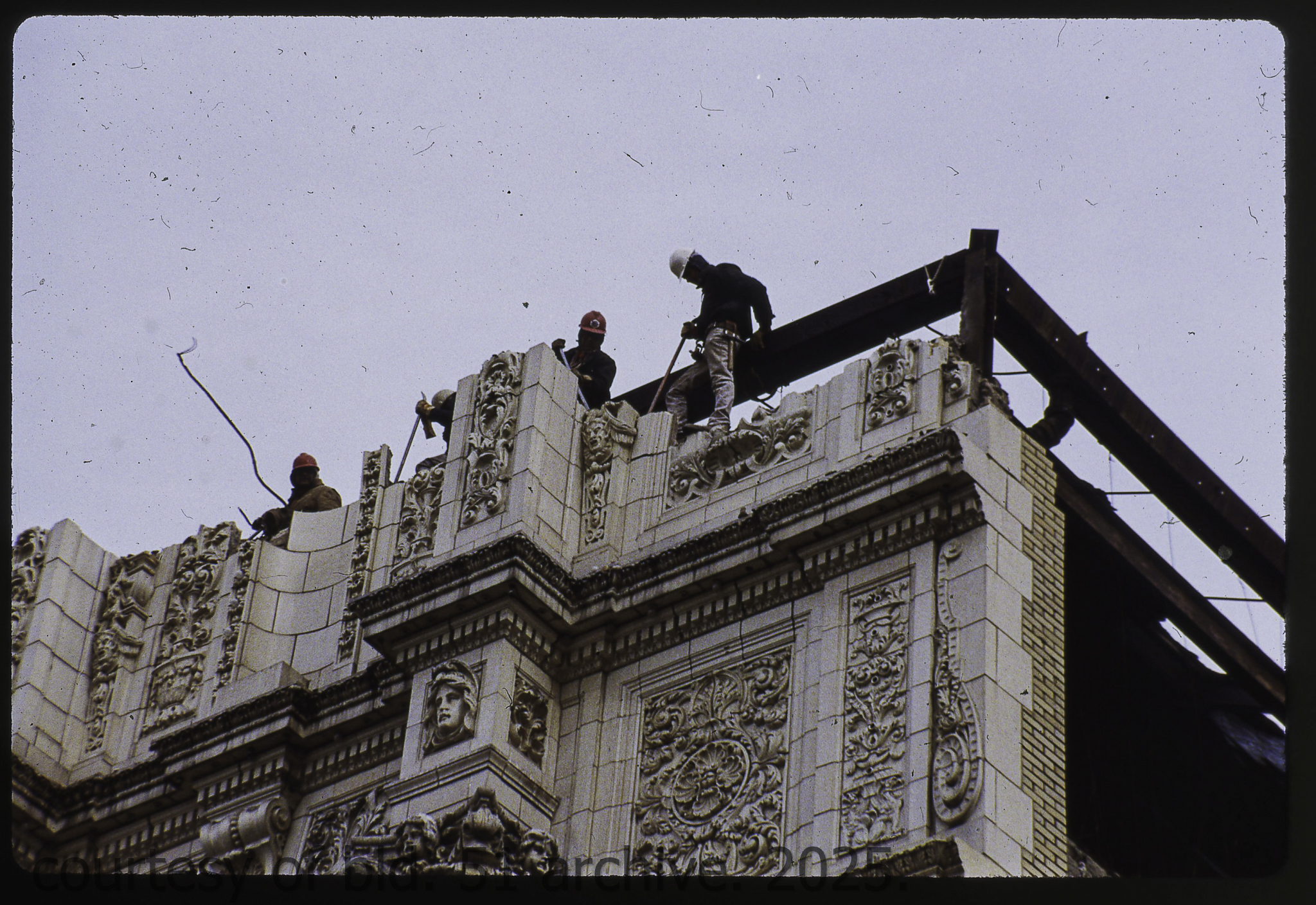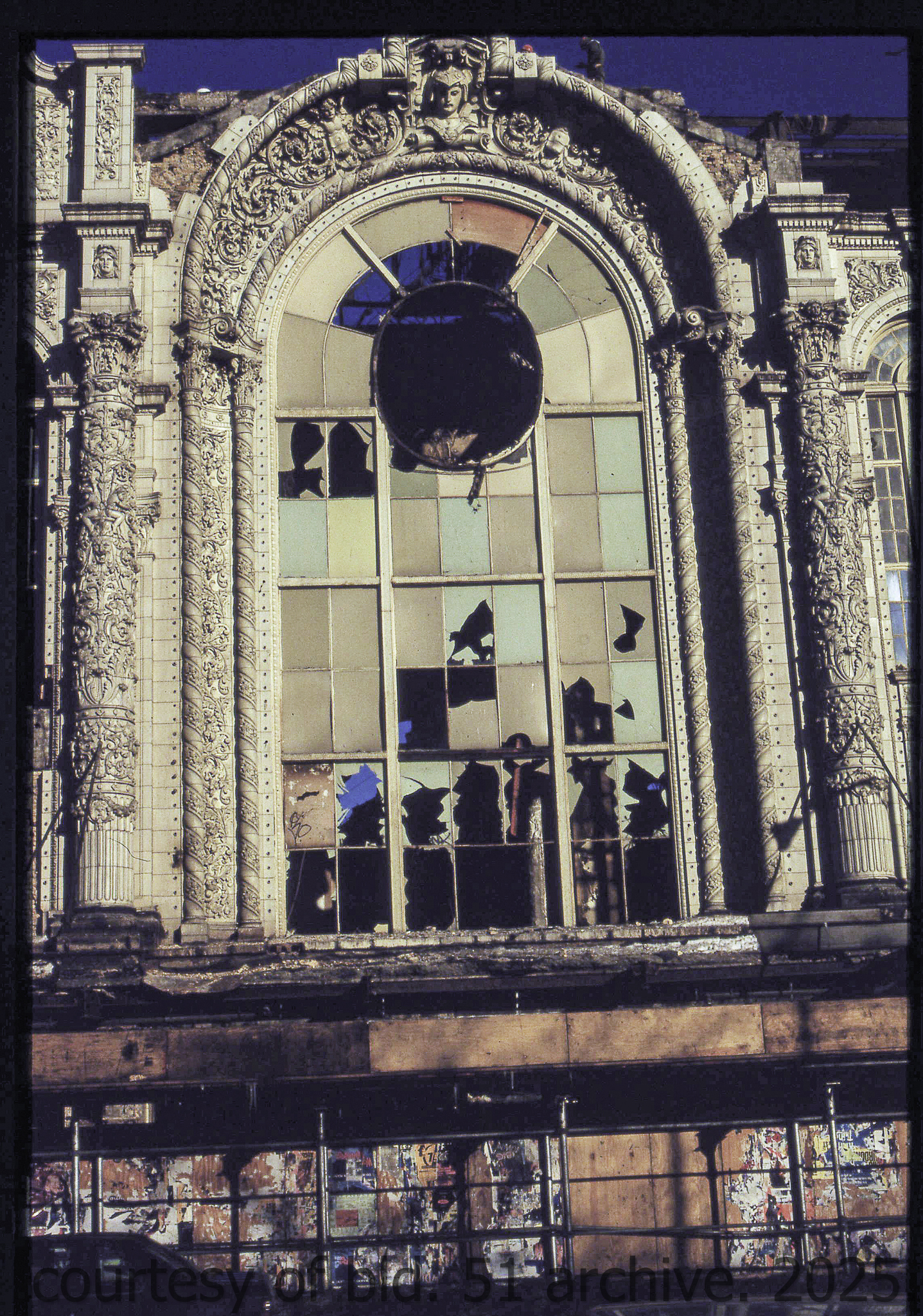 the cream-colored terra cotta facade was salvaged by dave felling of felling contracting, st. louis, mo. during its demolition in 1990 by the g.m. wrecking company, chicago, il.